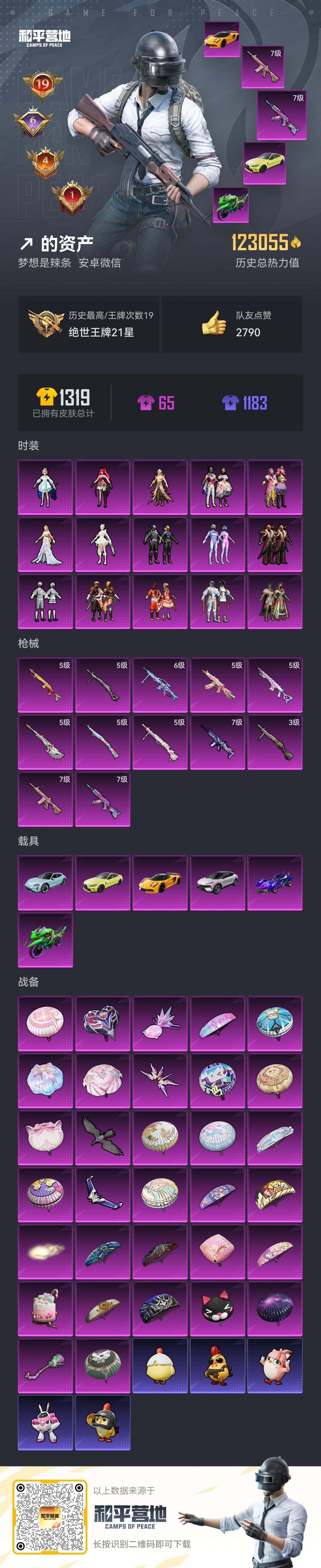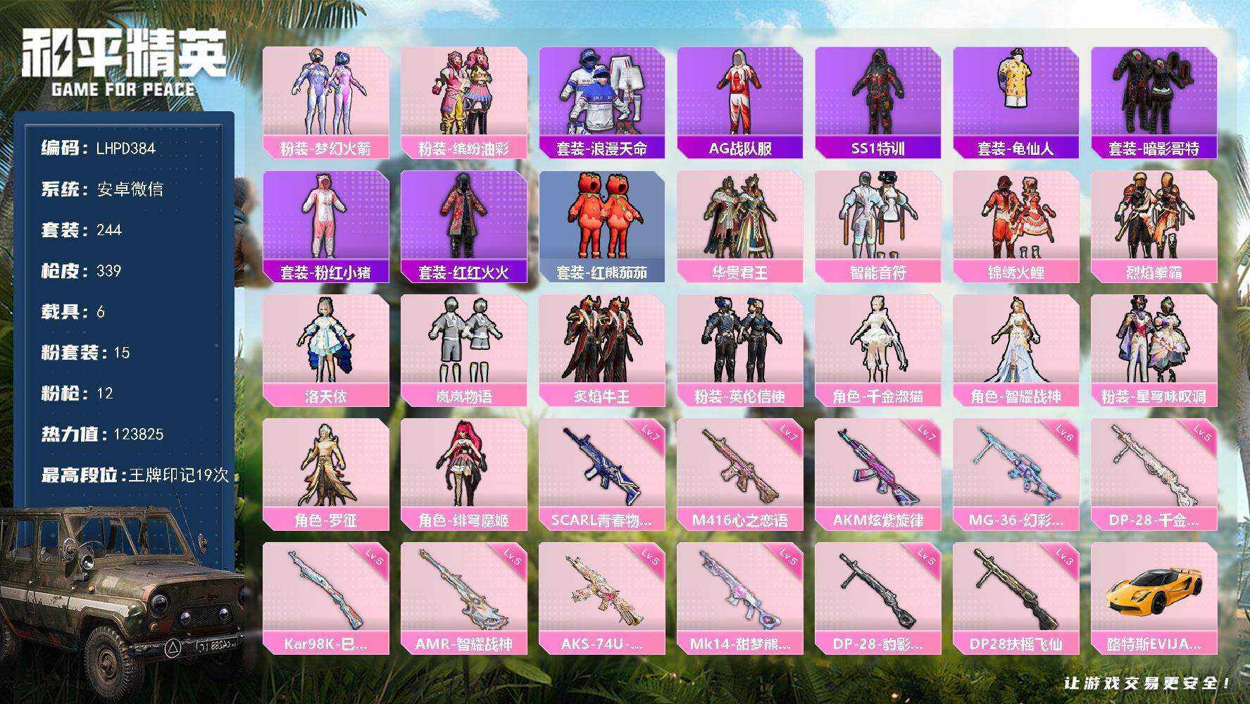 【特价出售/店主推荐】安卓 微信-15粉装-12特效枪-6载具-7粉色飞行器-123825热力值-19王牌印记-244套装-339枪皮【热门品类】:粉装-梦幻火箭,粉装-缤纷油彩,套装-浪漫天命,套装-AG战队服,套装-SS1特训,套装-龟仙人,套装-暗影哥特,套装-粉红小猪,套装-红红火火,套装-红熊茄茄【粉色套装】:粉装-梦幻火箭,粉装-华贵君王,粉装-智能音符,粉装-缤纷油彩,粉装-锦绣火