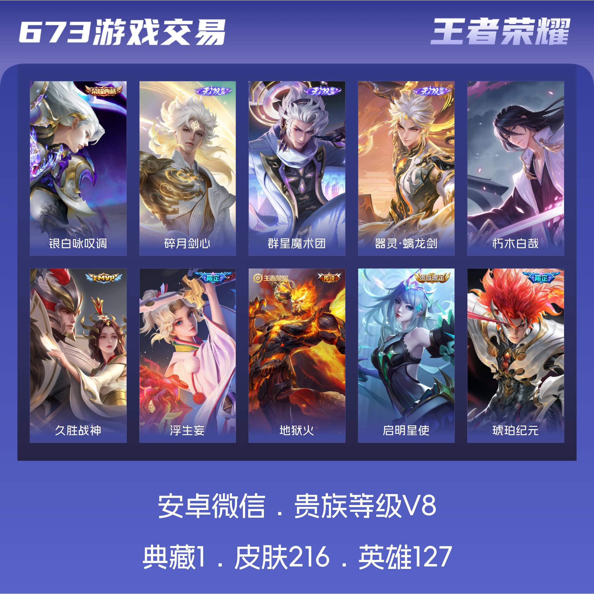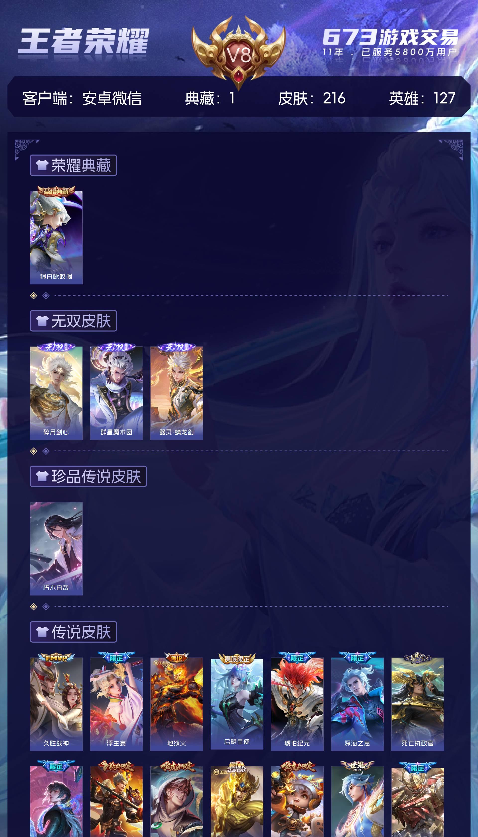 V8 皮肤216 英雄127 无双王者 荣耀典藏1 无双皮肤3 珍品传说1 传说19 其他皮肤196