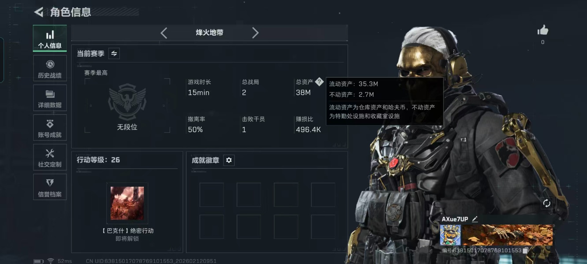 总资产:38M 2干员外观 6传说枪械 哈夫币:20.841K 可二次 可修改实名 无违规