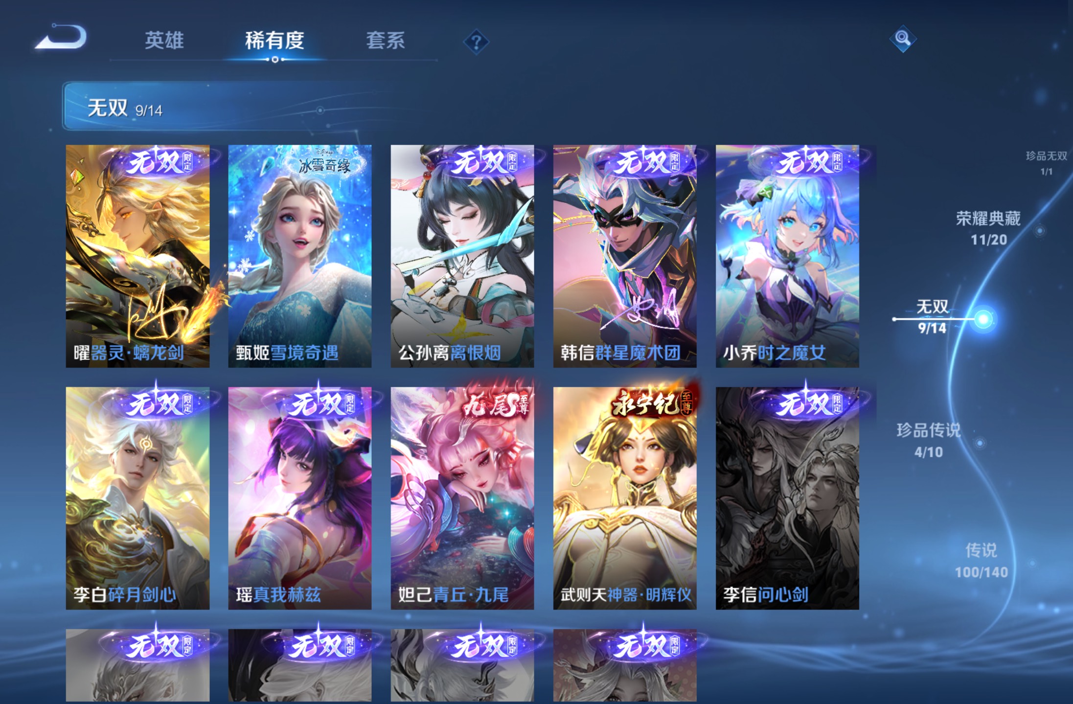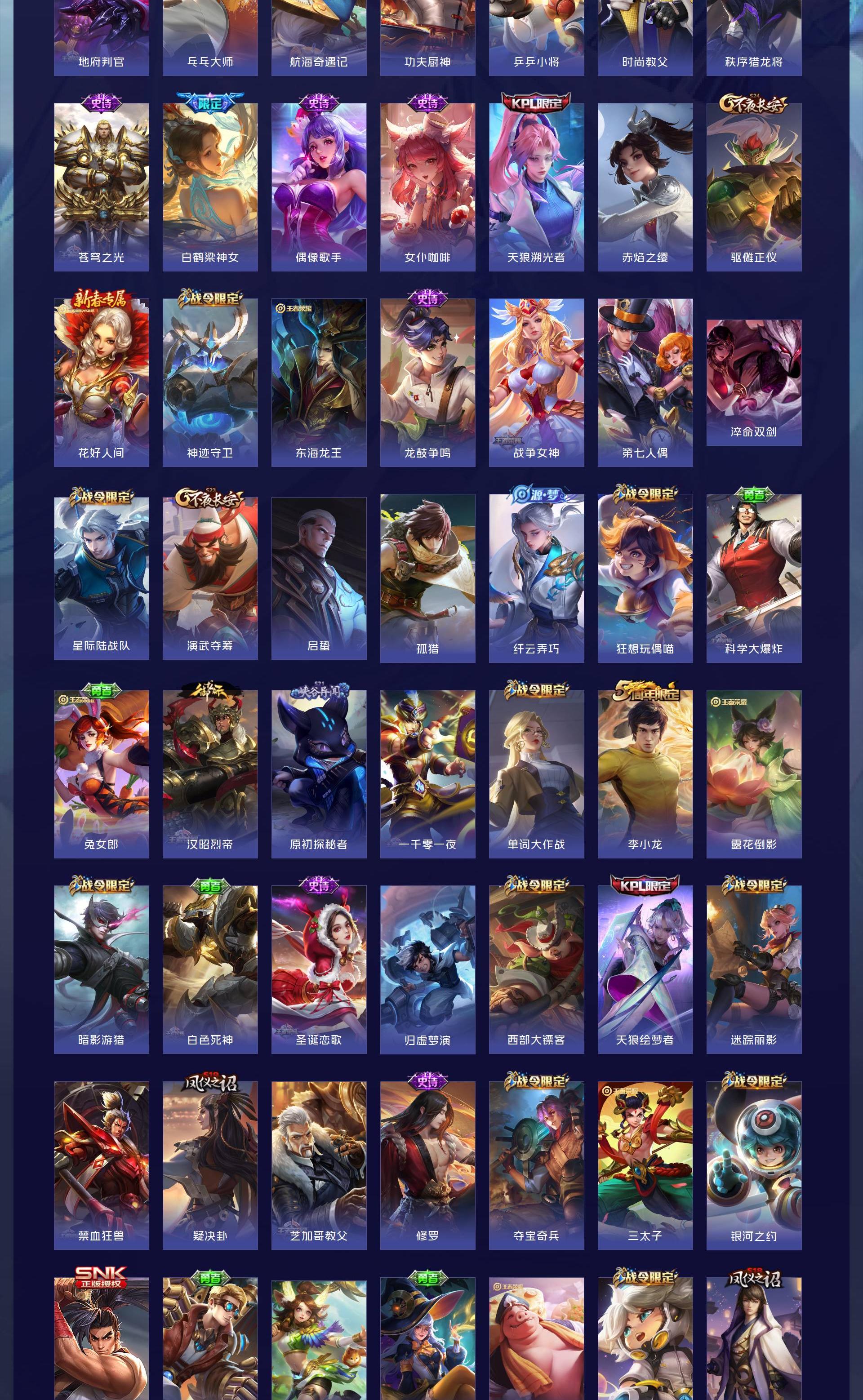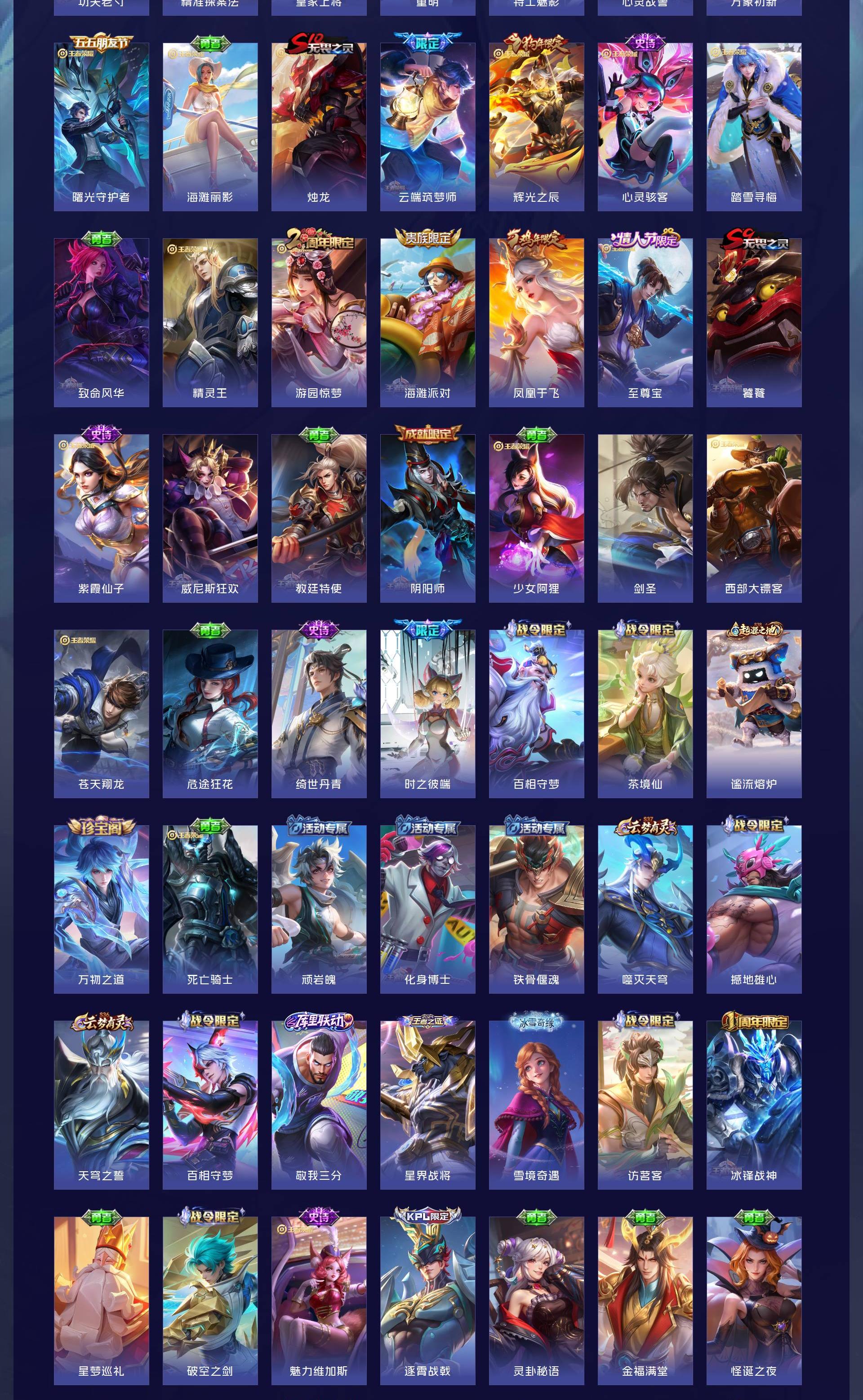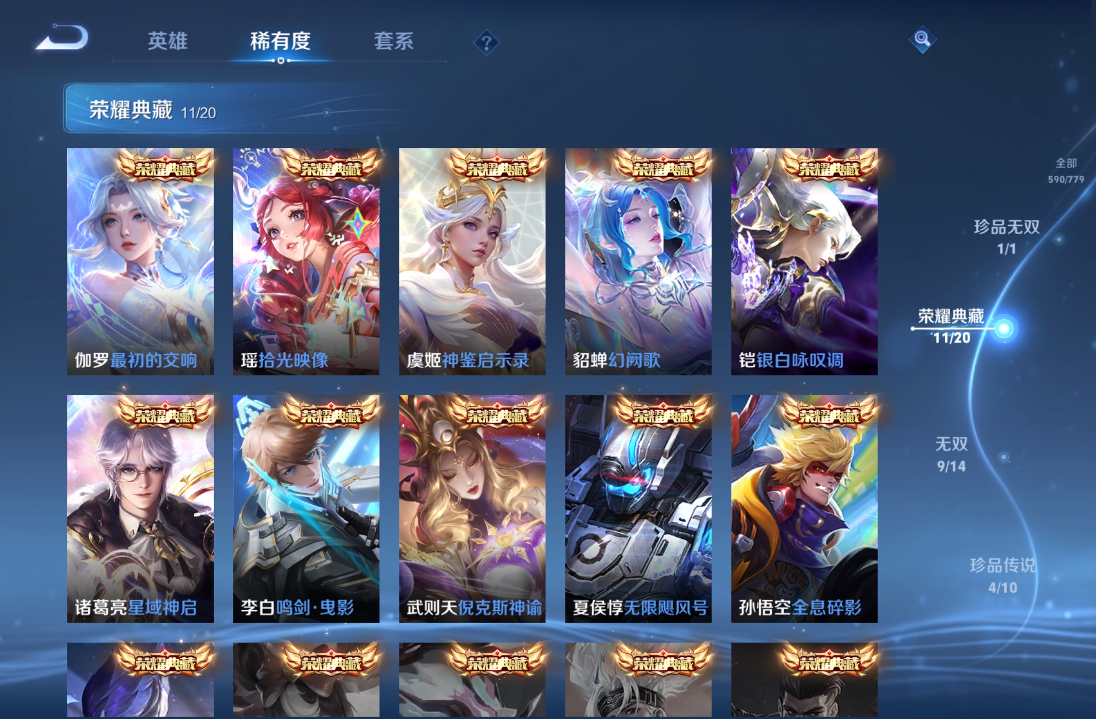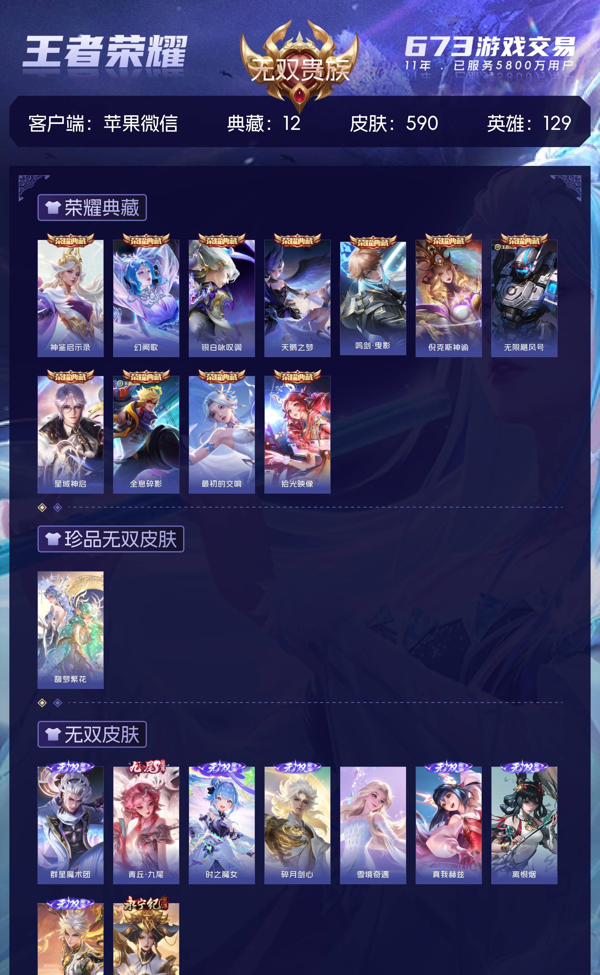 无双贵族 皮肤590 英雄129 绝世王者 荣耀典藏12 珍品无双1 无双皮肤9 珍品传说4 传说99 其他皮肤472