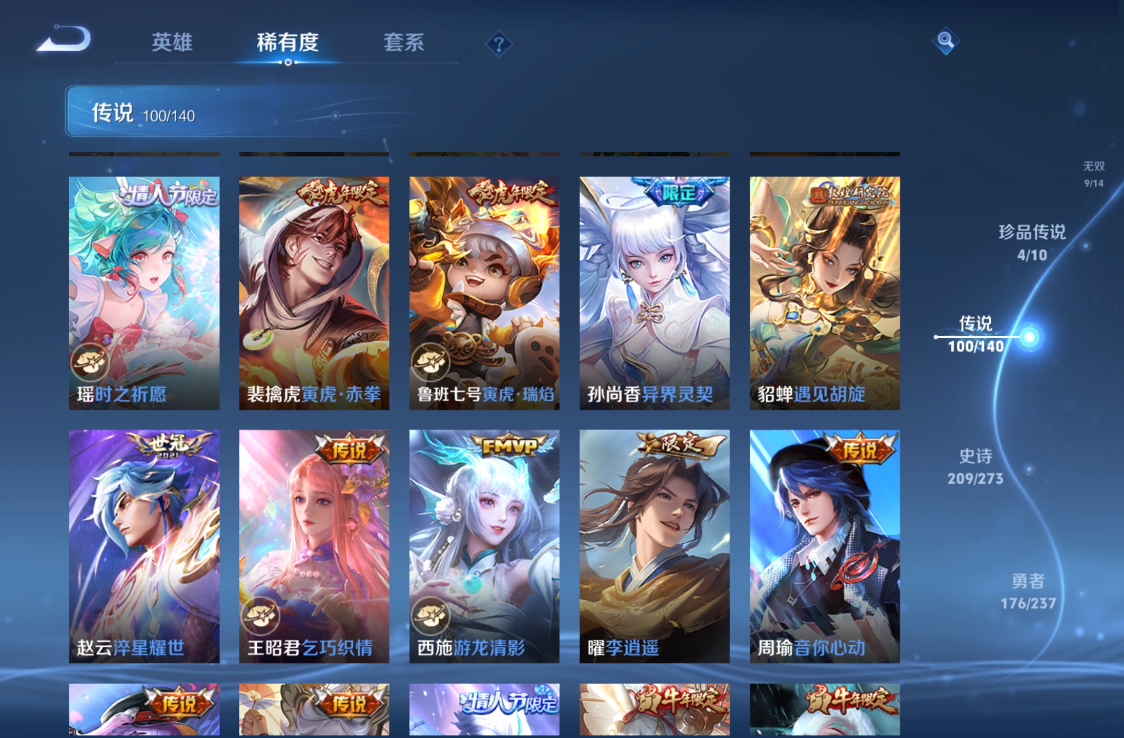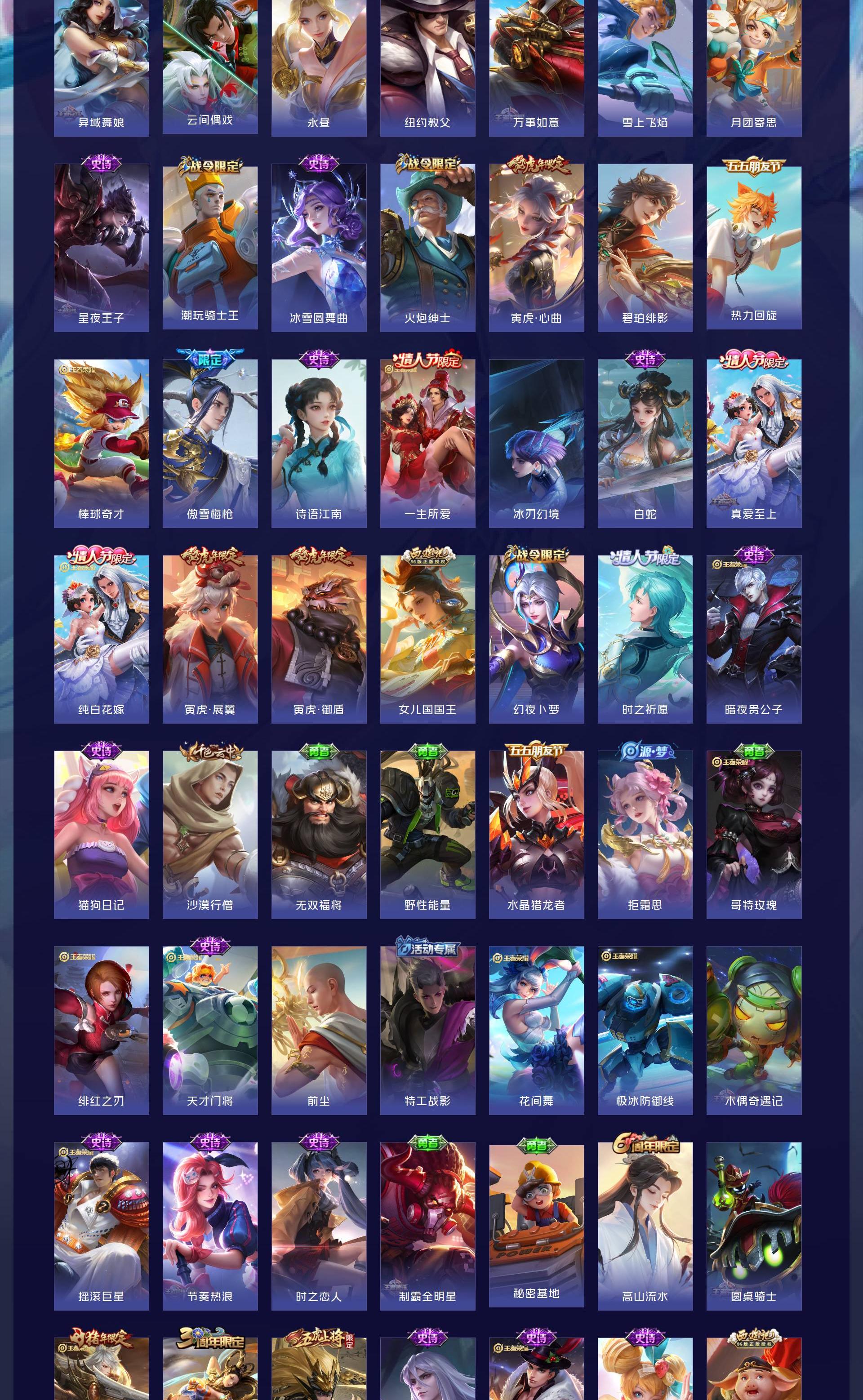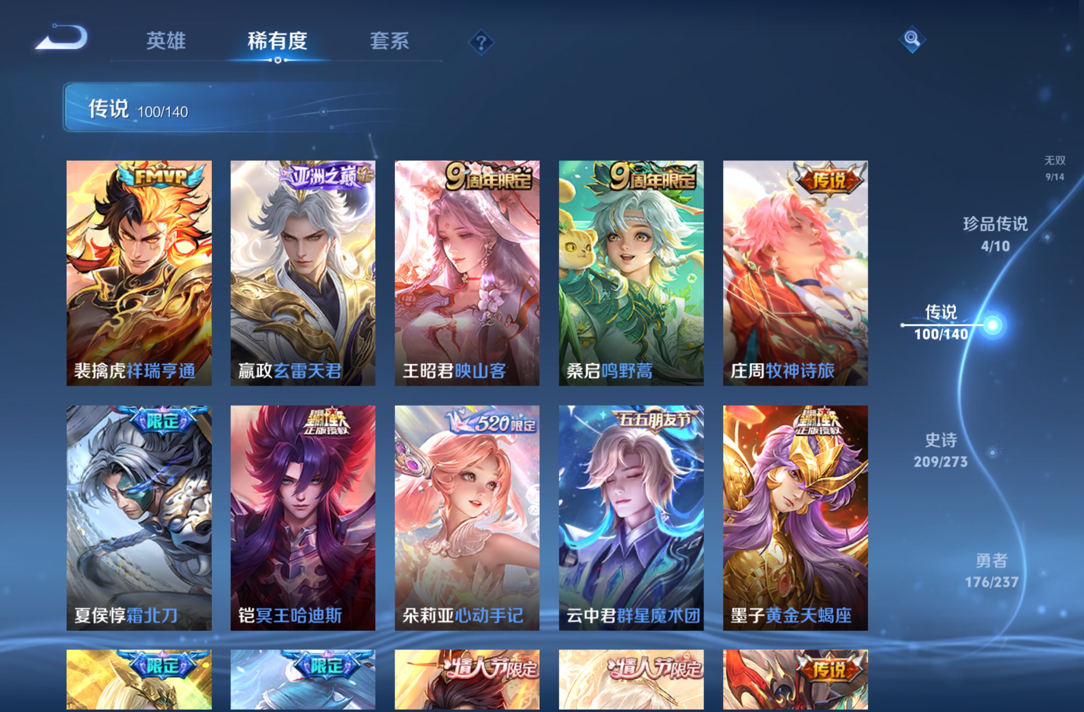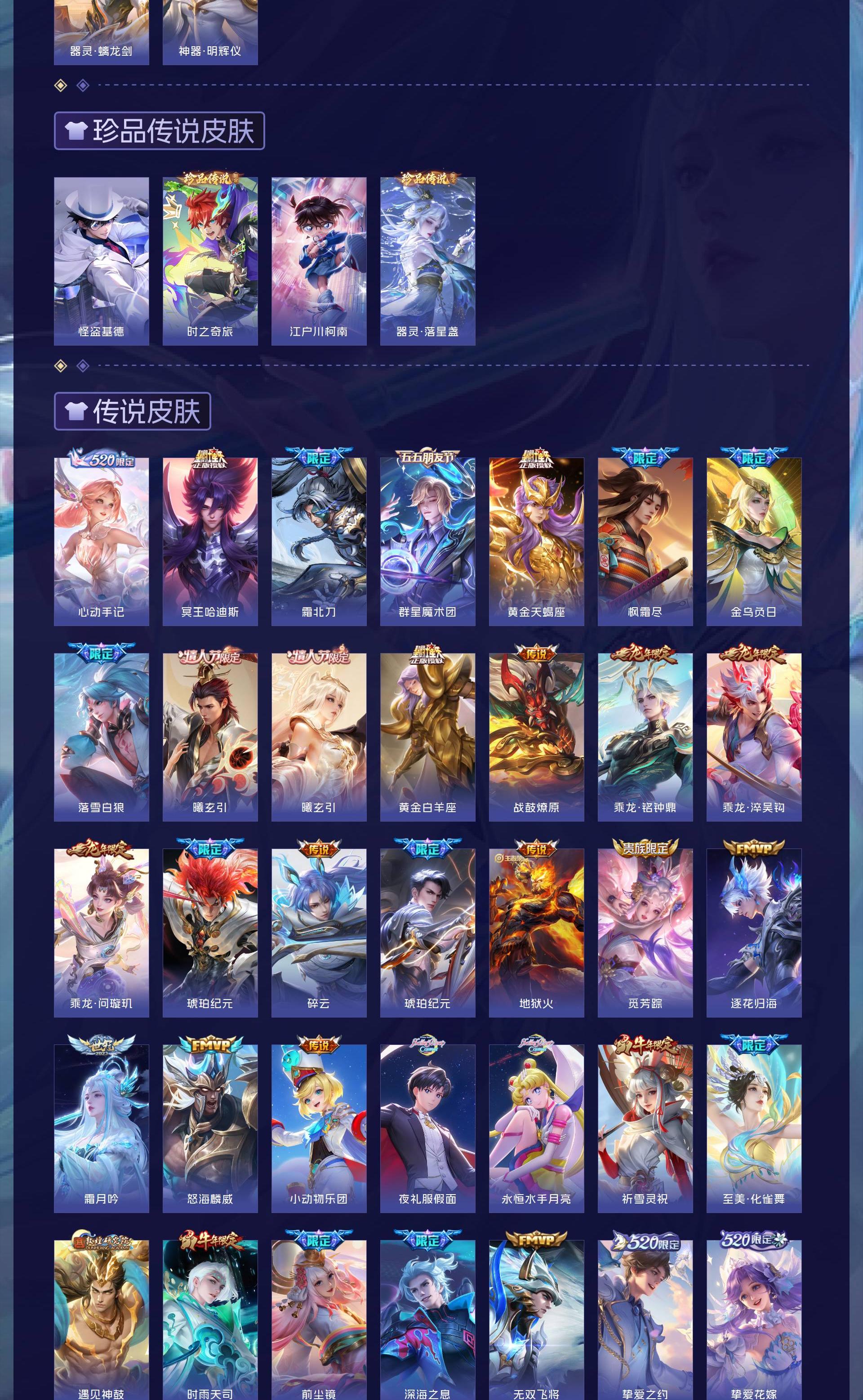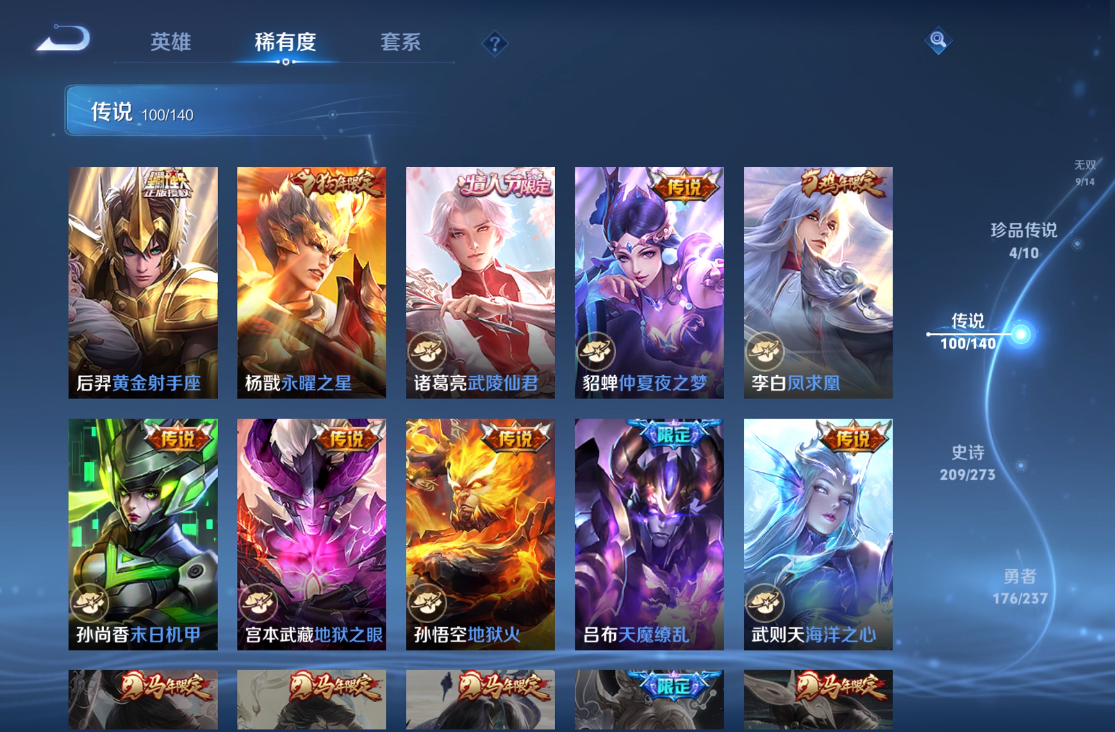 无双贵族 皮肤590 英雄129 绝世王者 荣耀典藏12 珍品无双1 无双皮肤9 珍品传说4 传说99 其他皮肤472