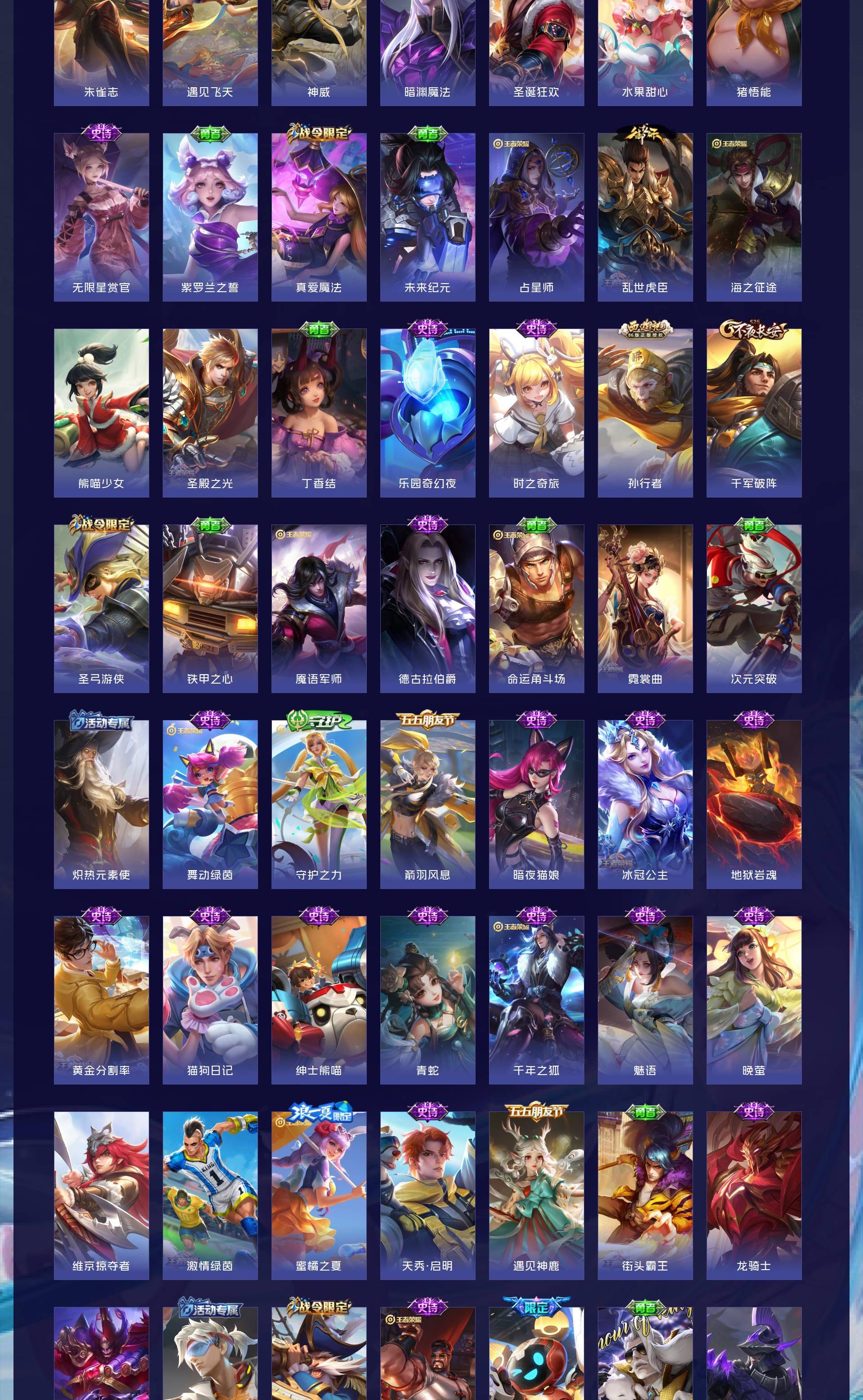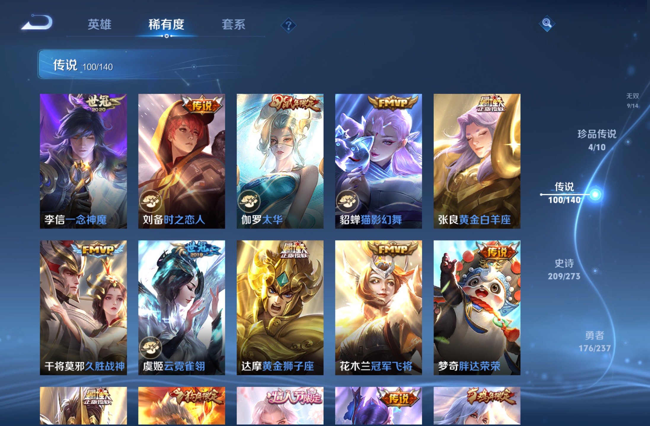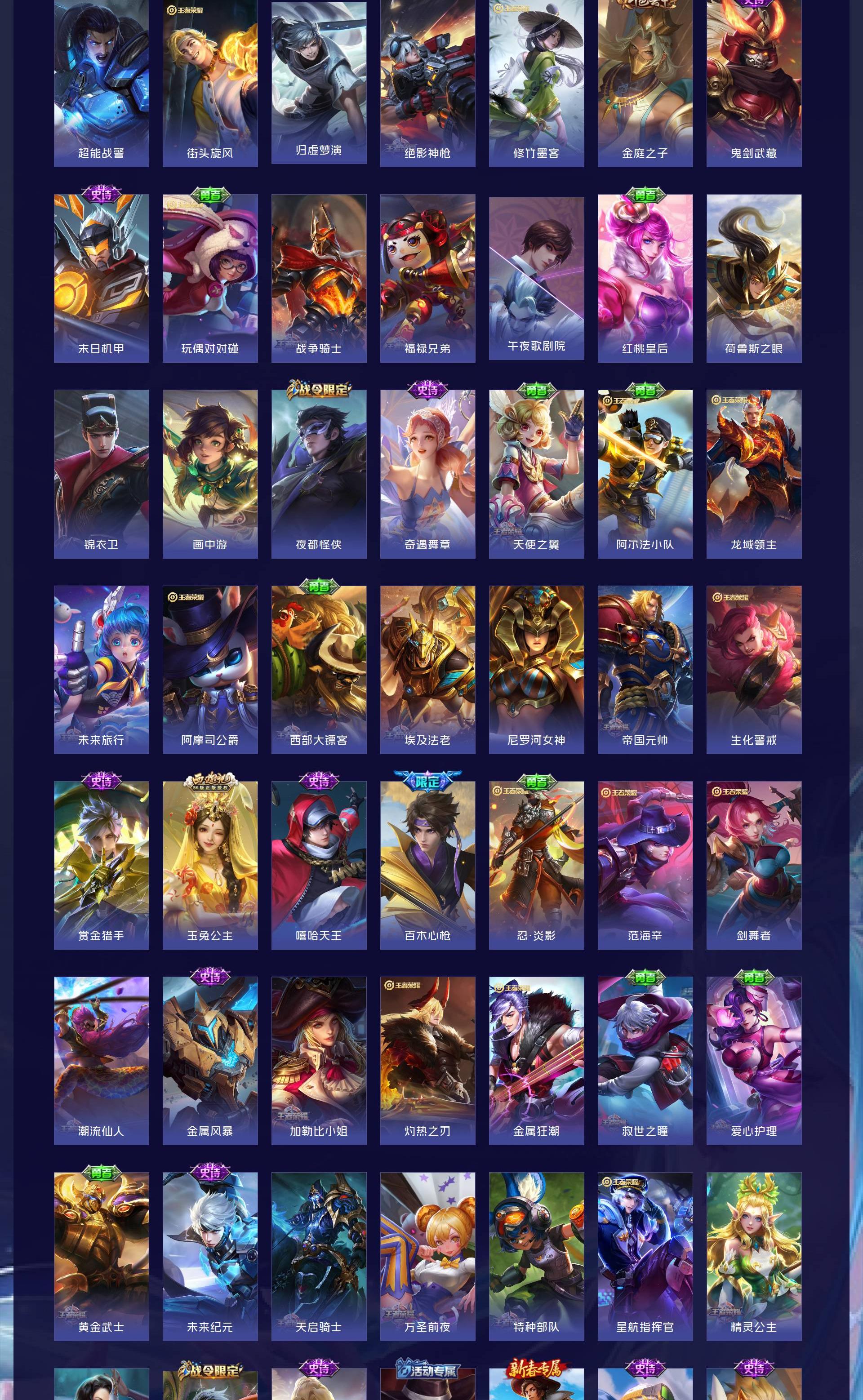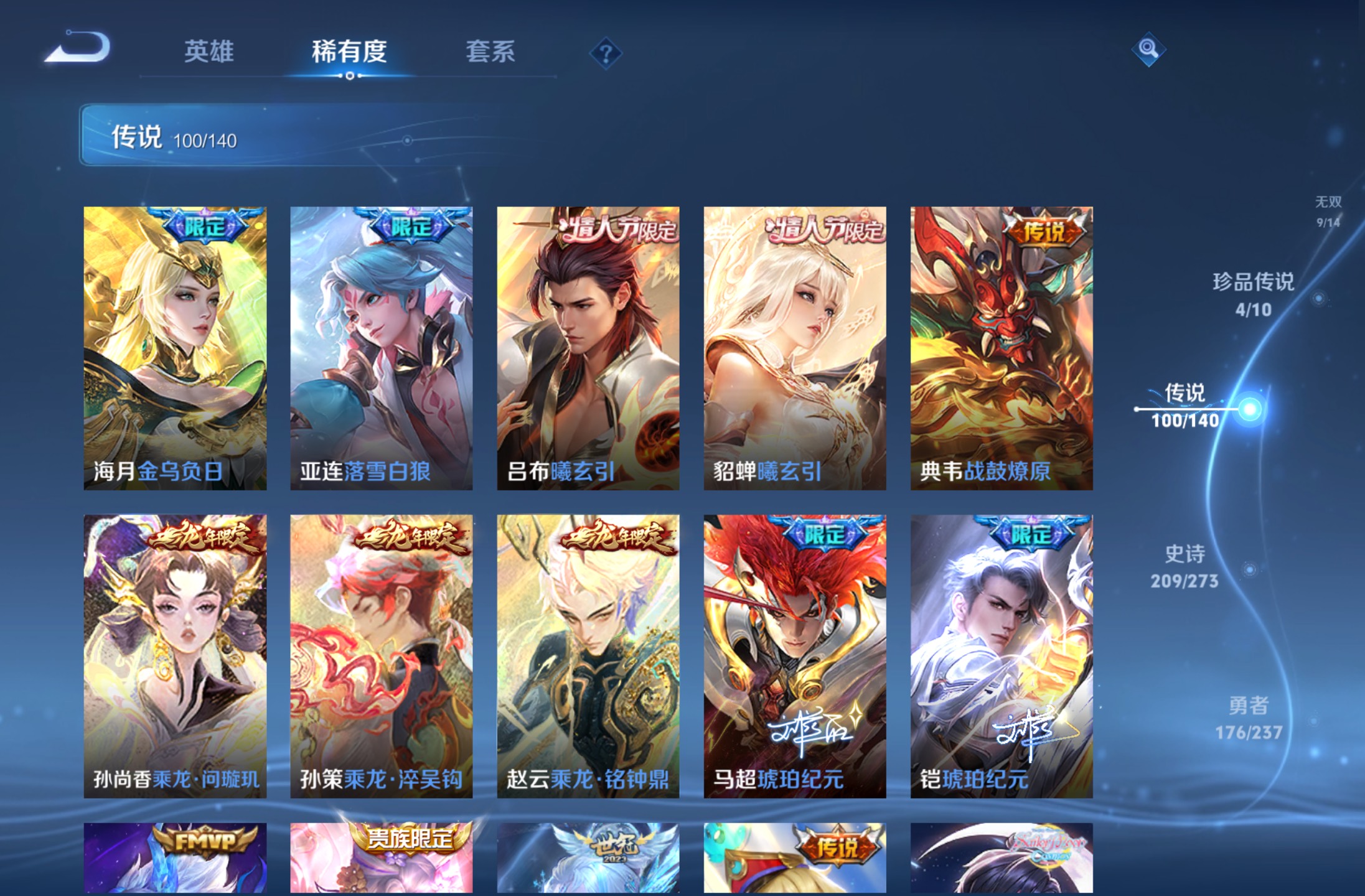 无双贵族 皮肤590 英雄129 绝世王者 荣耀典藏12 珍品无双1 无双皮肤9 珍品传说4 传说99 其他皮肤472