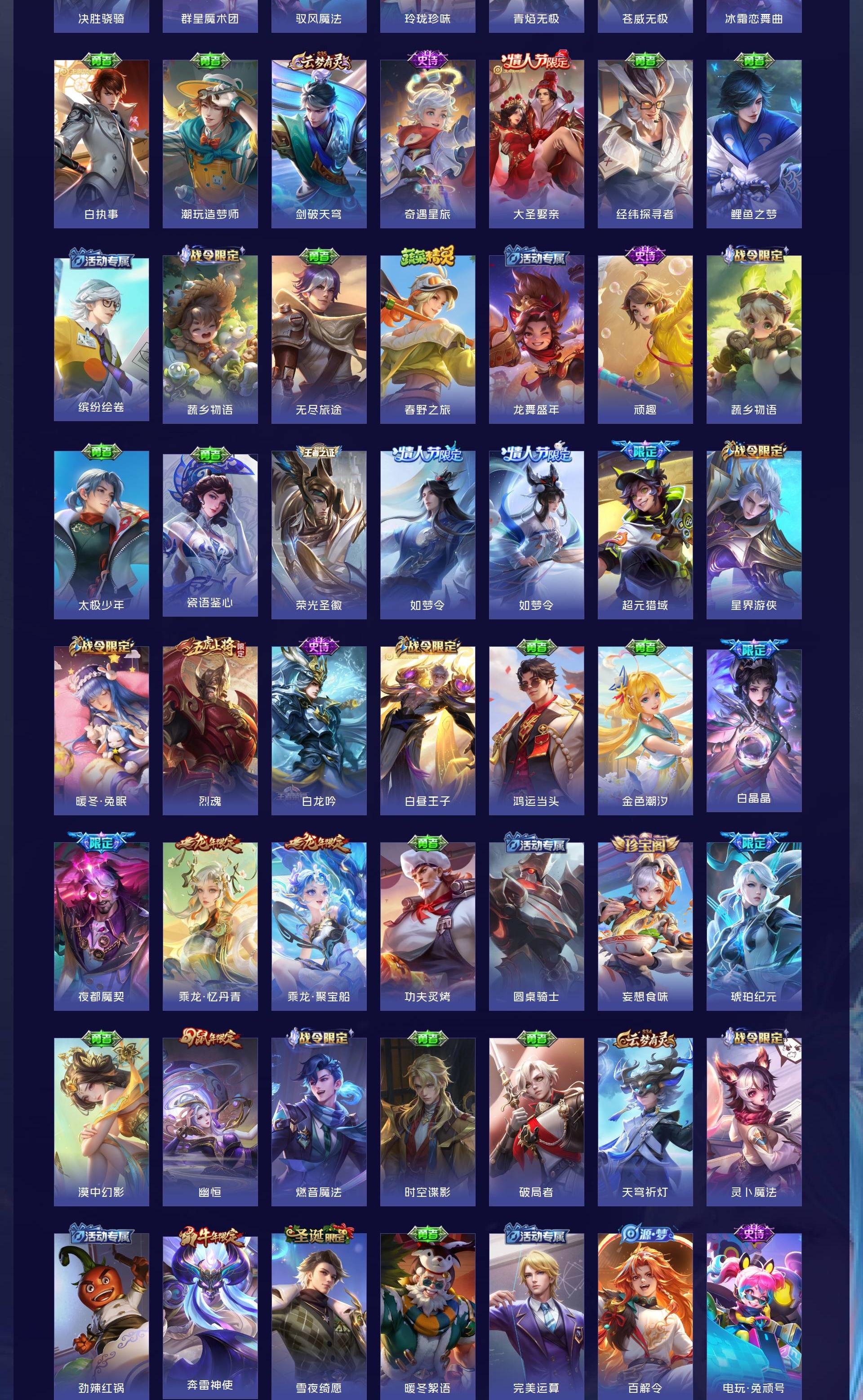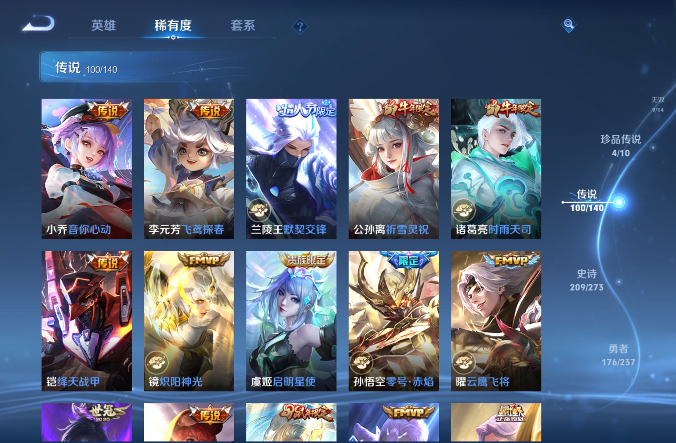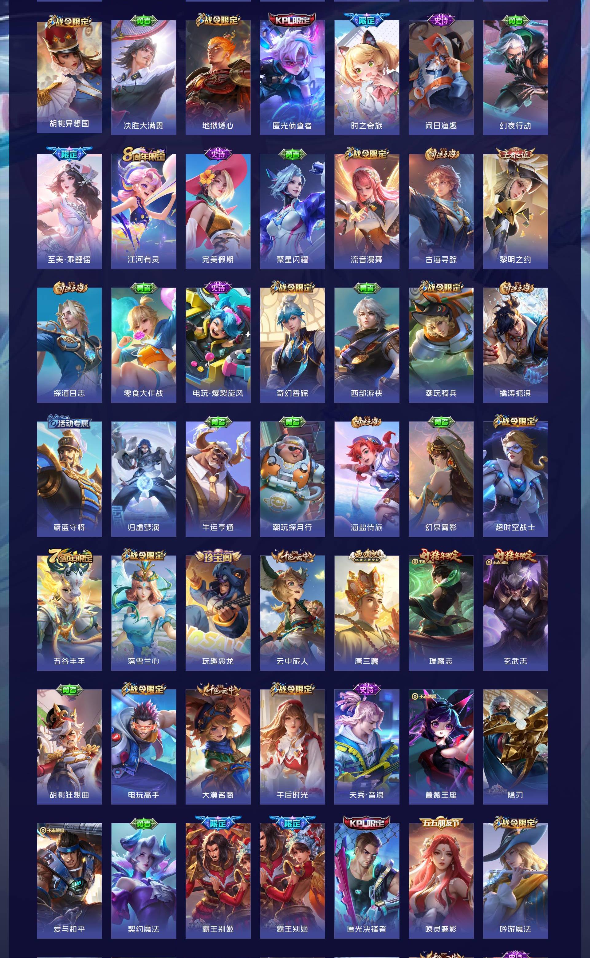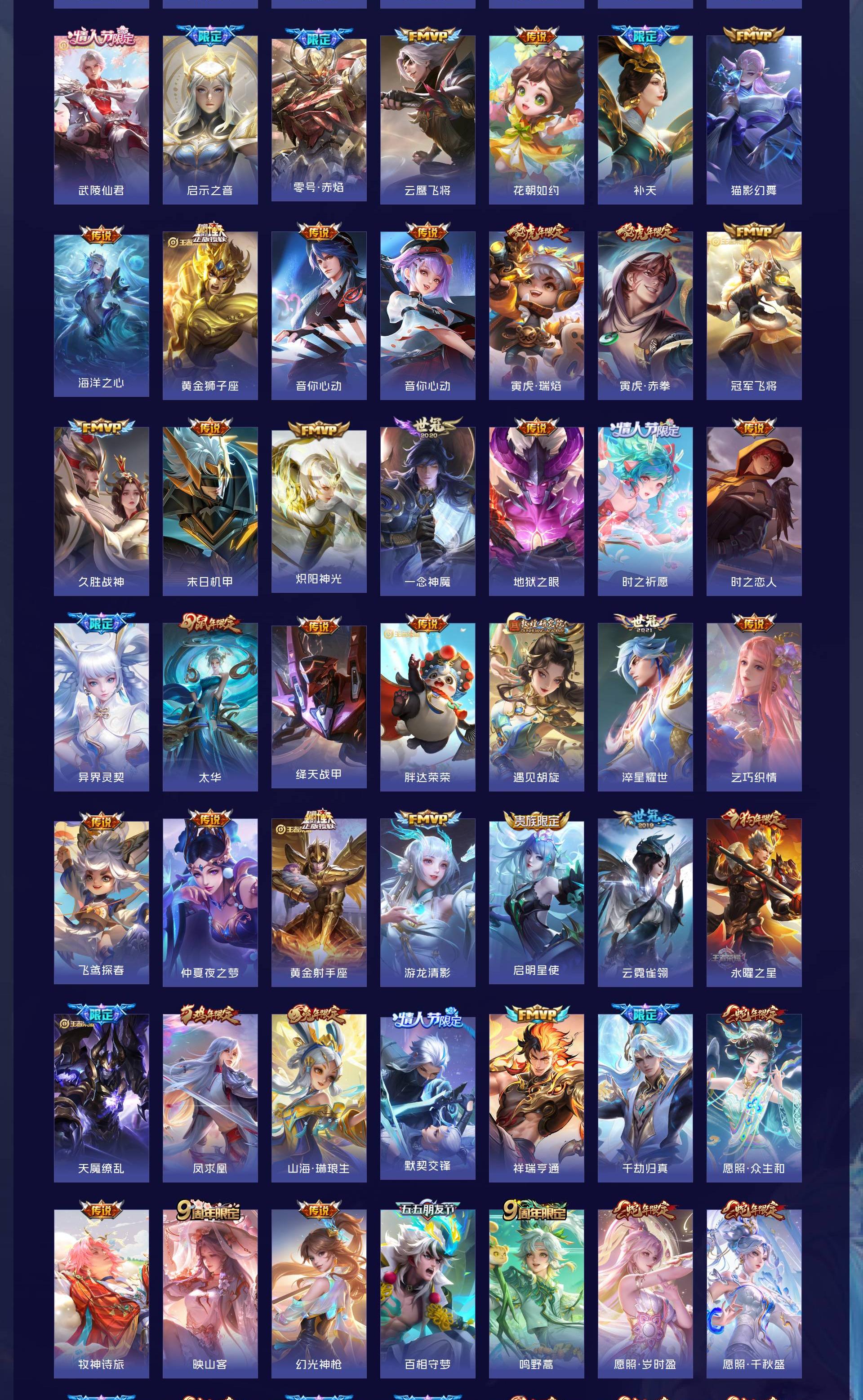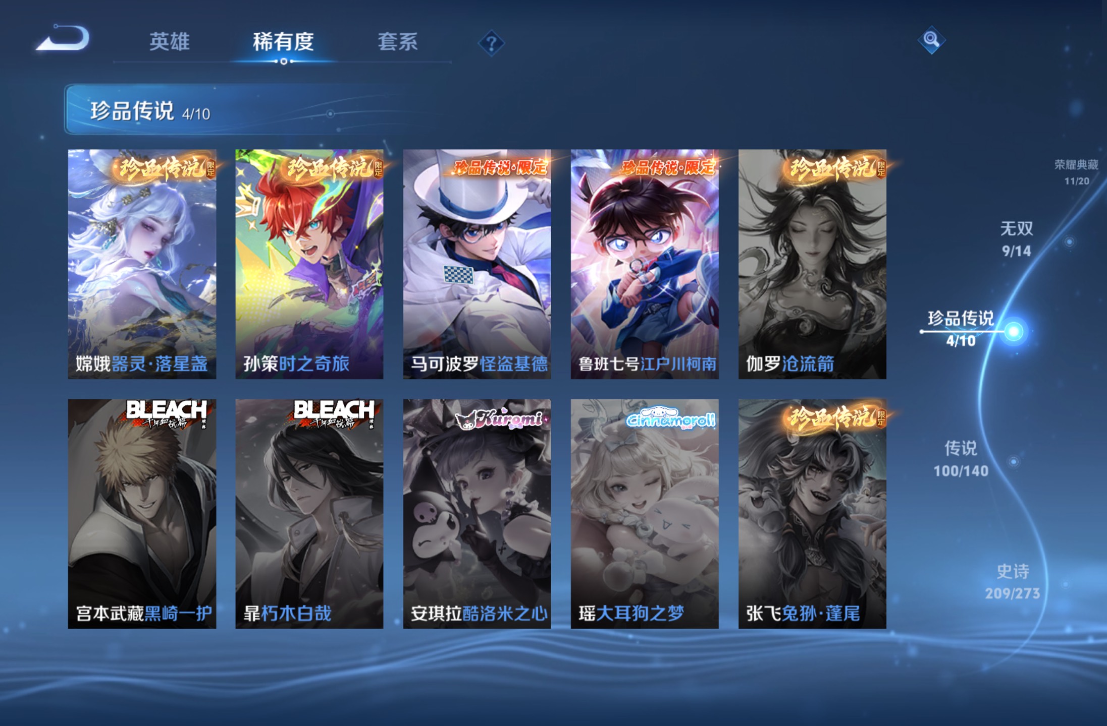 无双贵族 皮肤590 英雄129 绝世王者 荣耀典藏12 珍品无双1 无双皮肤9 珍品传说4 传说99 其他皮肤472