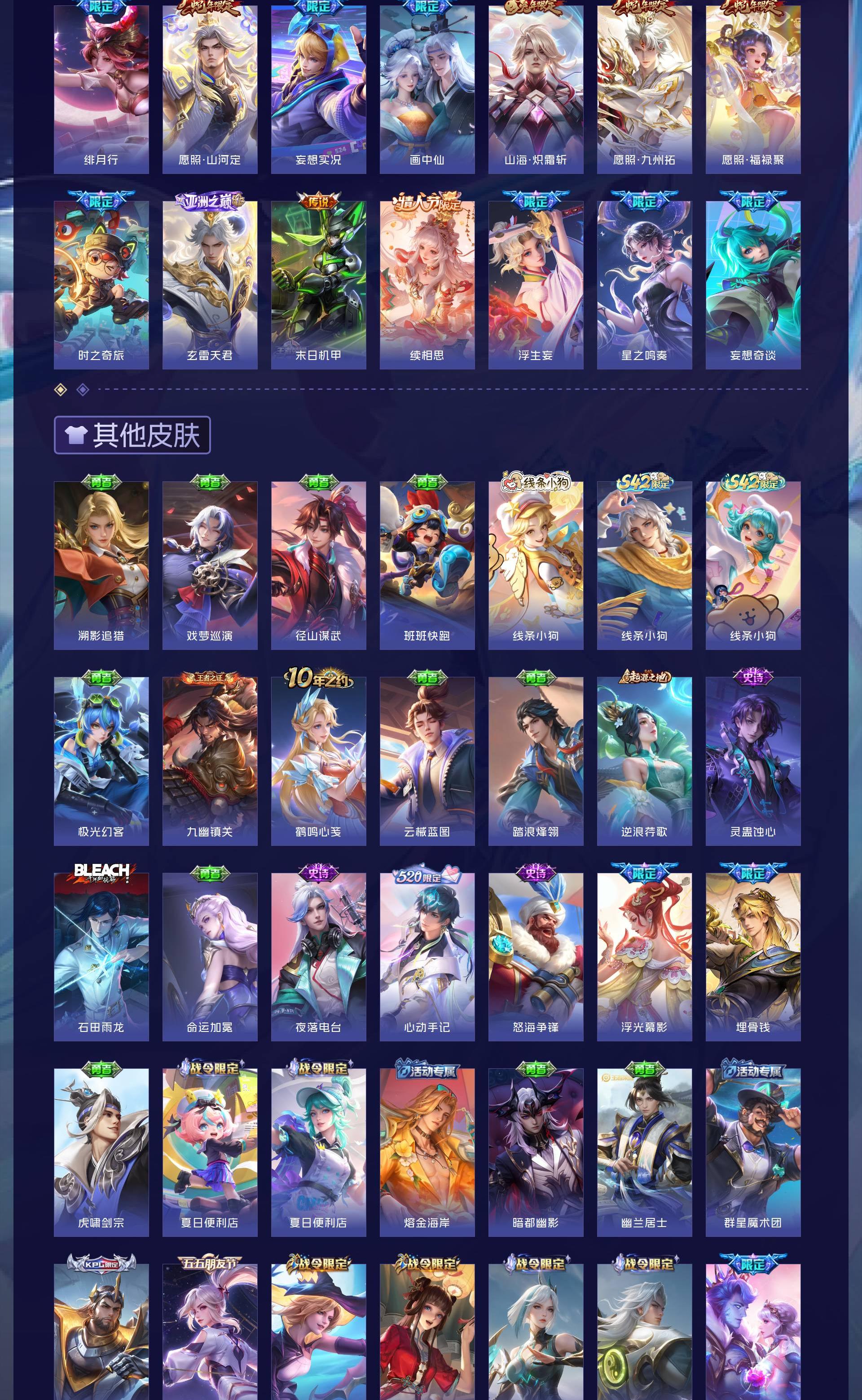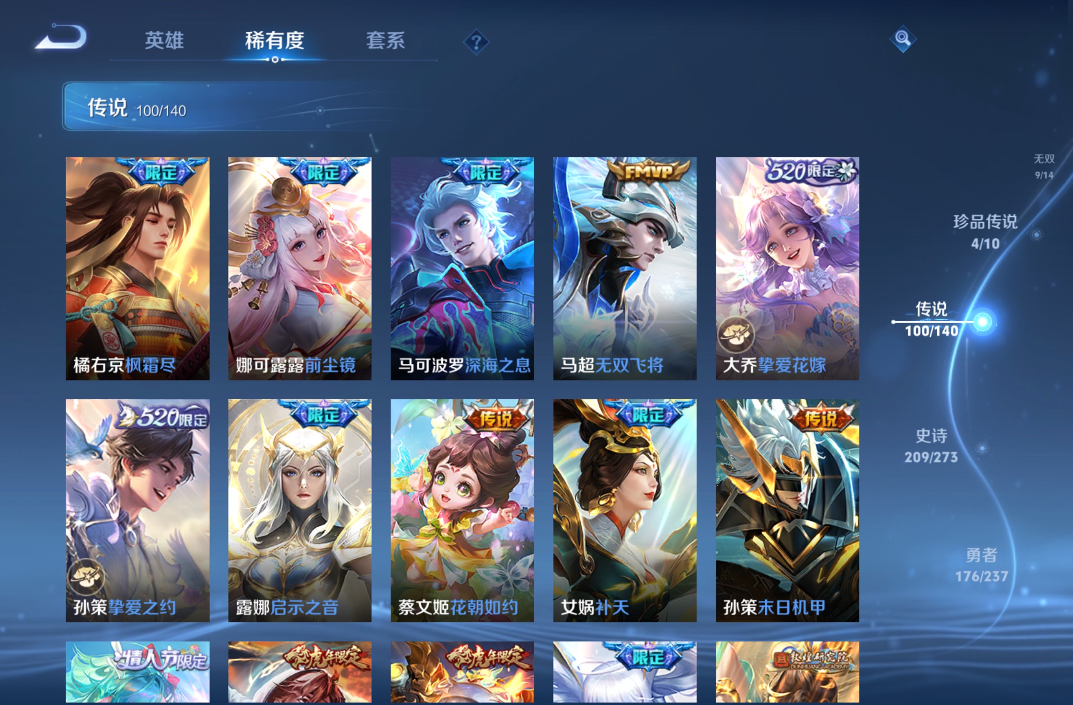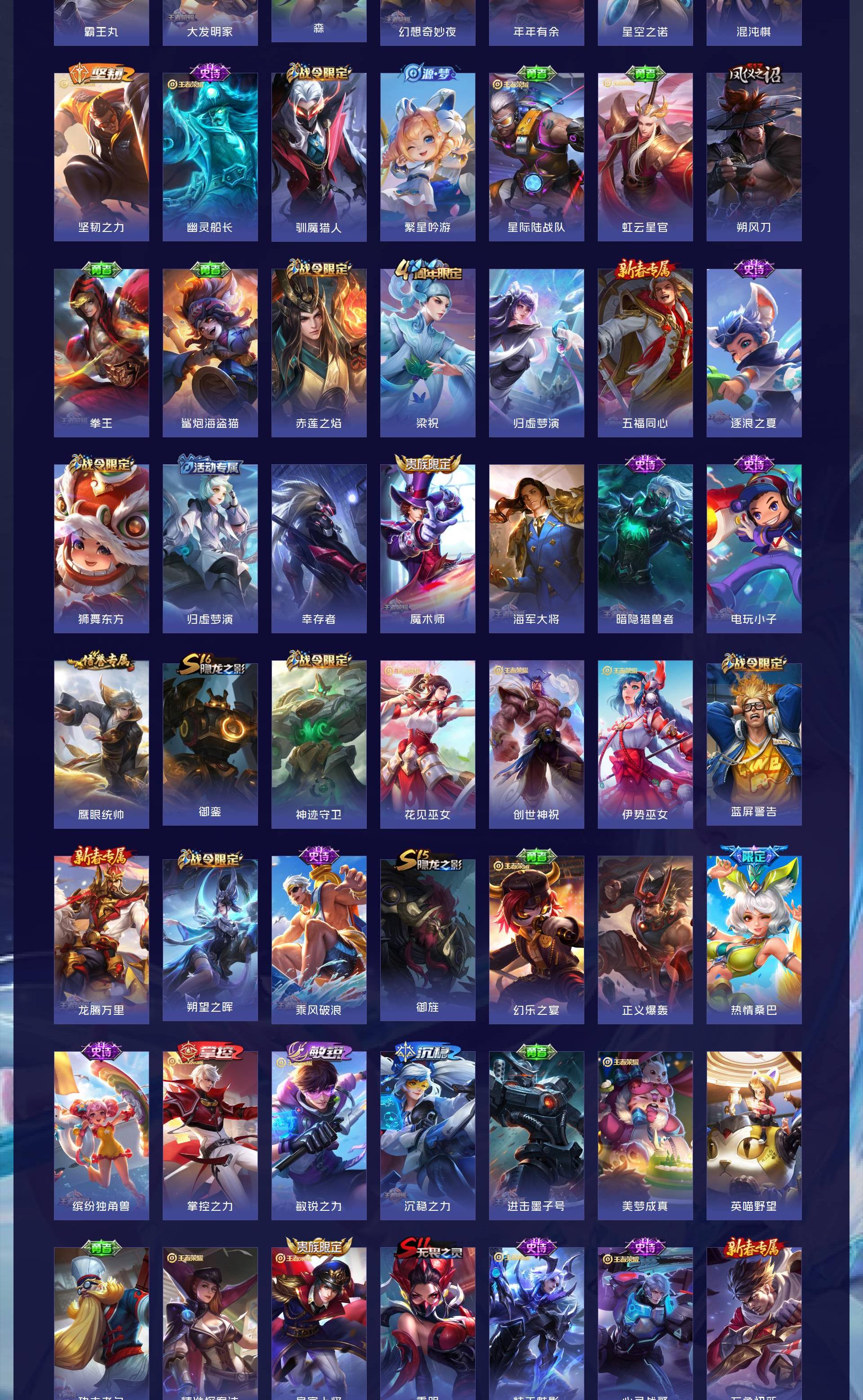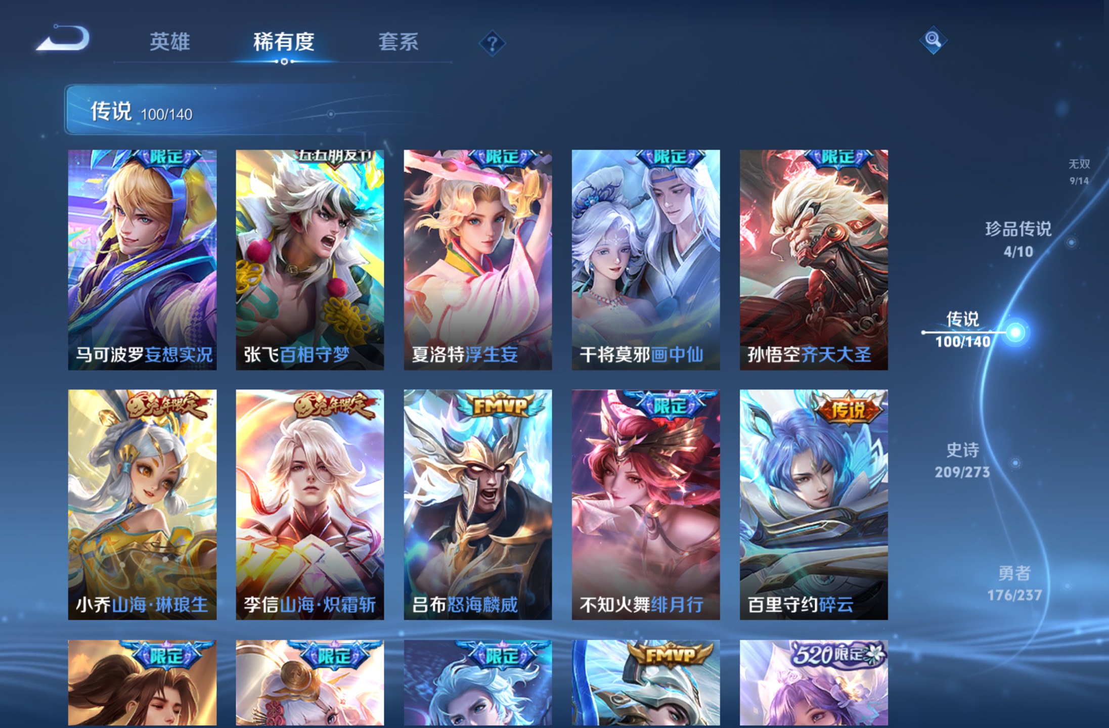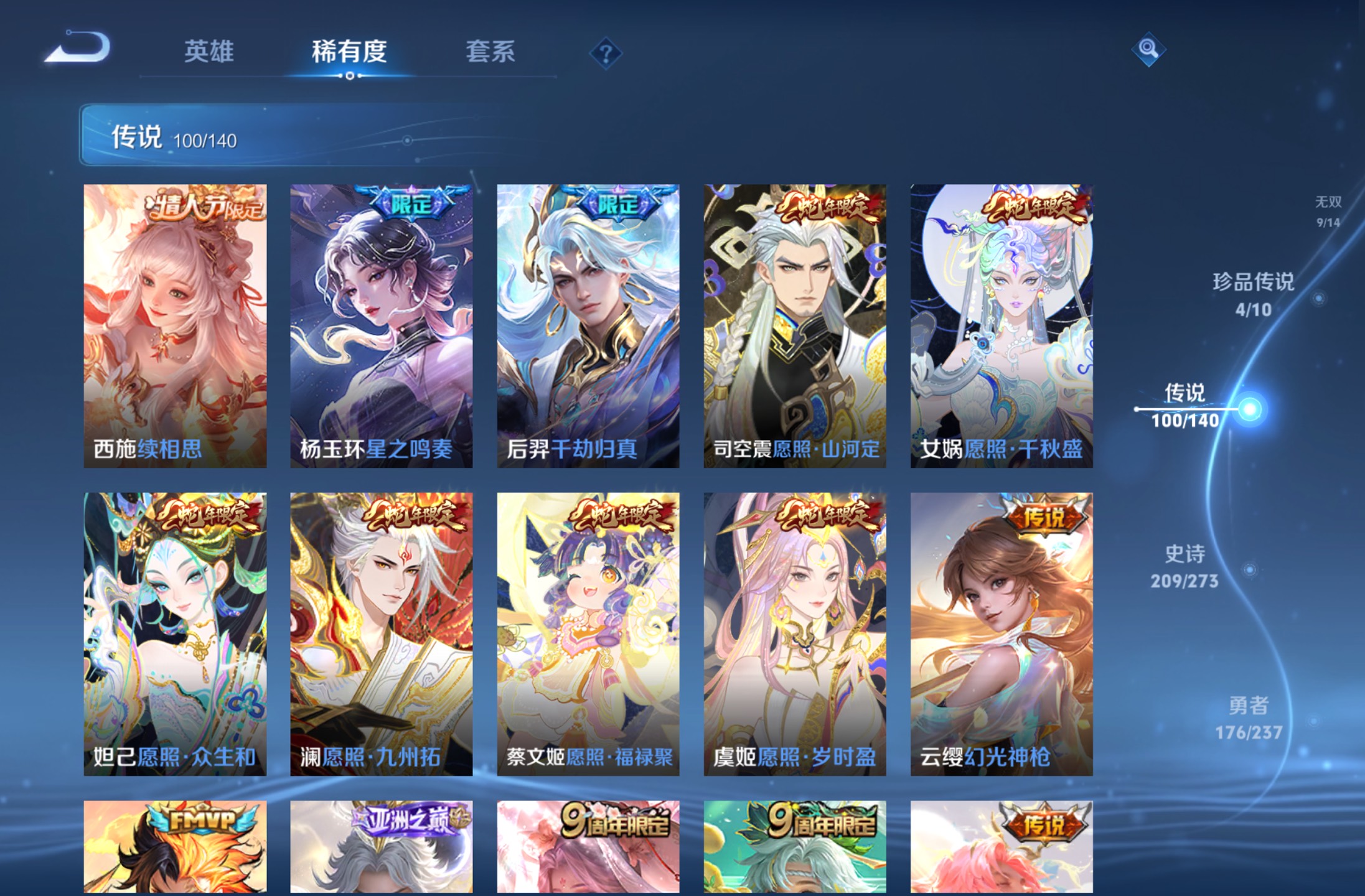 无双贵族 皮肤590 英雄129 绝世王者 荣耀典藏12 珍品无双1 无双皮肤9 珍品传说4 传说99 其他皮肤472