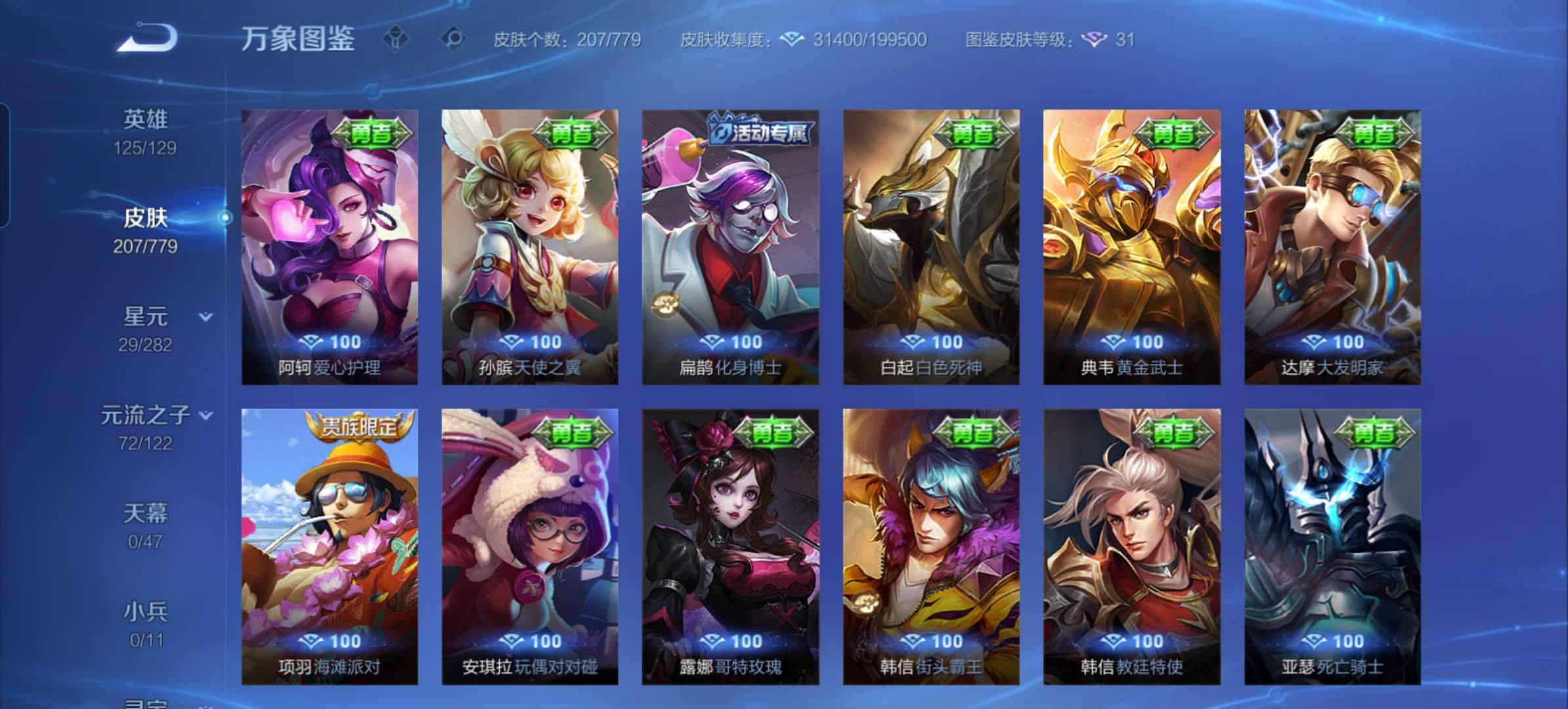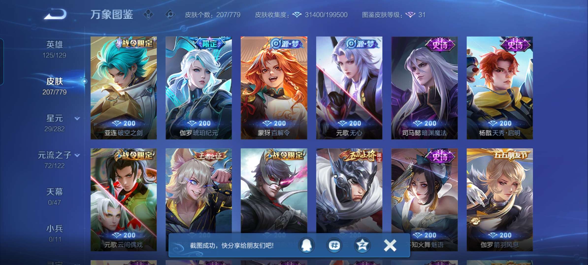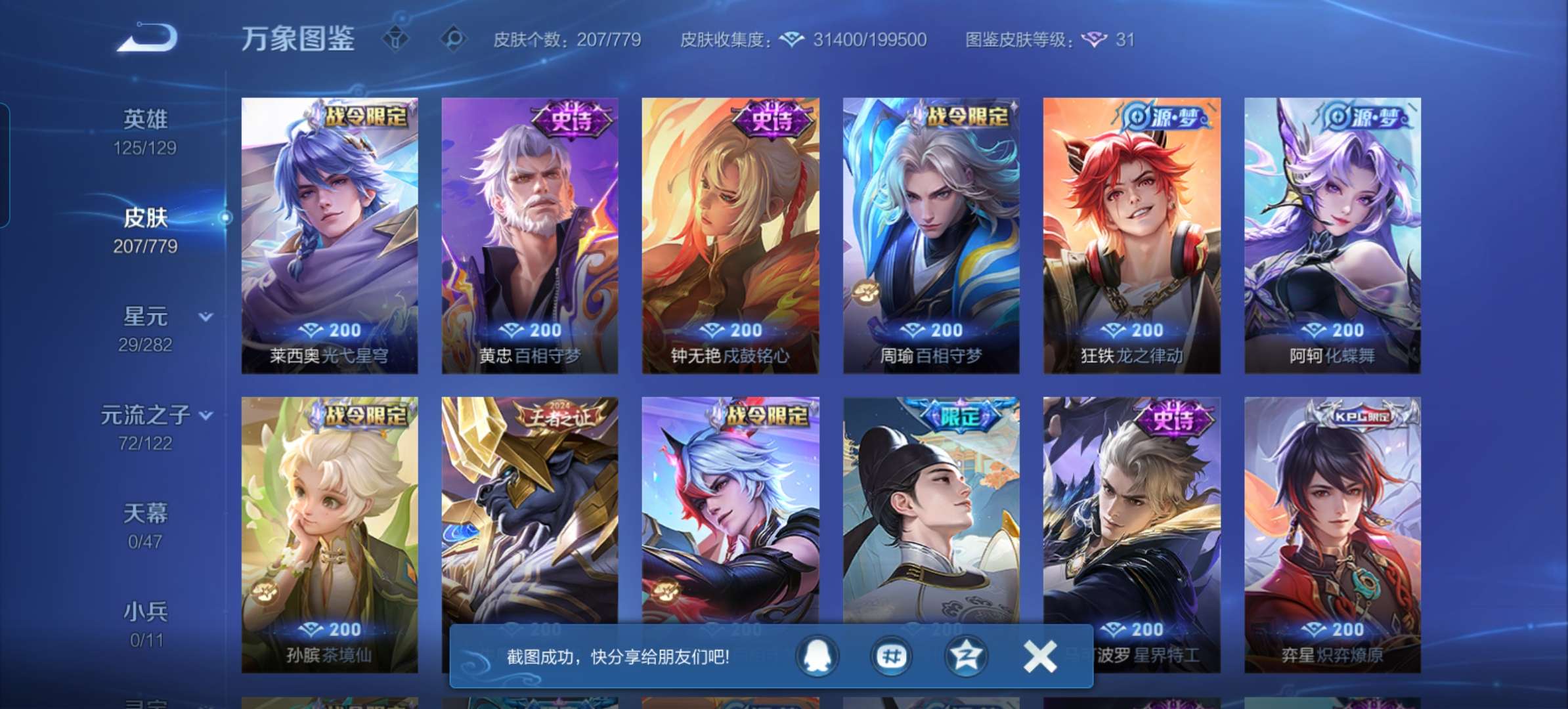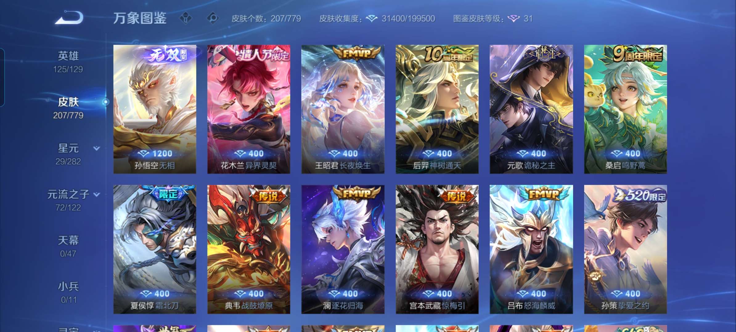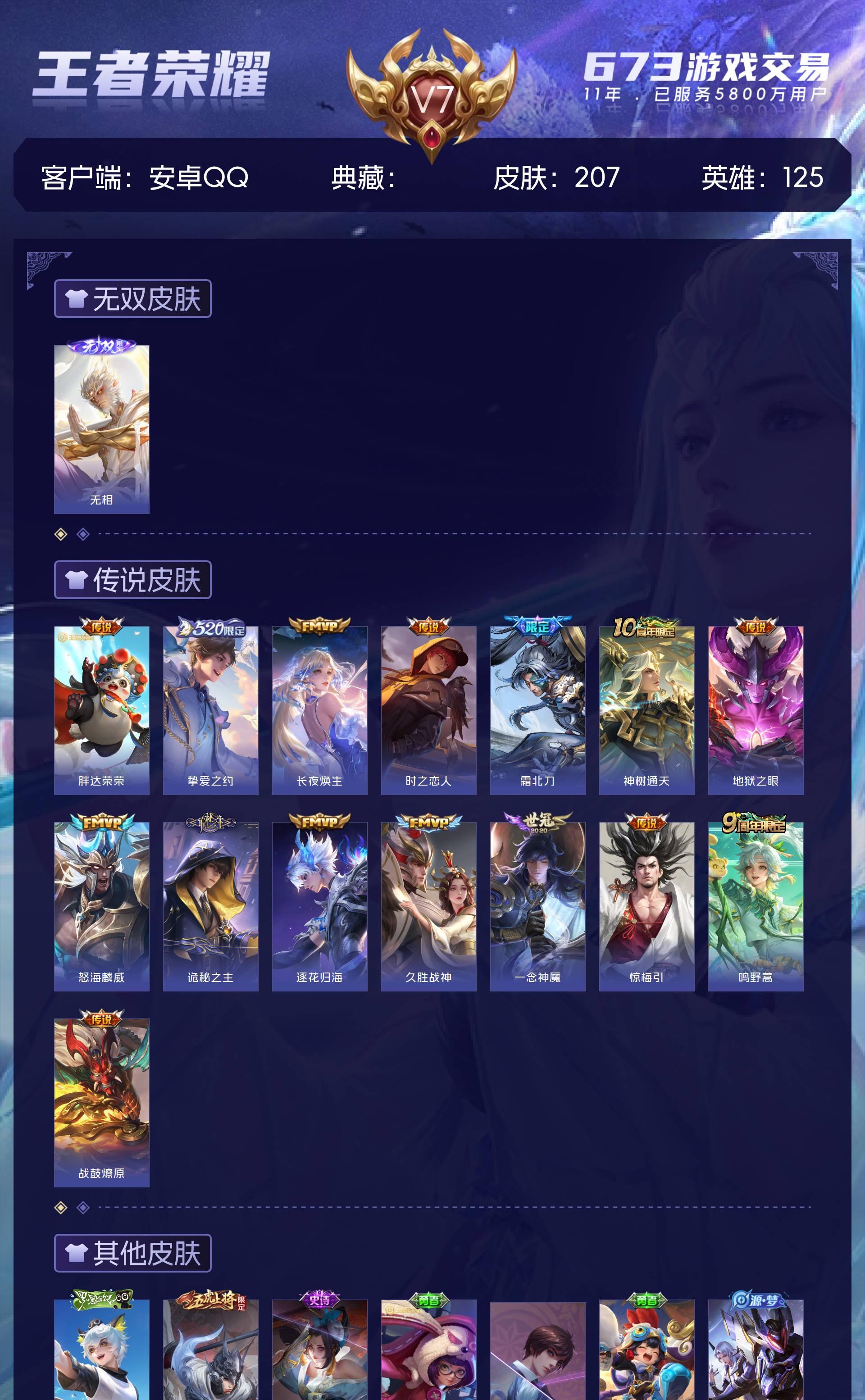 V7 皮肤207 英雄125 最强王者 无双皮肤1 星传说1 传说15 其他皮肤195