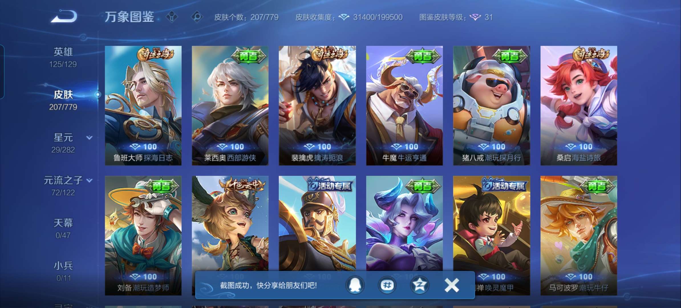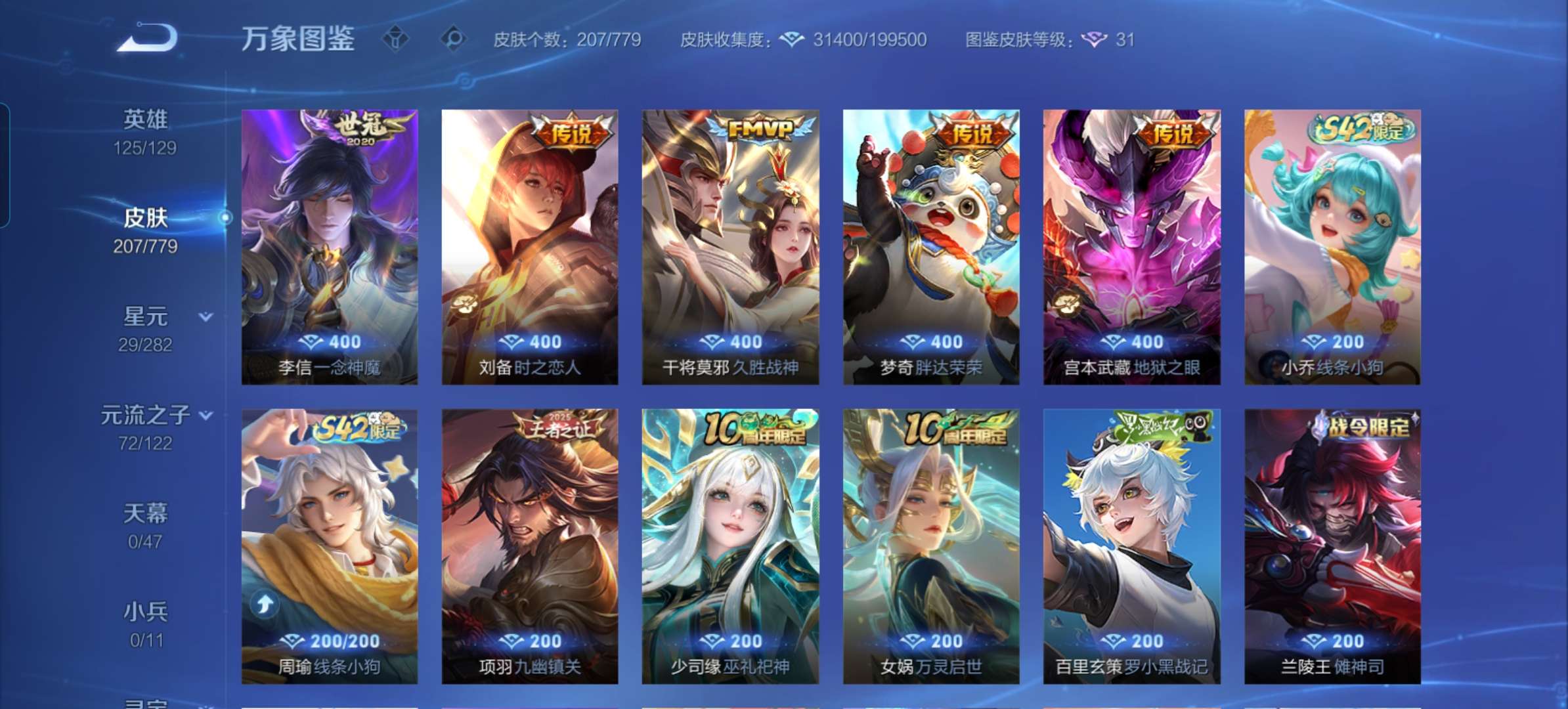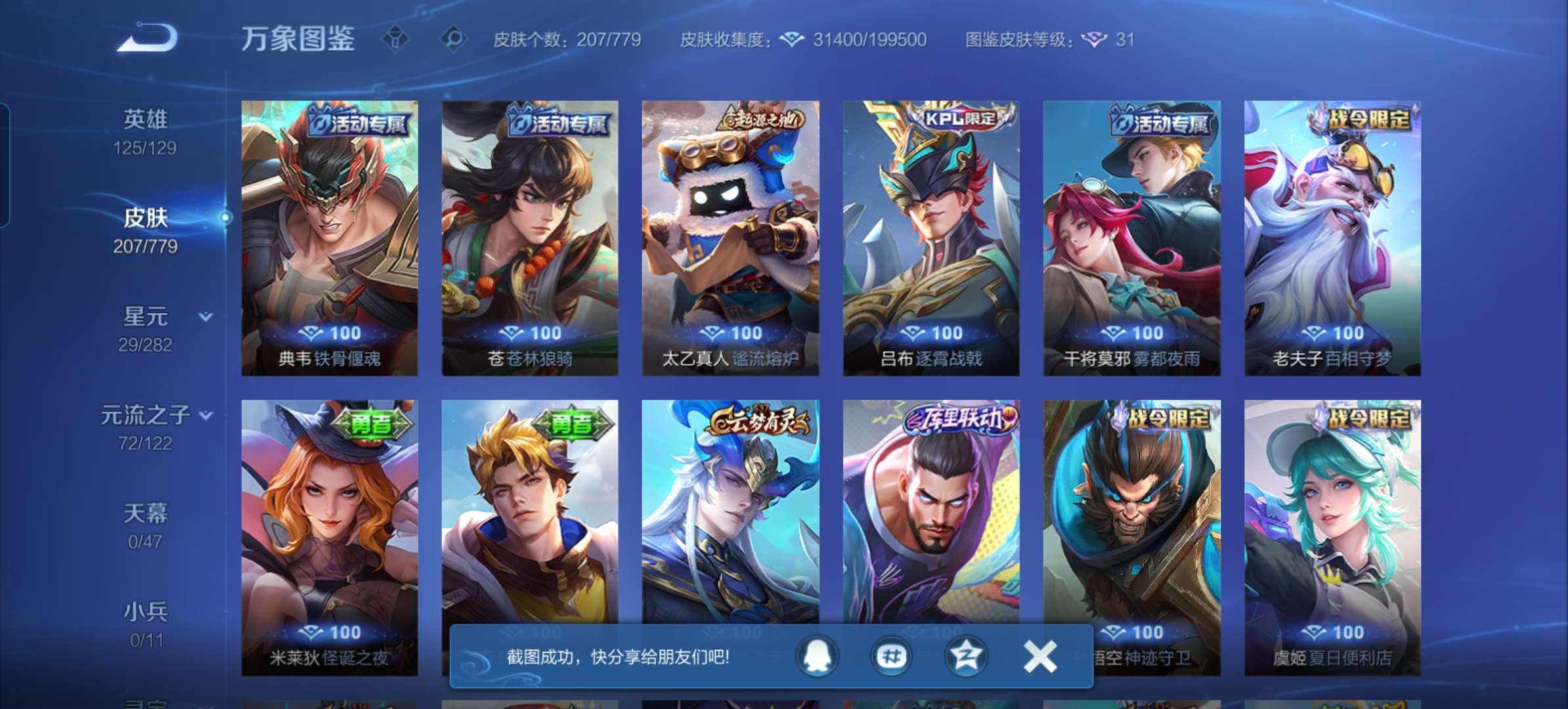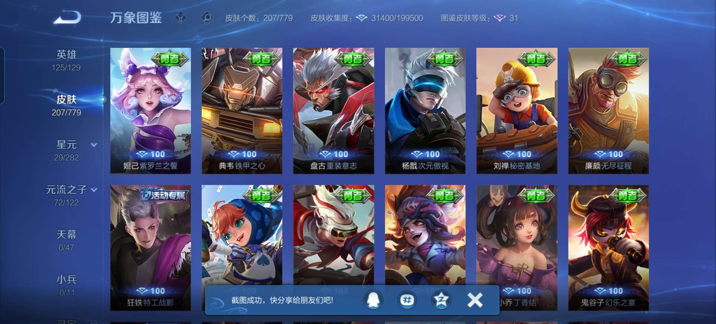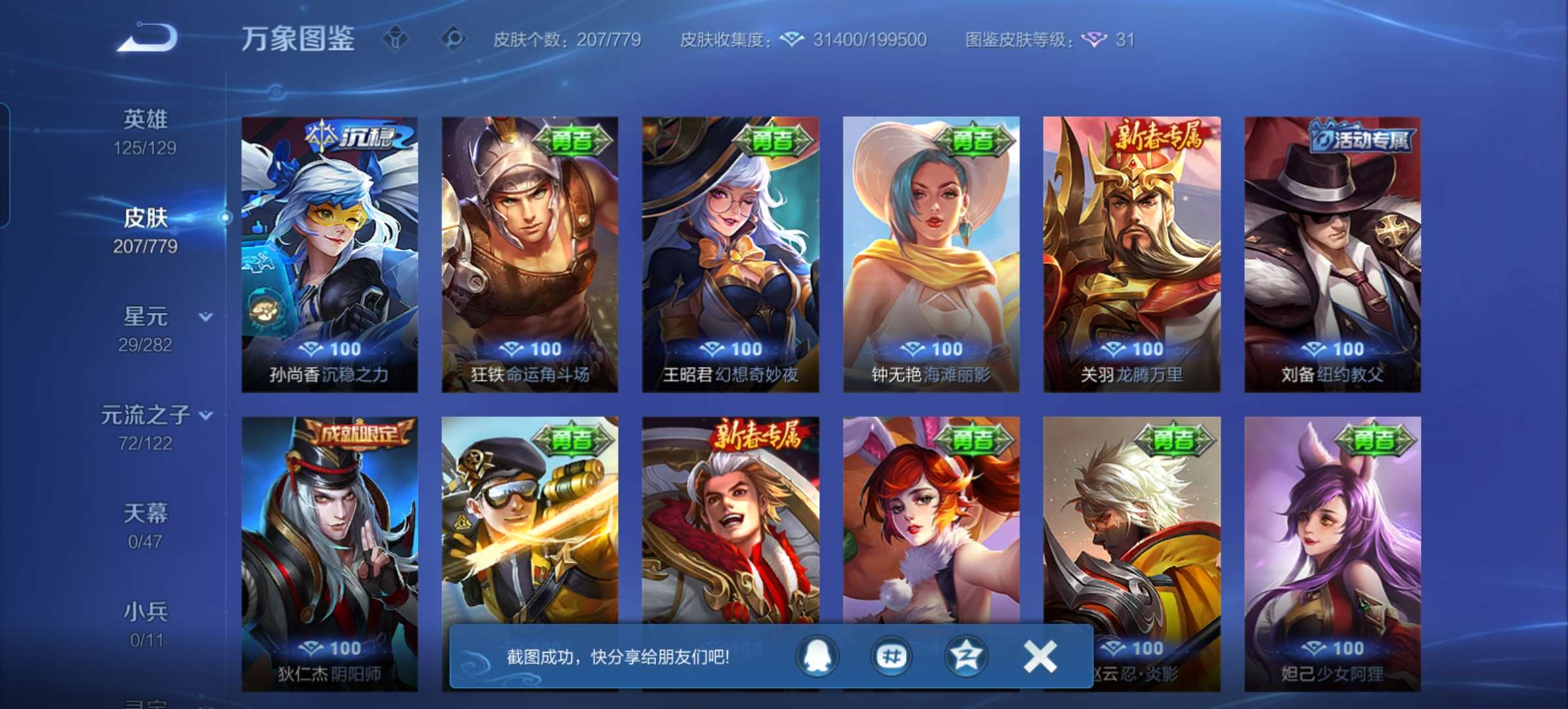 V7 皮肤207 英雄125 最强王者 无双皮肤1 星传说1 传说15 其他皮肤195