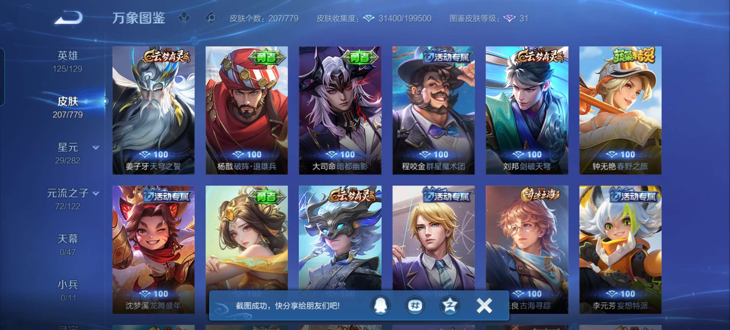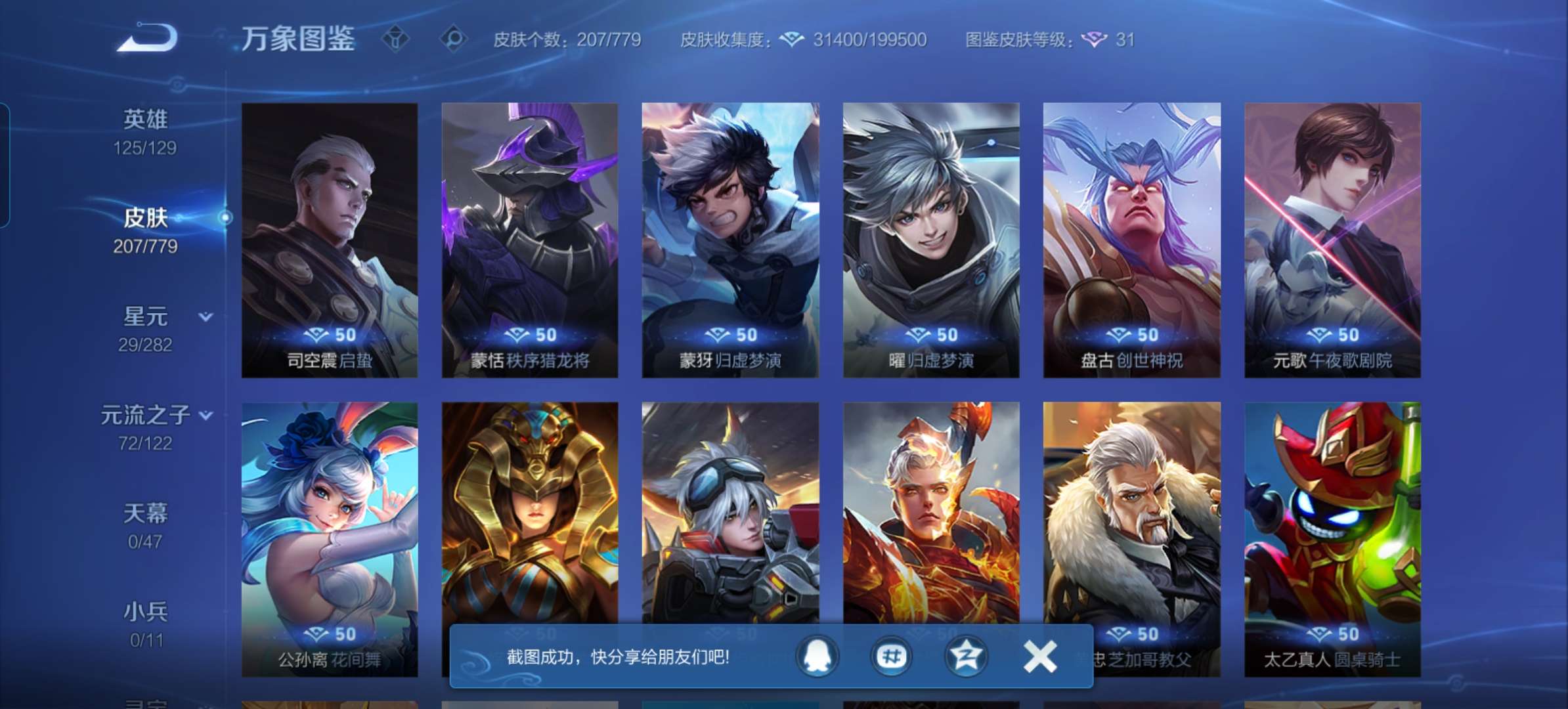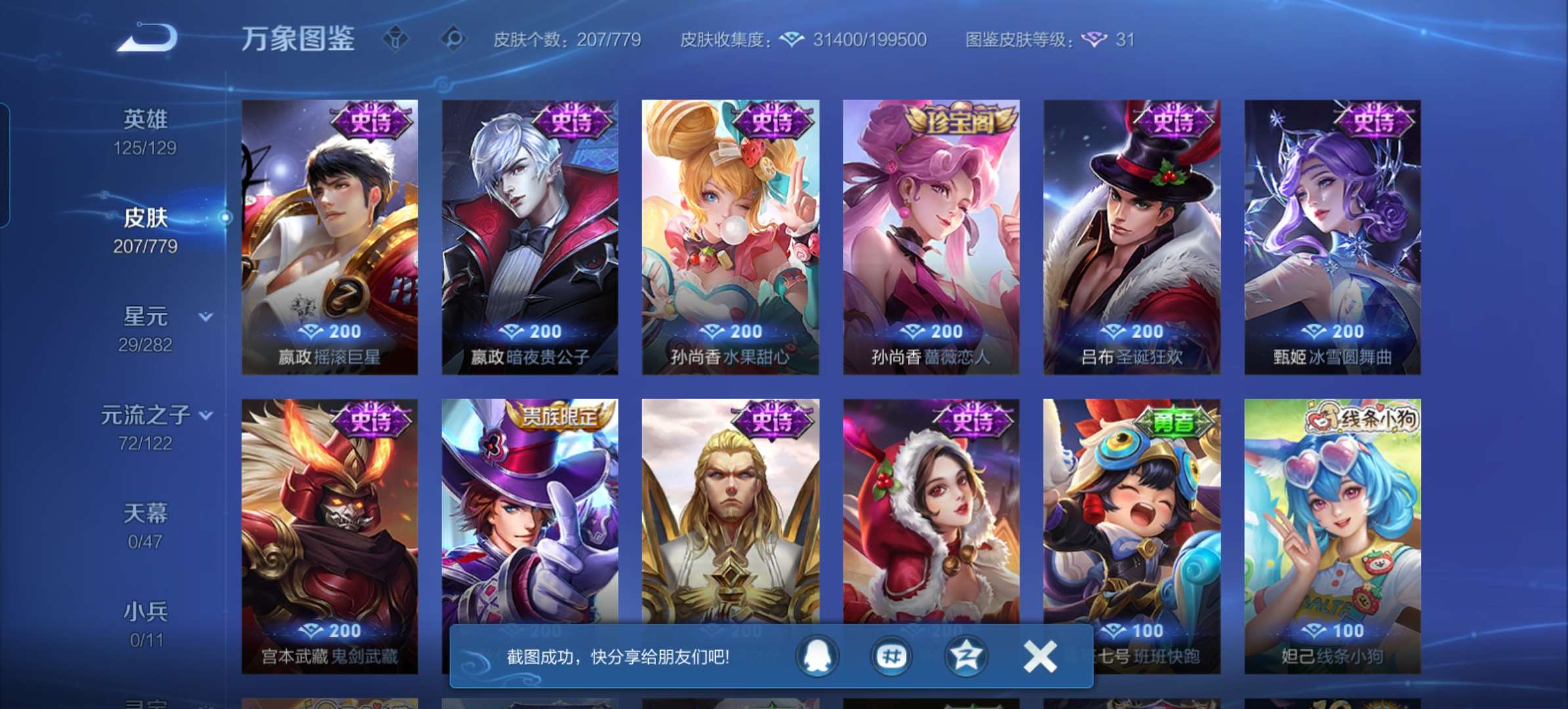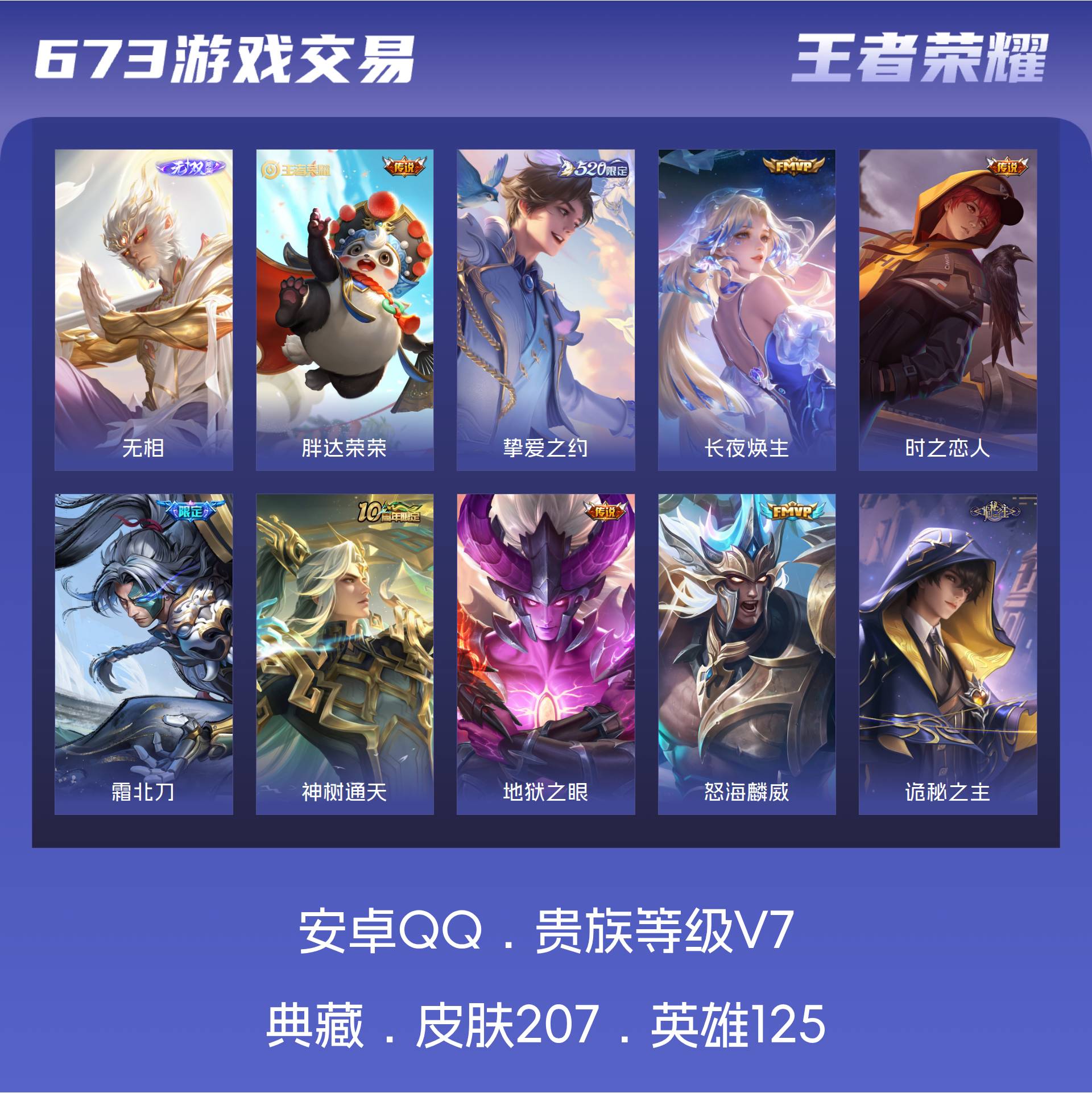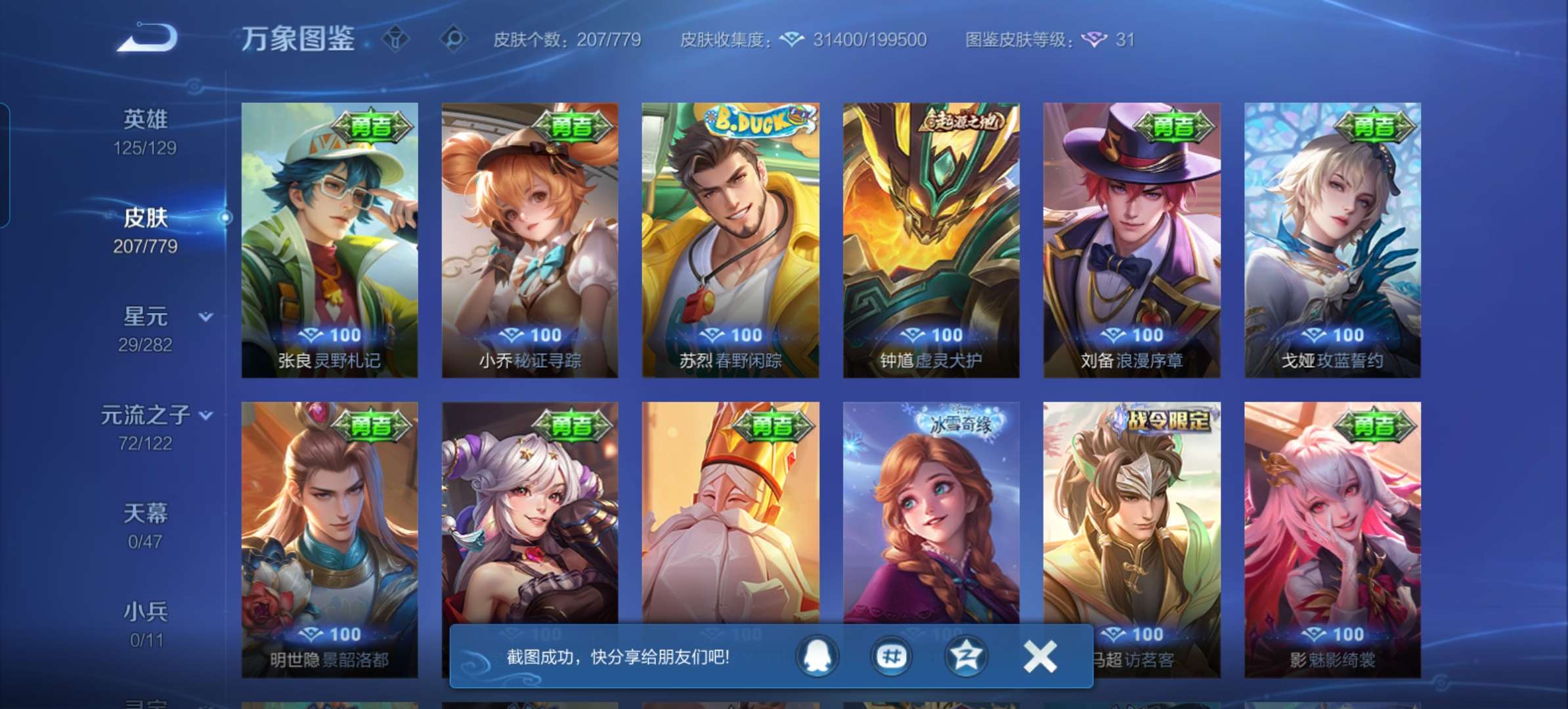 V7 皮肤207 英雄125 最强王者 无双皮肤1 星传说1 传说15 其他皮肤195