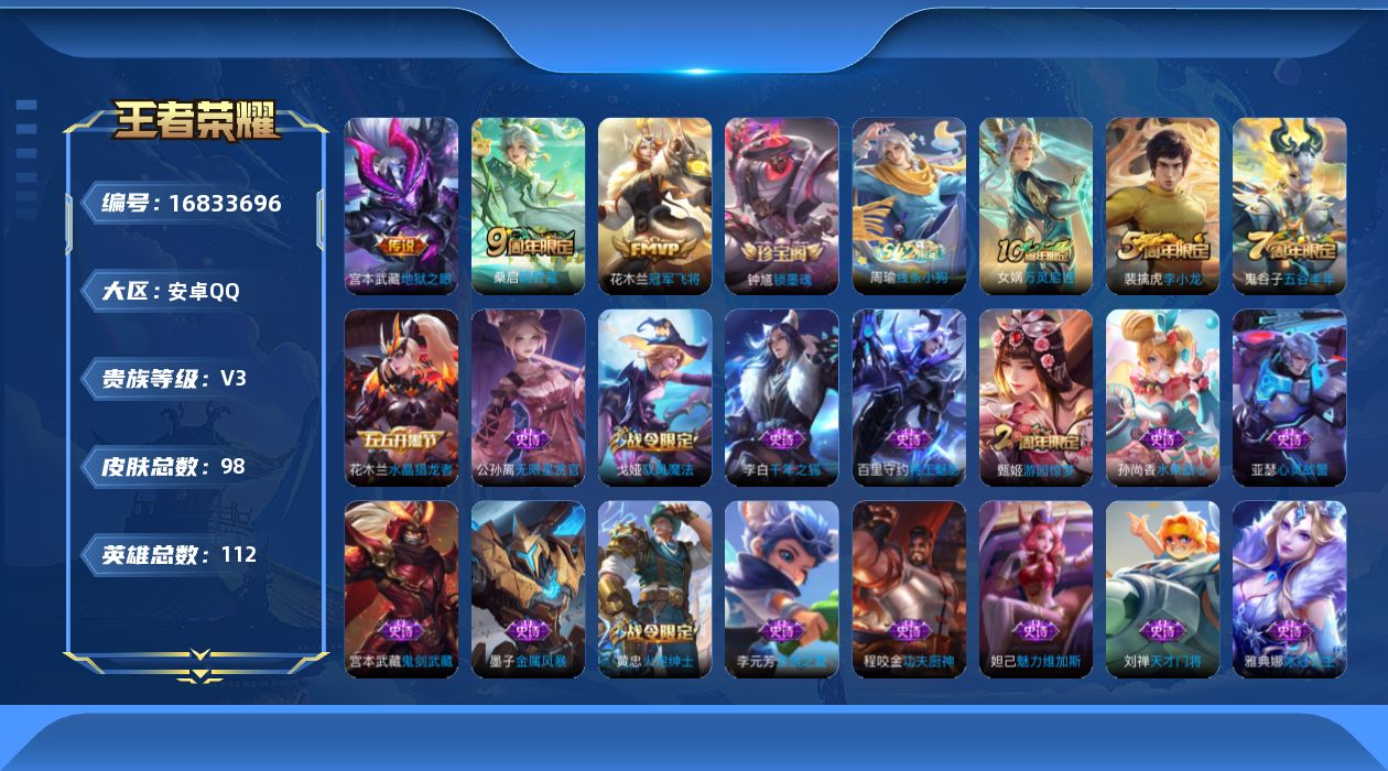 【16833696】[16833696]2.18号后可换绑【精品号手慢无】消费任意点券恢复v3,98皮练手小号。3传说,冠军飞将、地狱之眼,孙权全皮。铭文齐全,夺宝125抽。