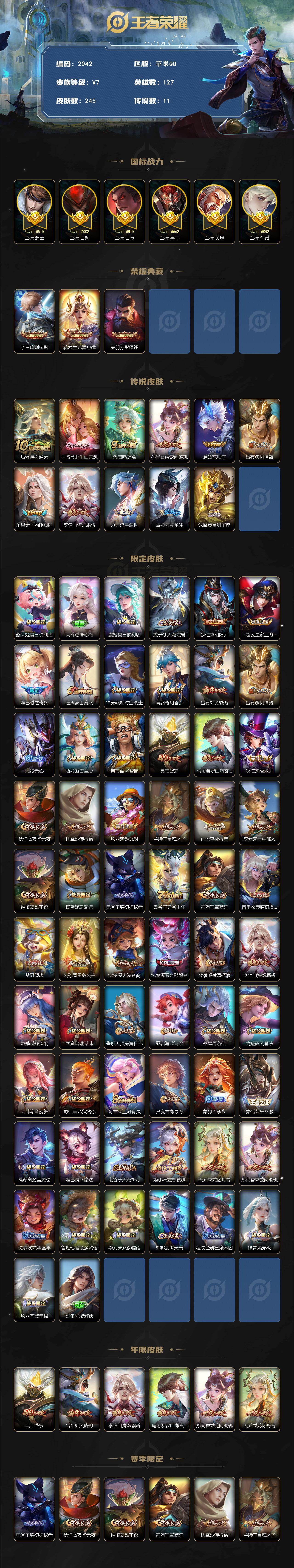 营地账号: /df苹果Q-V7-【特价出售,野王小号,6金标,多银标,3典藏,炽霜斩,逐花归海,多限定】-127英雄-245皮肤-3典藏皮肤-11传说-76史诗