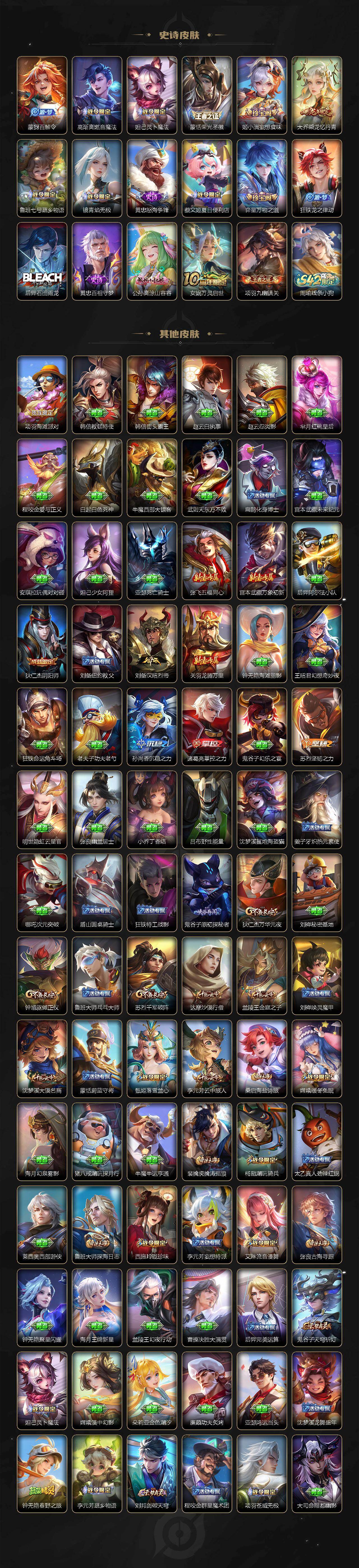 【传说皮肤】:后羿神树通天,干将莫邪千山共赴,桑启鸣野蒿,孙尚香乘龙问璇玑,澜逐花归海,吕布遇见神鼓,东皇太一灼幽烈阳,李信山海炽霜斩,赵云淬星耀世,虞姬云霓雀