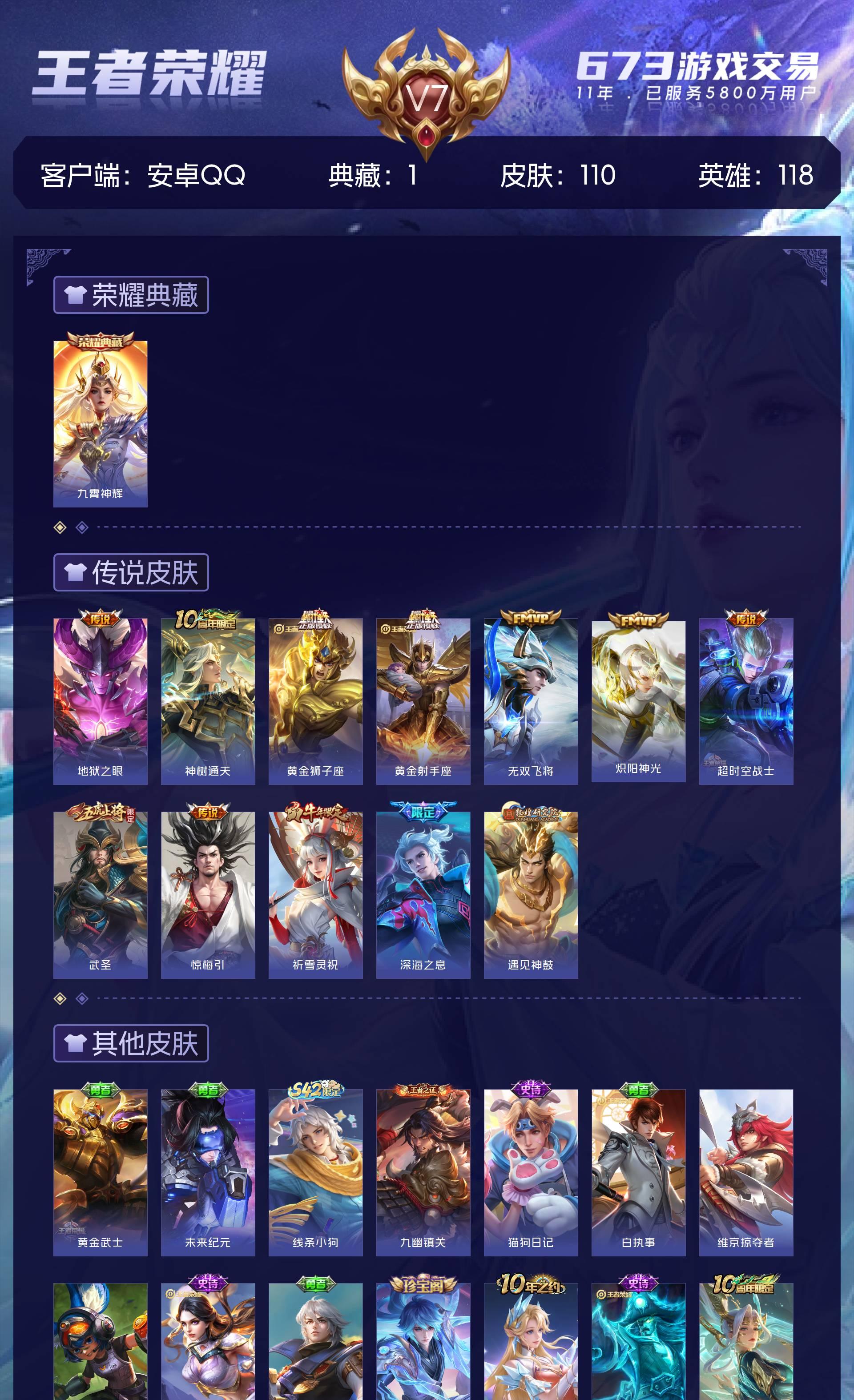 V7 皮肤110 英雄118 最强王者 荣耀典藏1 传说12 其他皮肤100