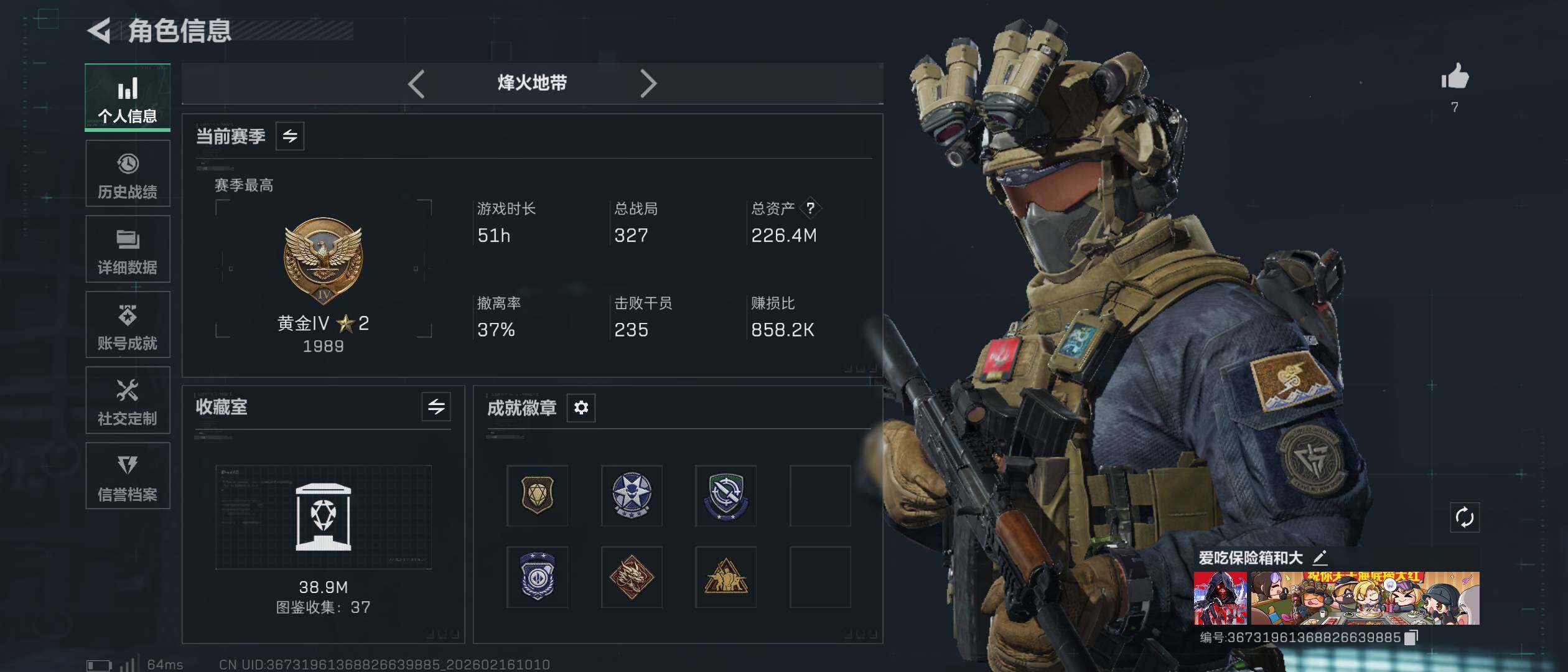 226m总资产-82268k哈伏币-60烽火等级-黄金-10战场等级-列兵