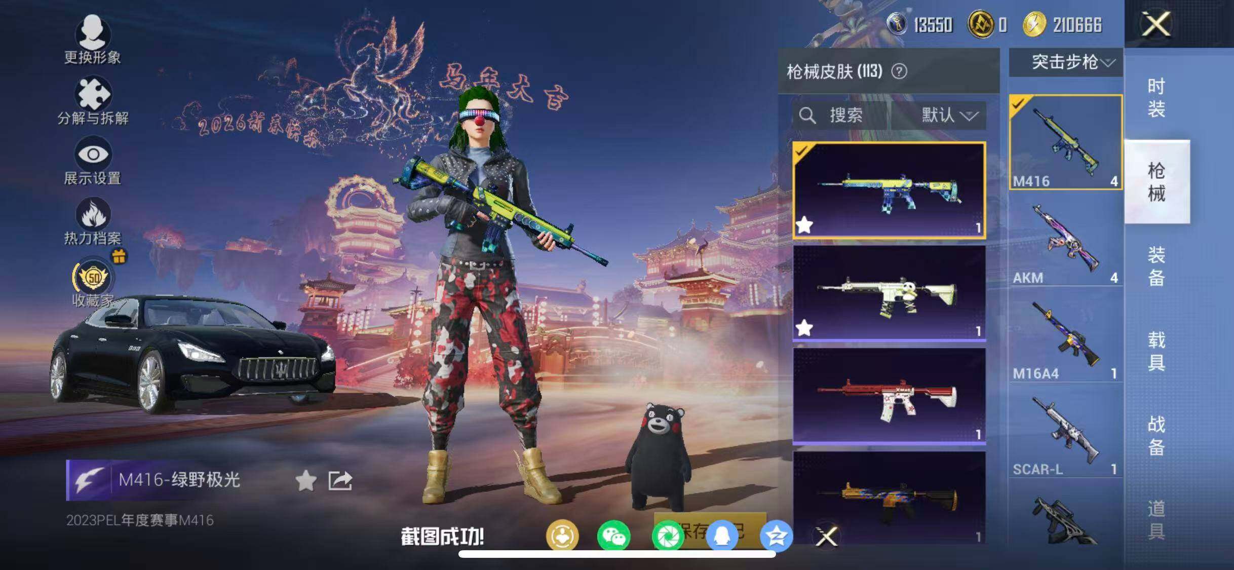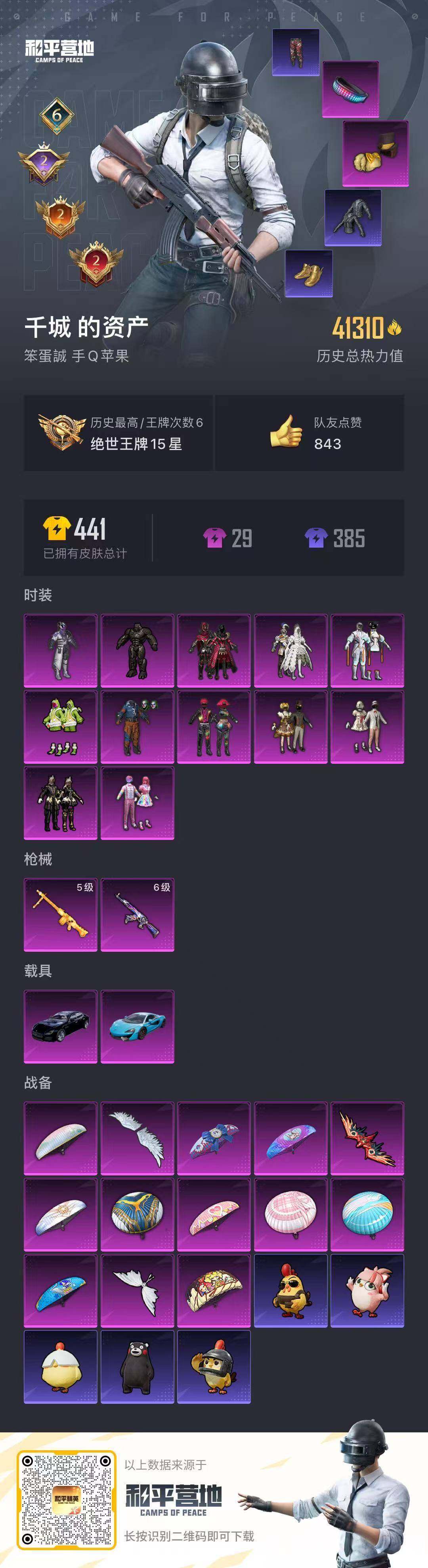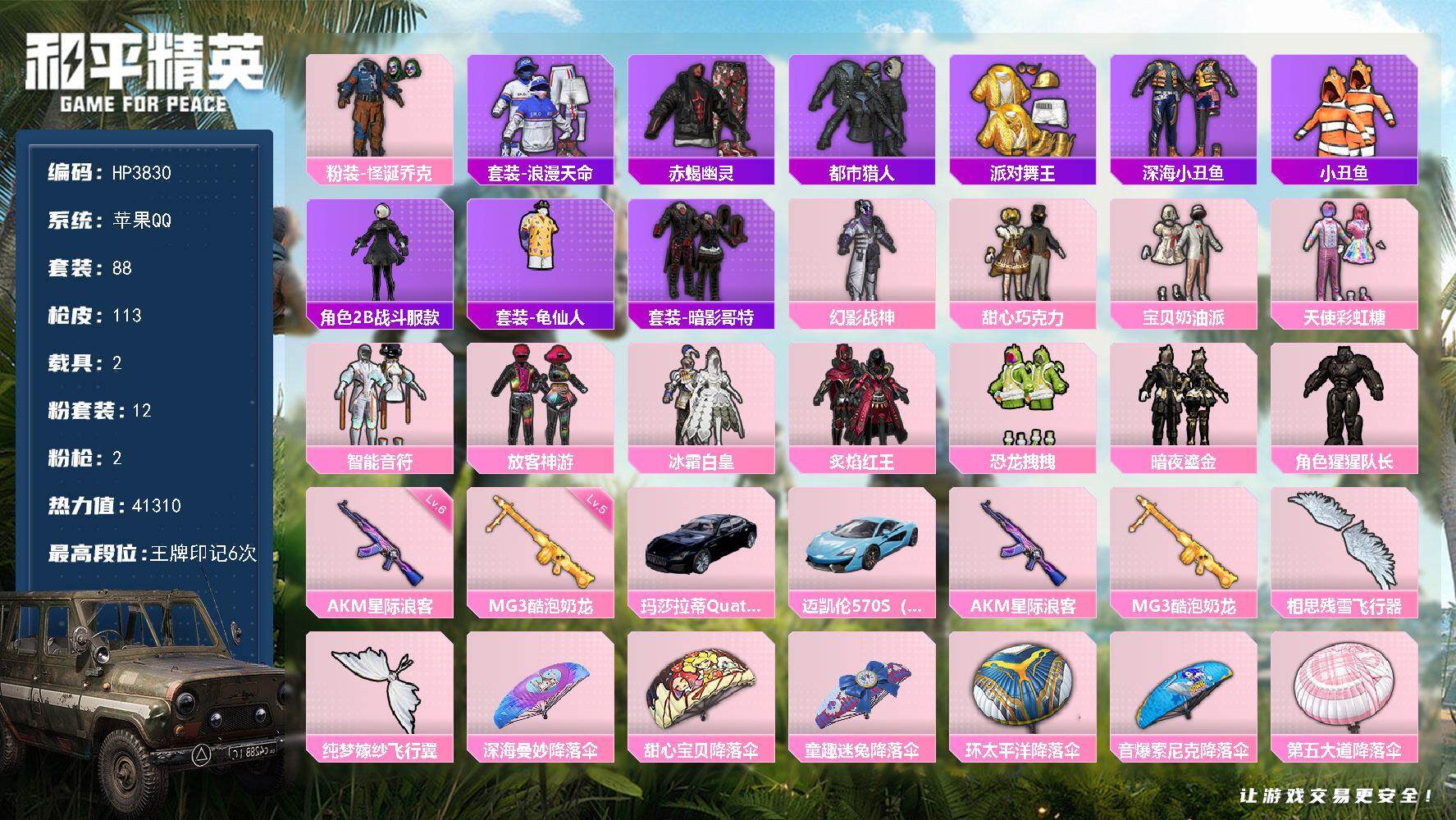 苹果 手Q-12粉装-2特效枪-2载具-3粉色飞行器-41310热力值-6王牌印记-88套装-113枪皮