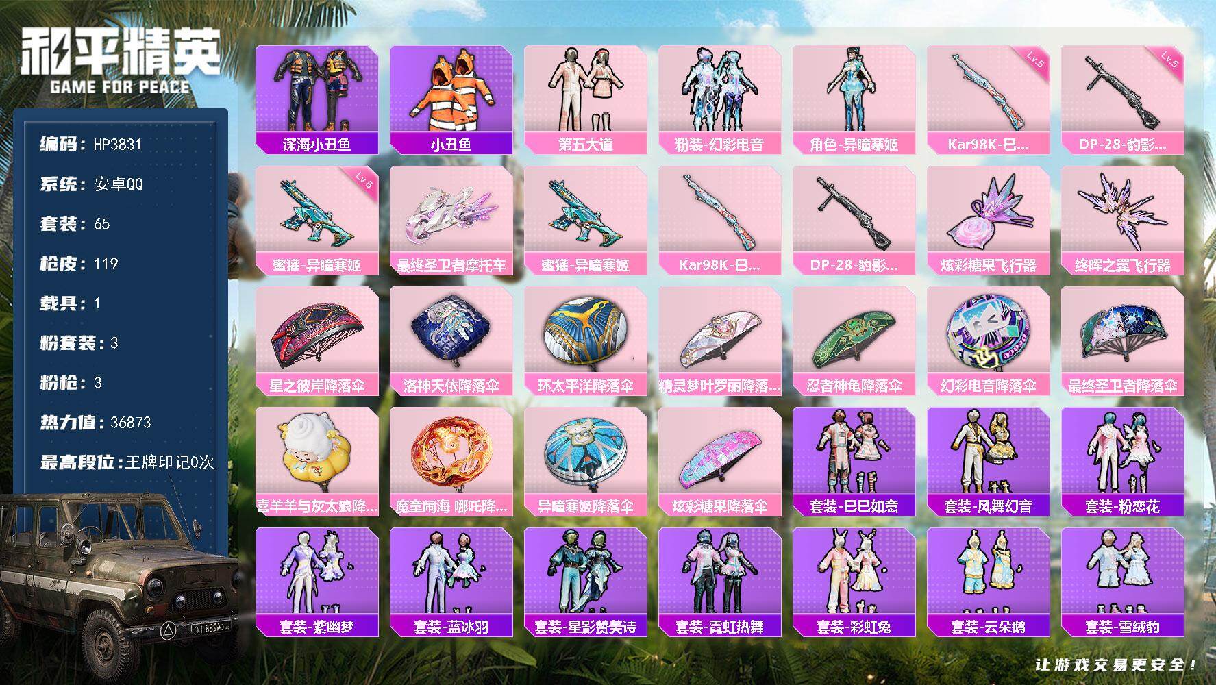 安卓 手Q-3粉装-3特效枪-1载具-2粉色飞行器-36873热力值-0王牌印记-65套装-119枪皮
