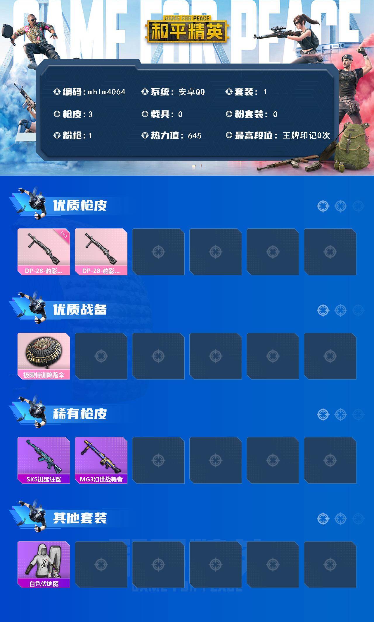 【mhlm4064】安卓 手Q-0粉装-1特效枪-0载具-0粉色飞行器-645热力值-0王牌印记-1套装-3枪皮