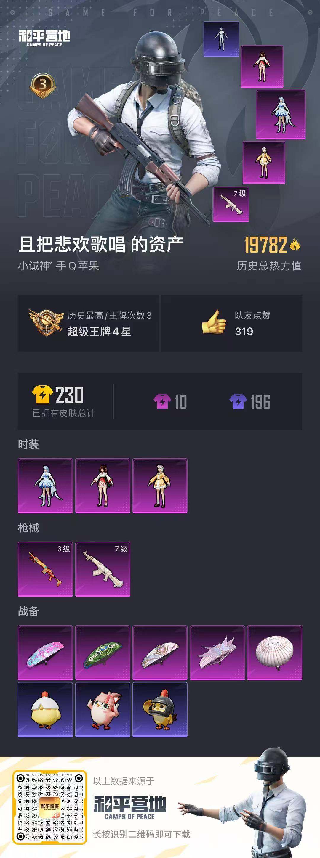 苹果 手Q-3粉装-2特效枪-0载具-0粉色飞行器-19782热力值-3王牌印记-43套装-72枪皮