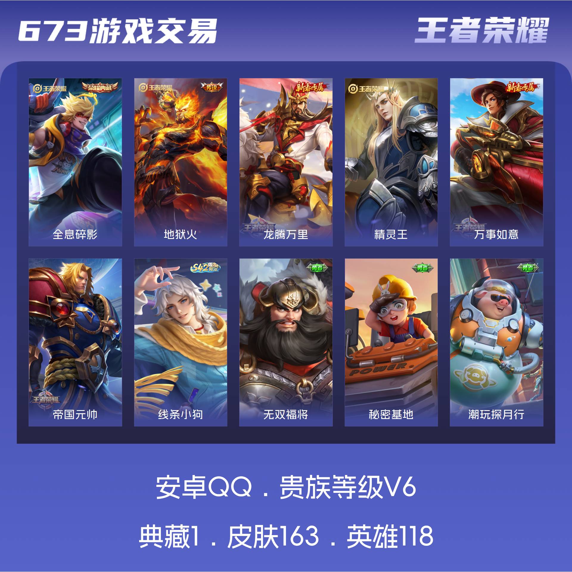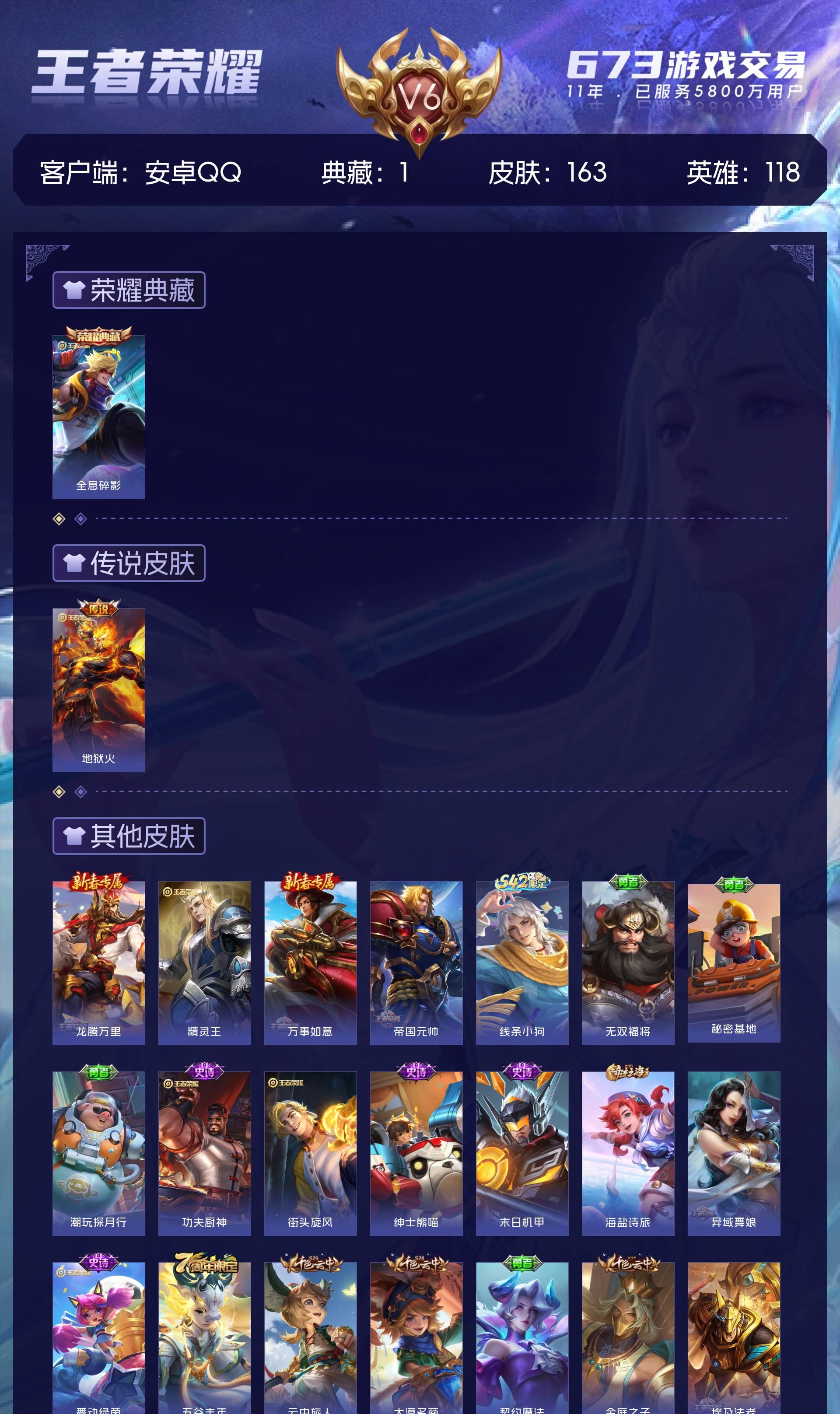 V6 皮肤163 英雄118 永恒钻石 荣耀典藏1 星传说1 传说1 其他皮肤167