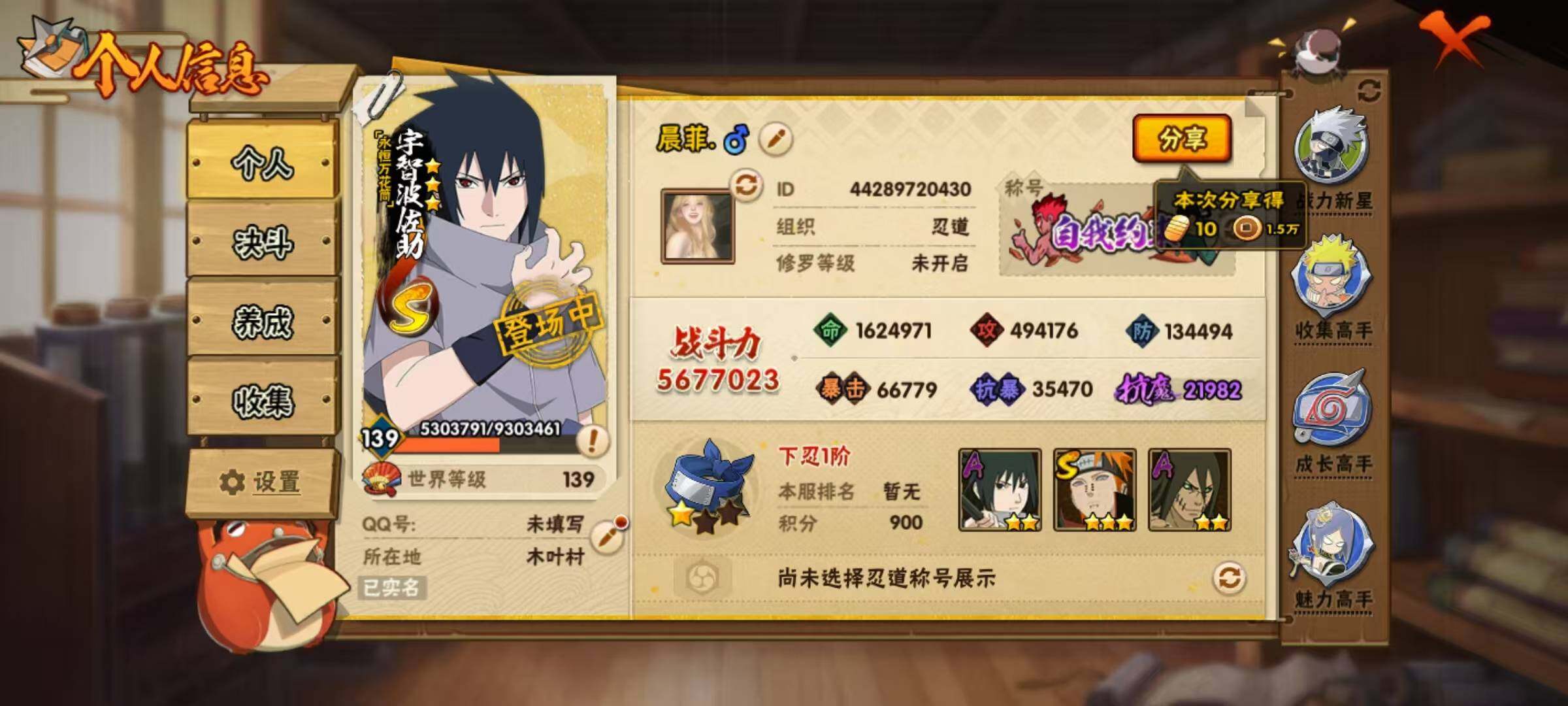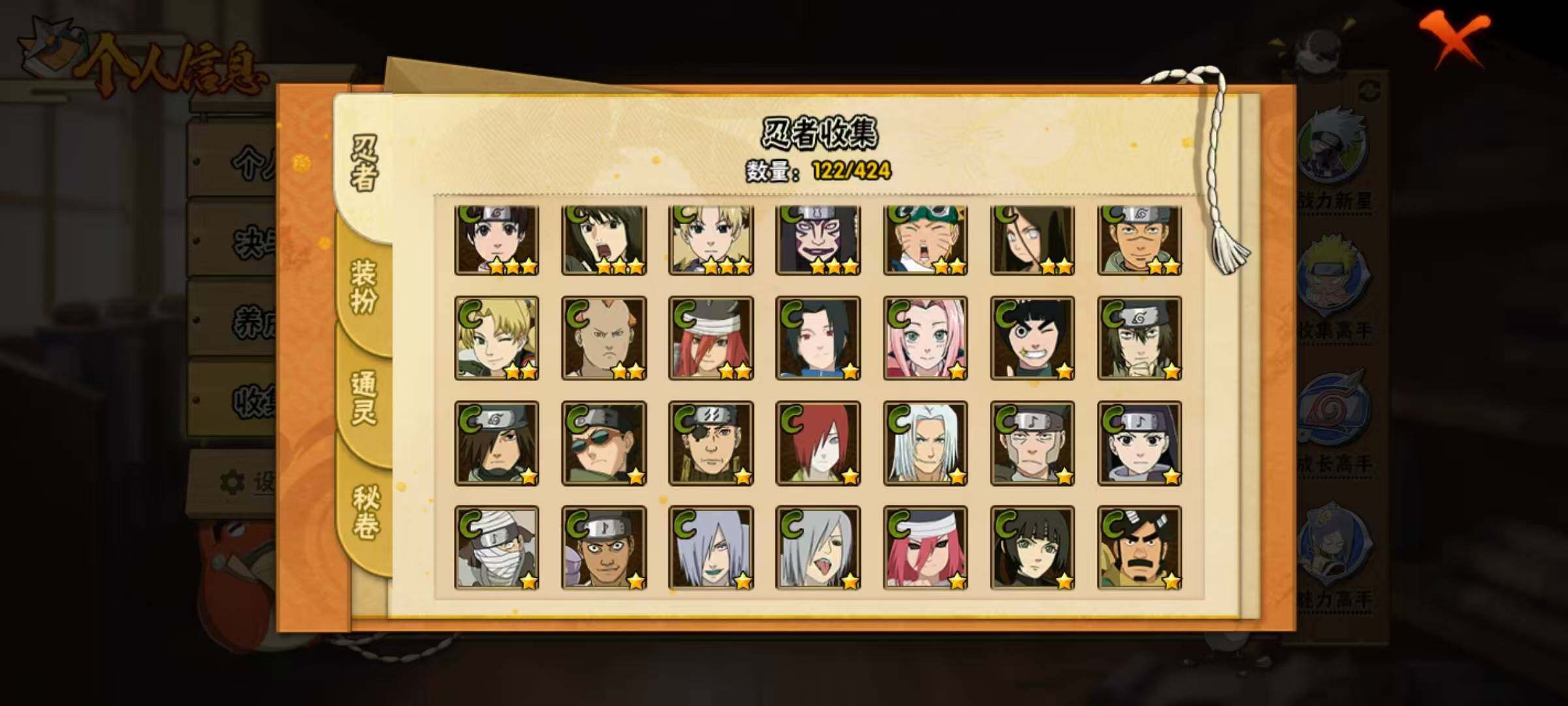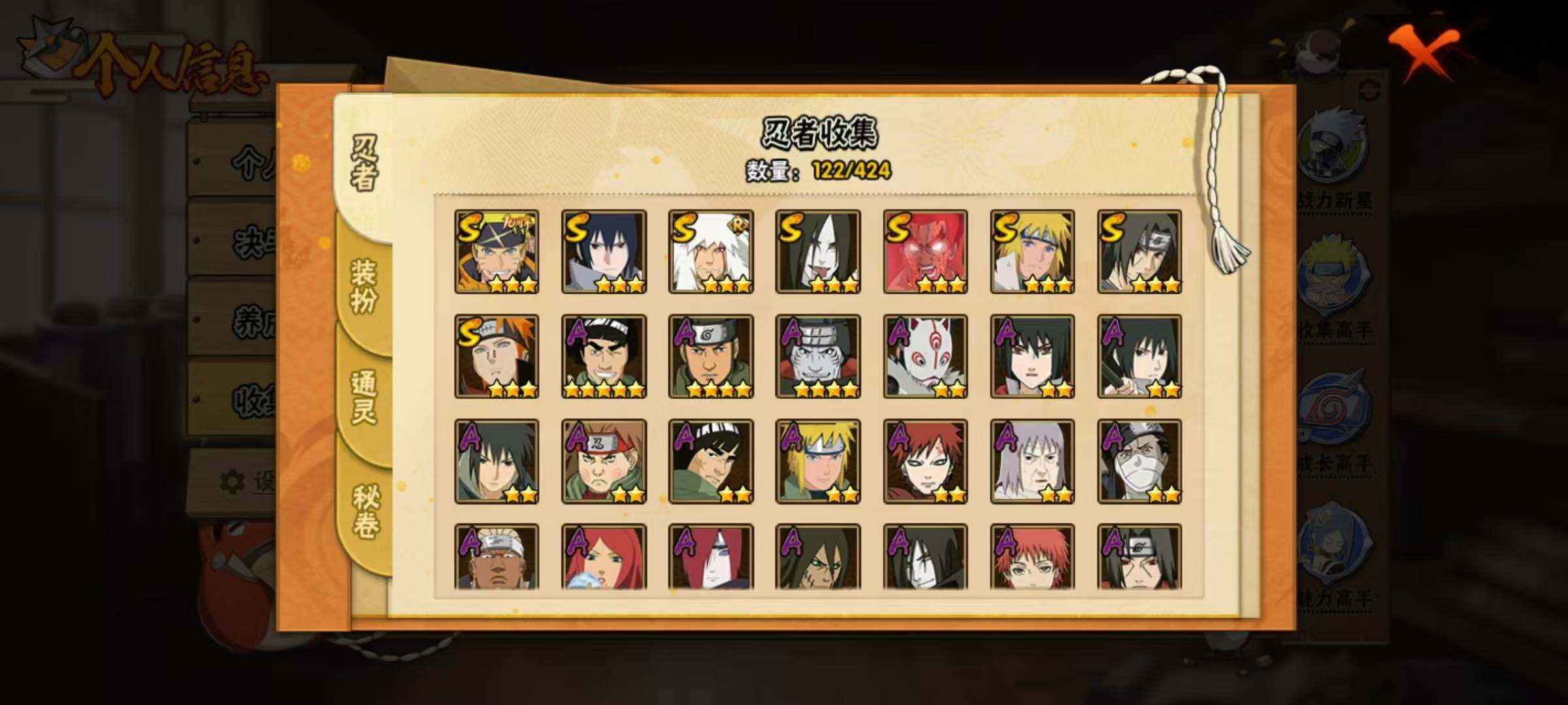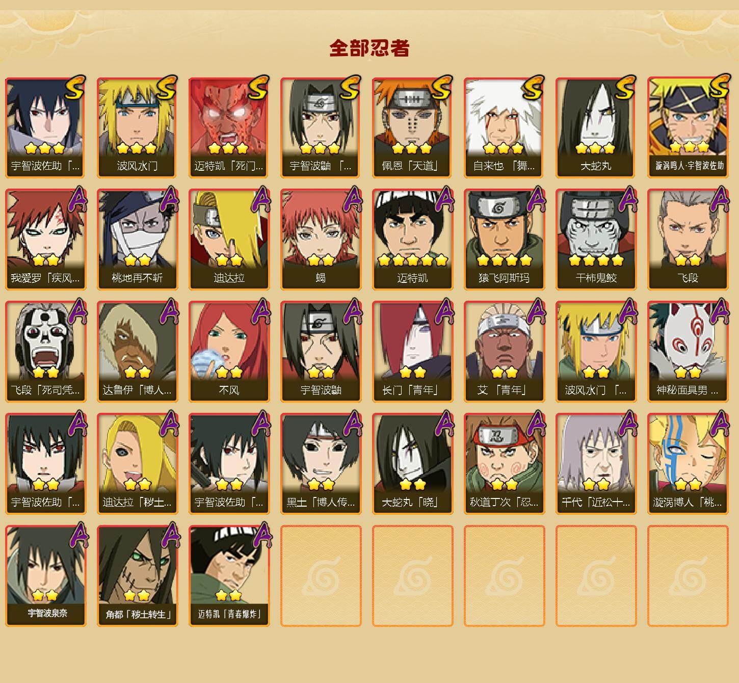 【S级忍者】:宇智波鼬「须佐能乎」(3星),自来也「舞之豪杰」(3星),大蛇丸(3星),波风水门(3星),迈特凯「死门」(3星),佩恩「天道」(3星),宇智波佐助「永恒万花筒」(3星),漩涡鸣人·宇智波佐助(3星)