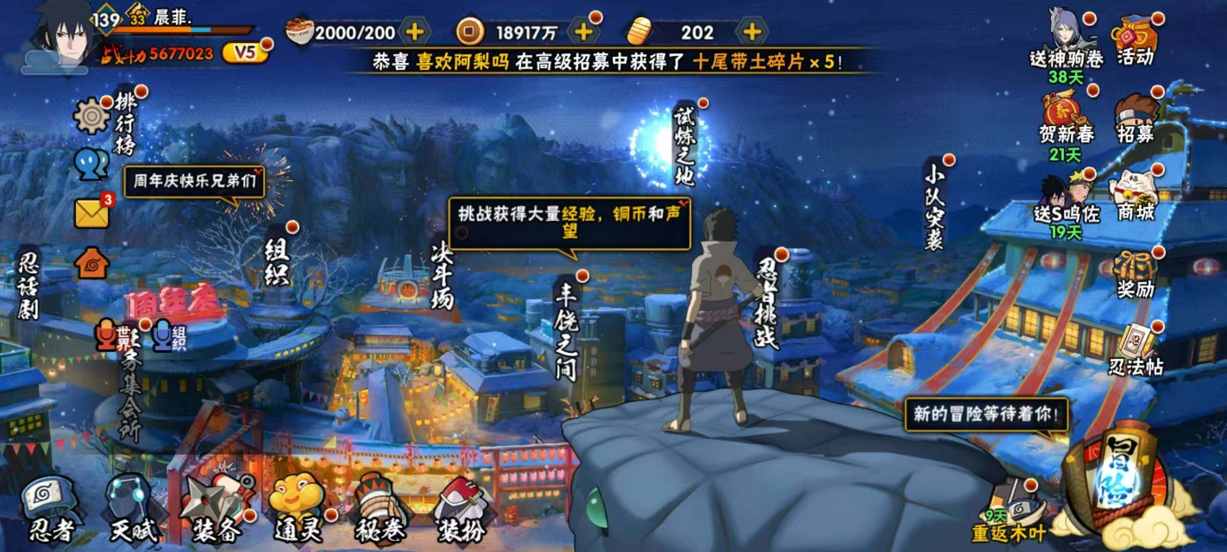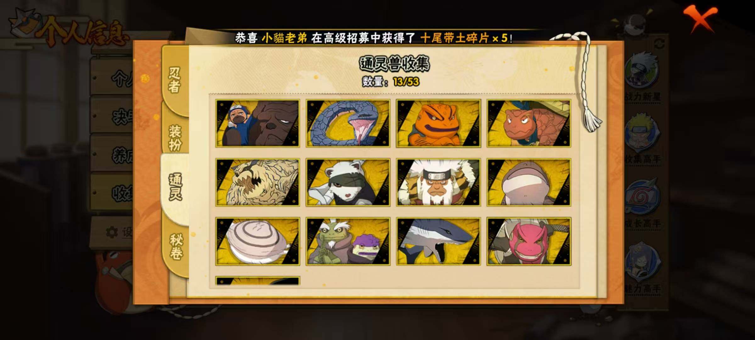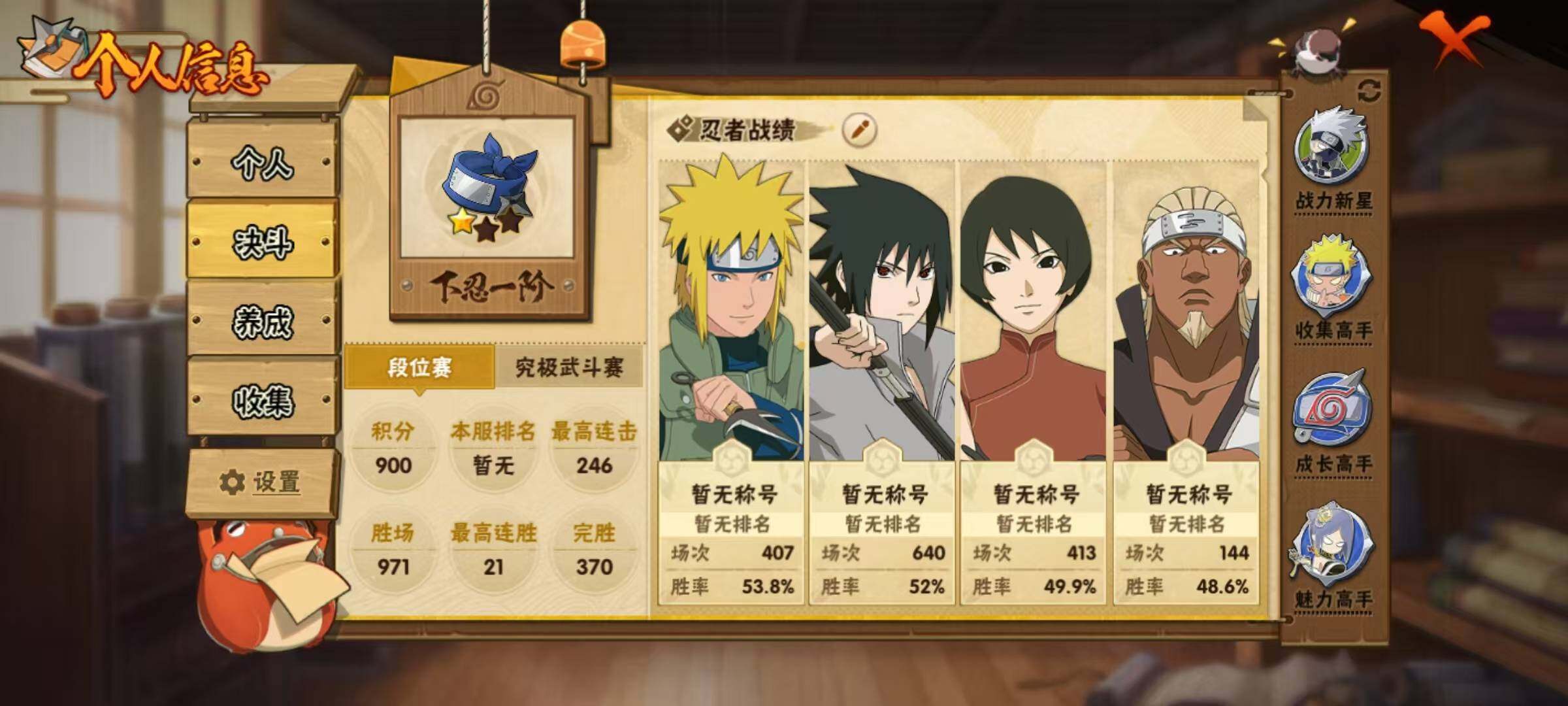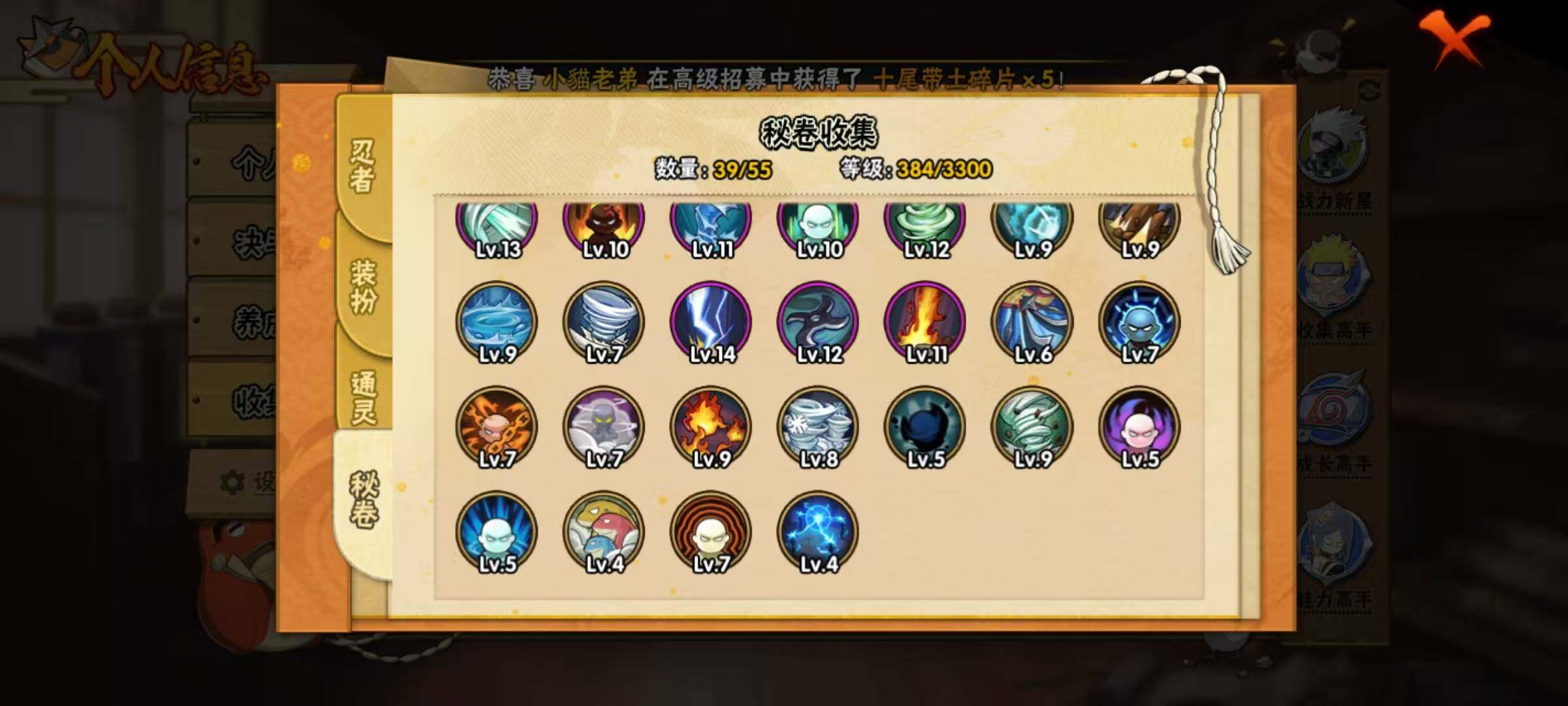 【S级忍者】:宇智波鼬「须佐能乎」(3星),自来也「舞之豪杰」(3星),大蛇丸(3星),波风水门(3星),迈特凯「死门」(3星),佩恩「天道」(3星),宇智波佐助「永恒万花筒」(3星),漩涡鸣人·宇智波佐助(3星)