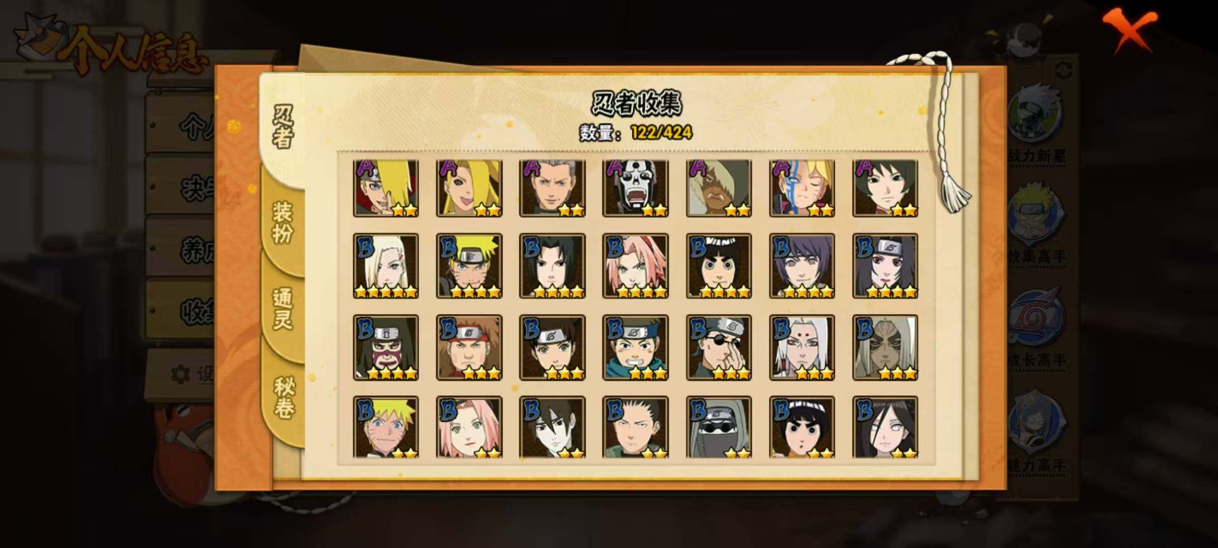 【A级忍者】:艾「青年」(2星),长门「青年」(2星),波风水门「青年」(2星),达鲁伊「博人传」(2星),迪达拉(2星),迪达拉「秽土转生」(2星),
