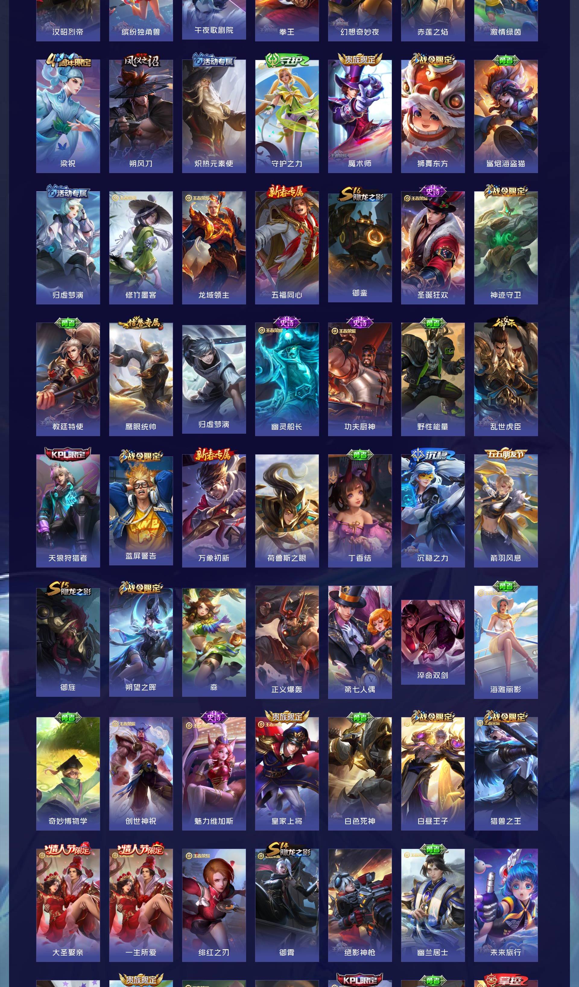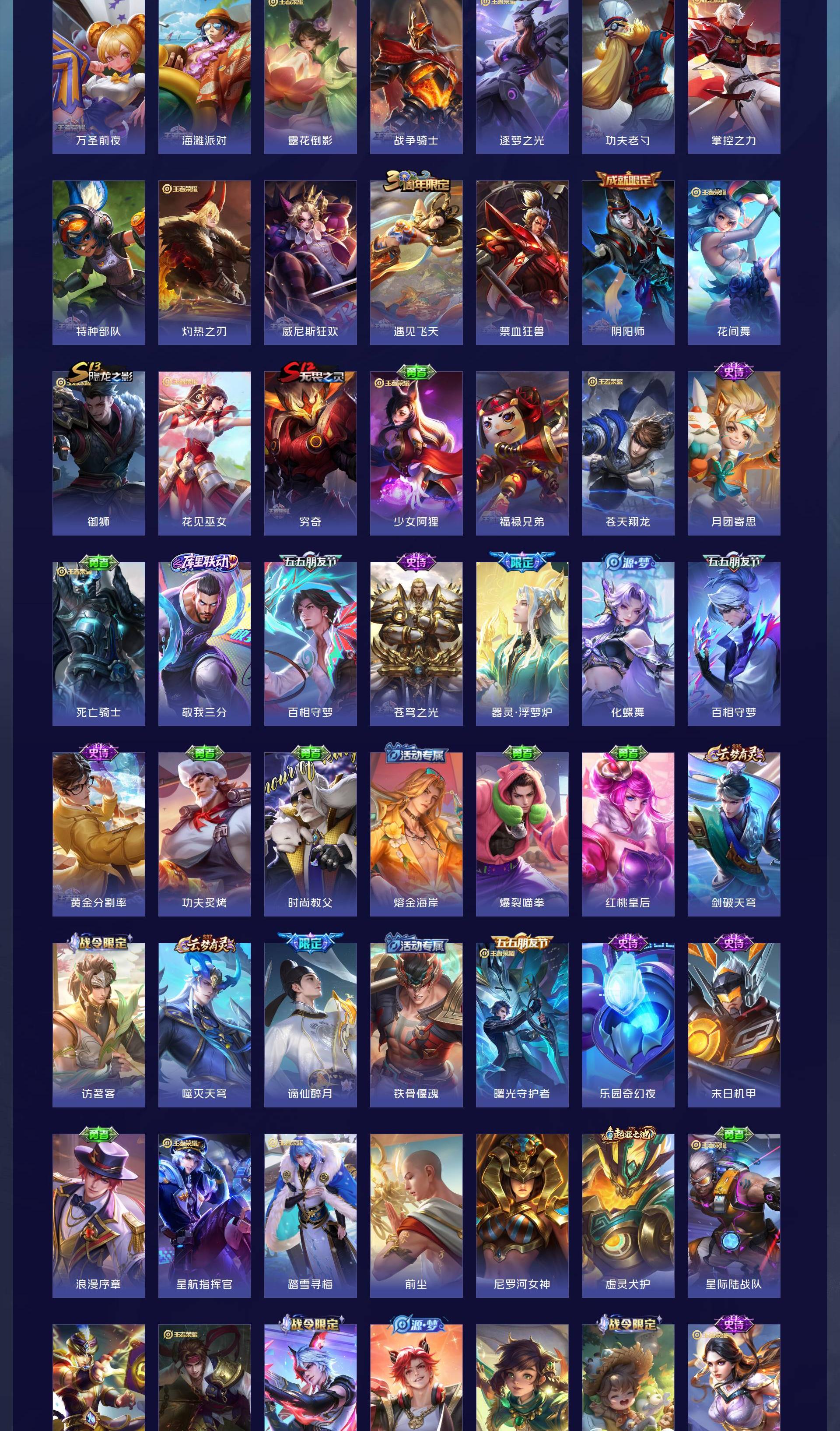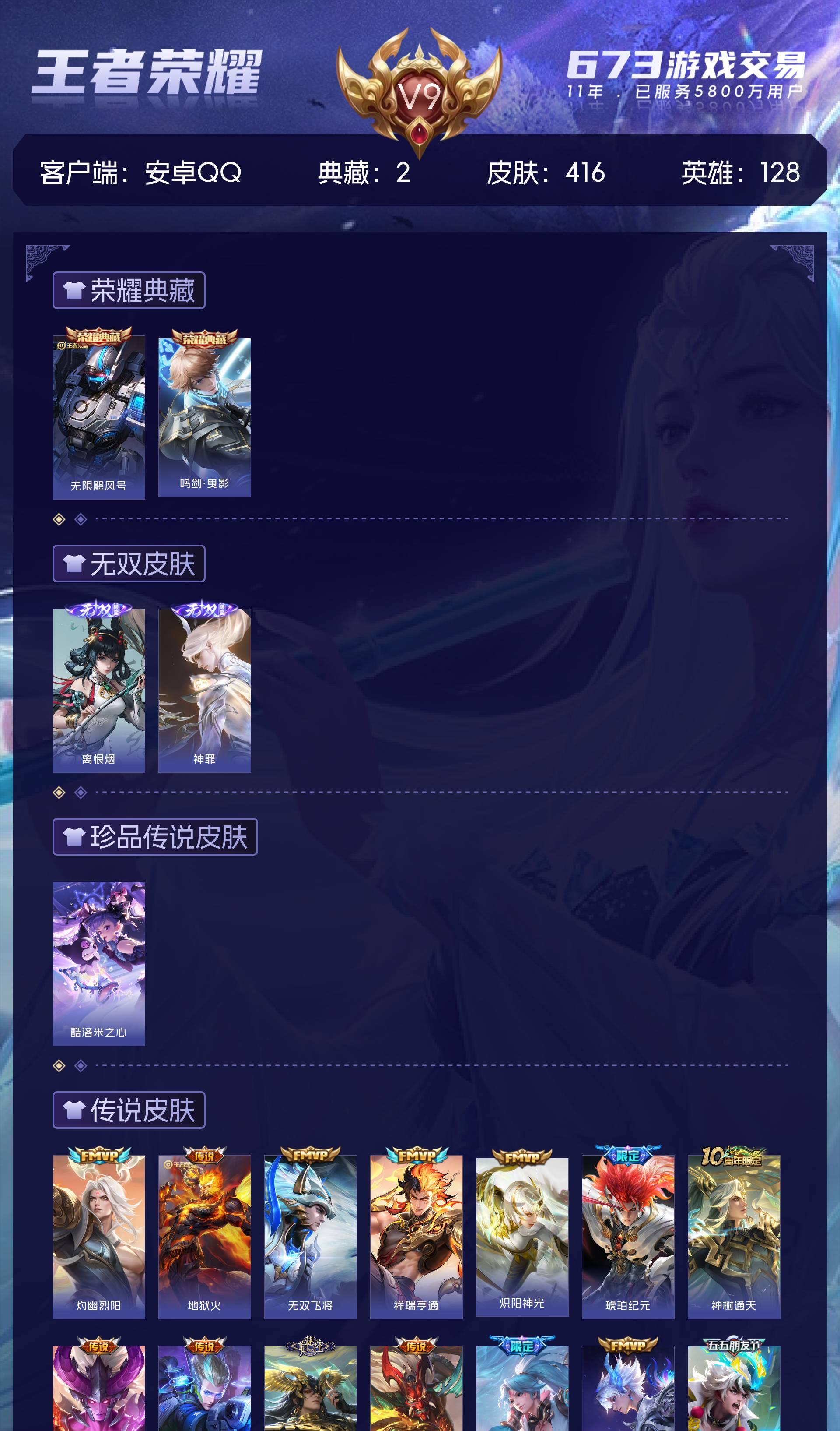 V9 皮肤416 英雄128 绝世王者 荣耀典藏2 无双皮肤2 珍品传说1 星传说7 传说36 其他皮肤376