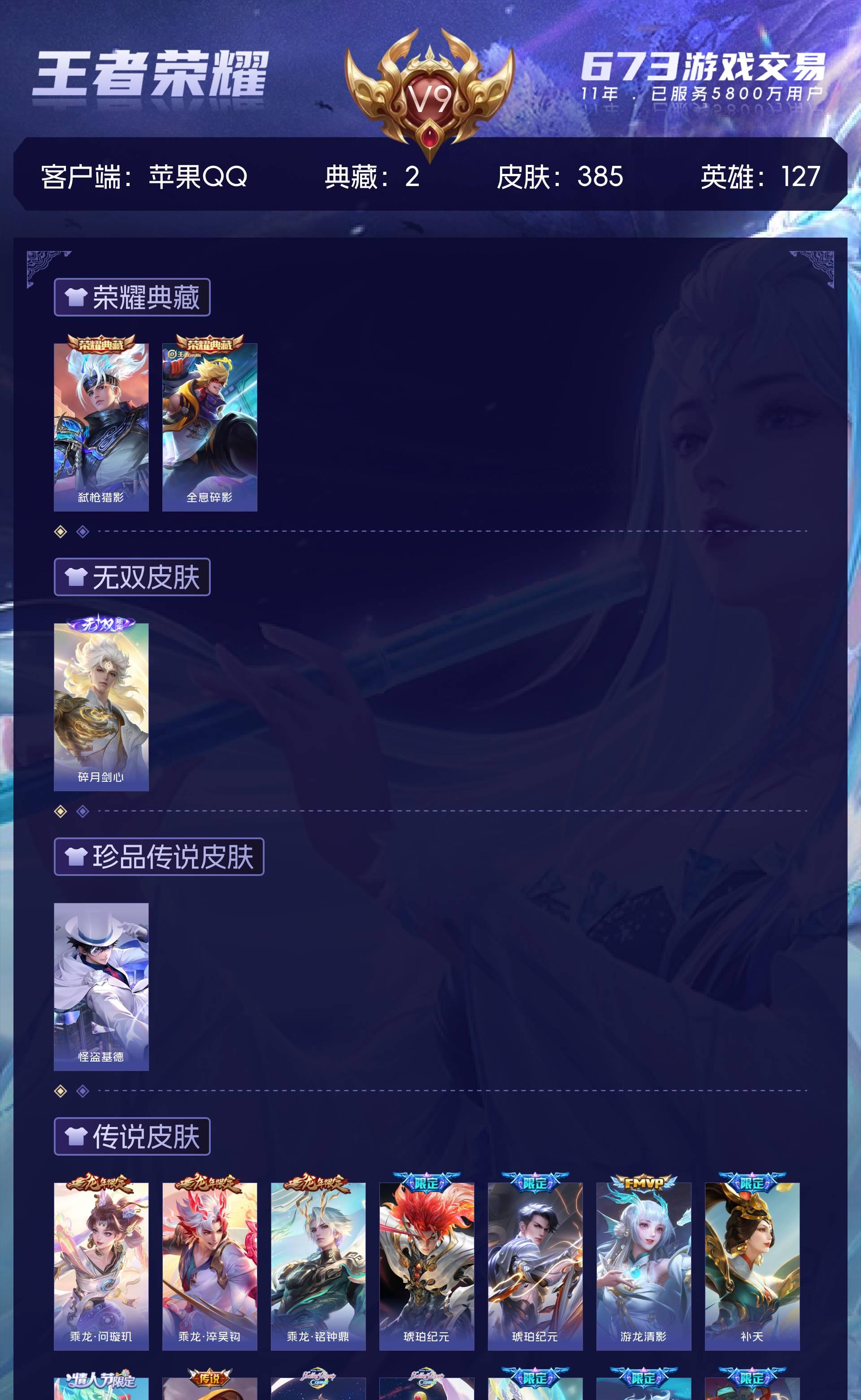苹果QQ/永恒钻石/385皮肤/127英雄/2典藏/0珍品无双/1无双/1珍品传说/36传说/116