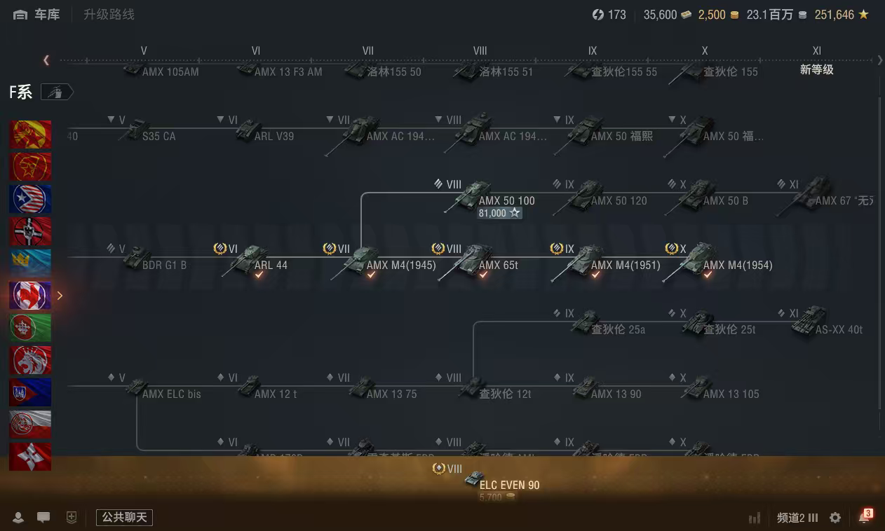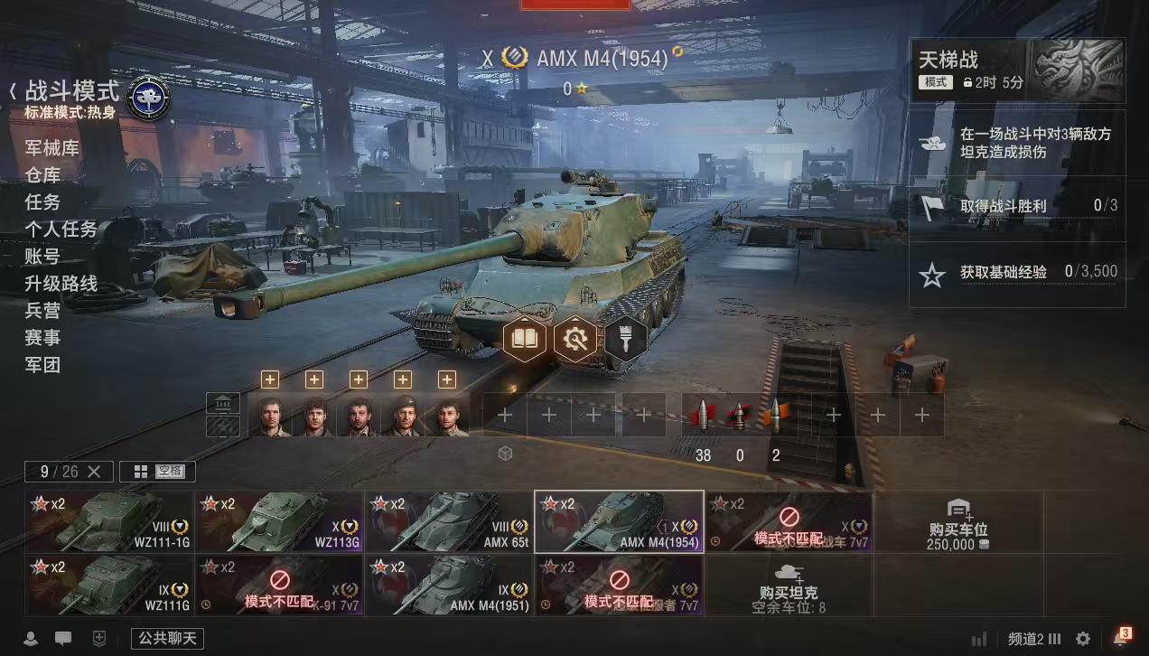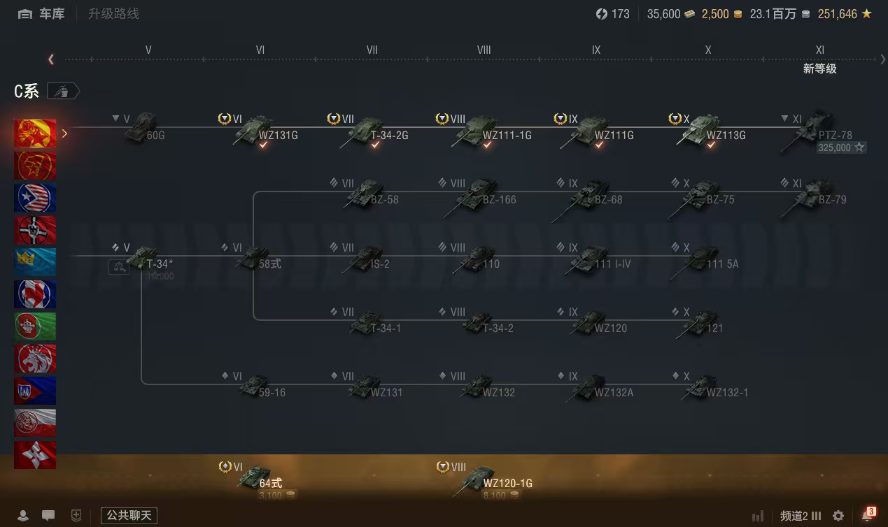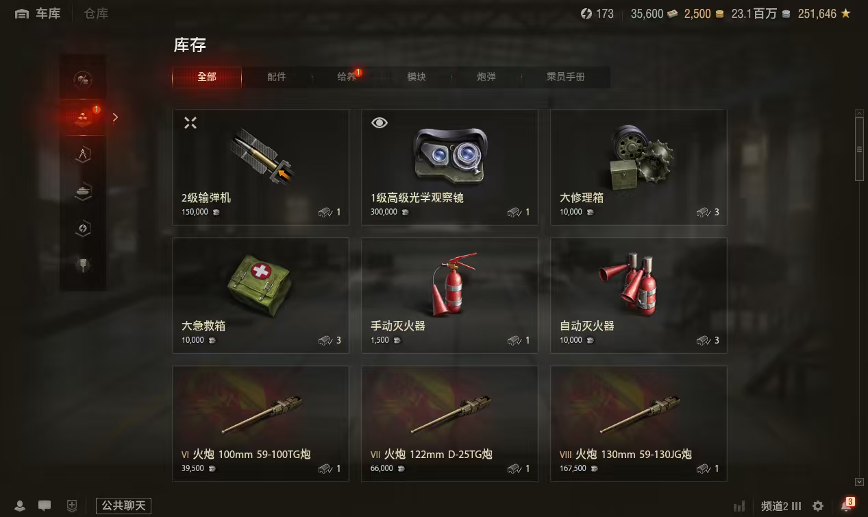 银币2300万、债券35500、金币2500、全局25万、个人储备120个2辆10级车:WZ113