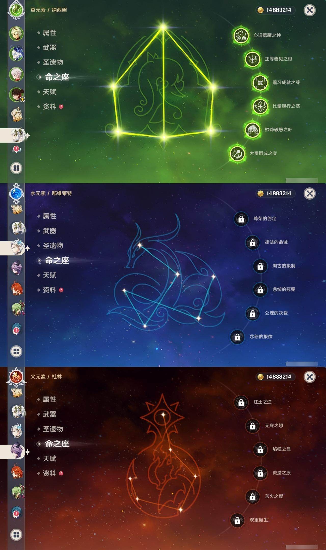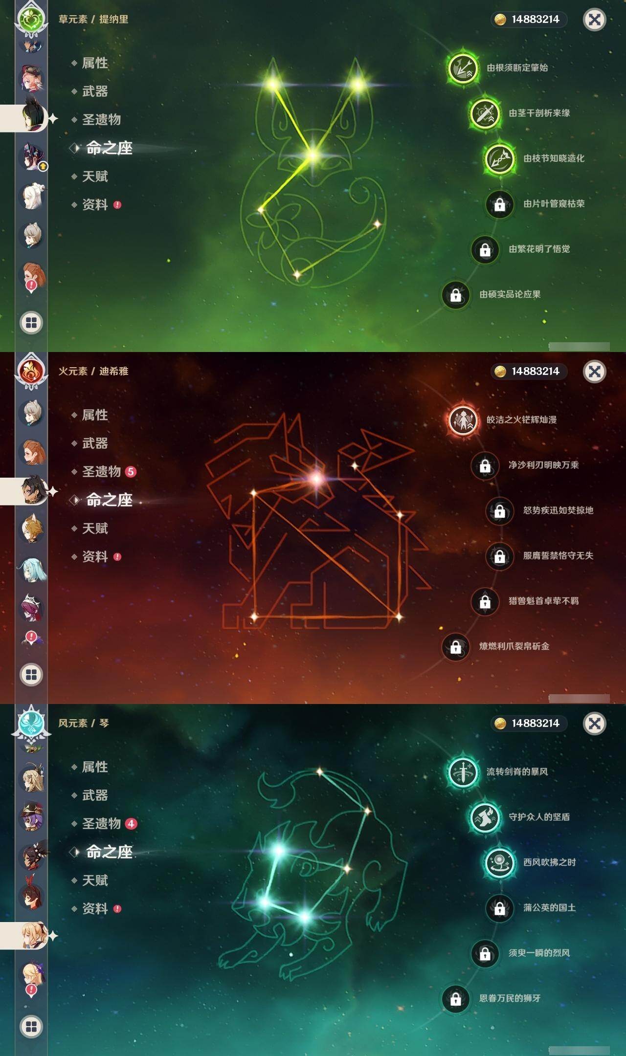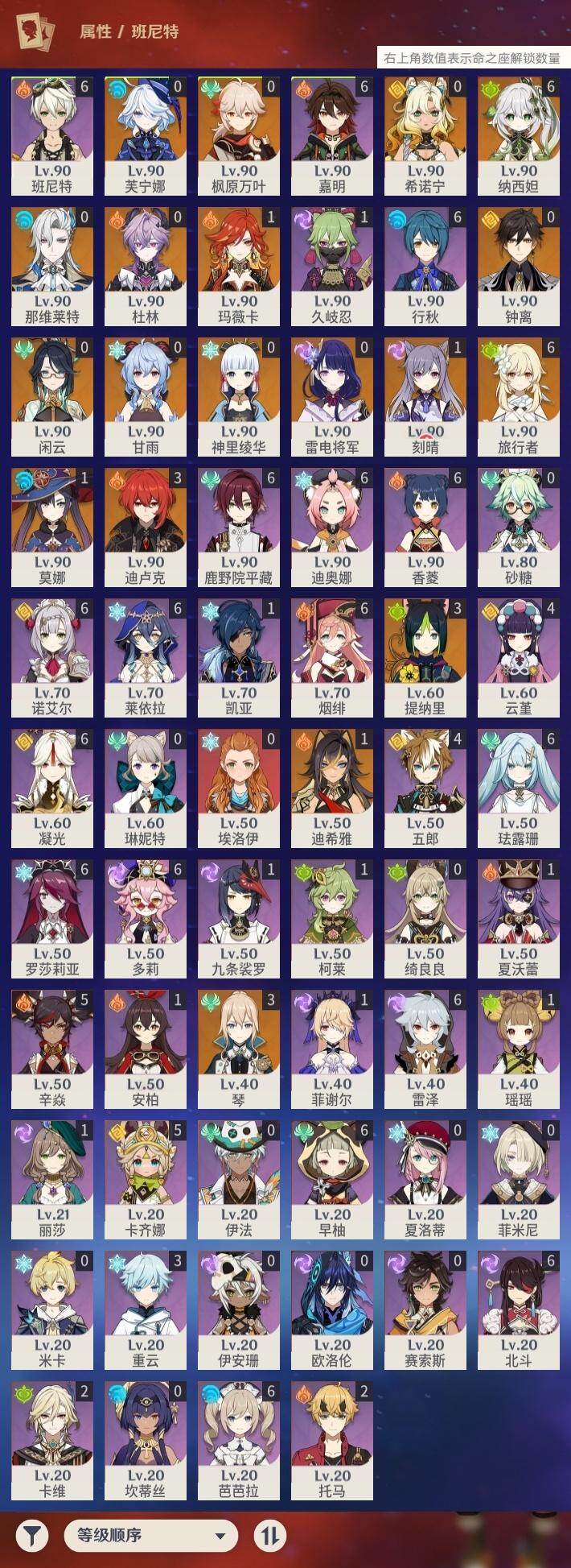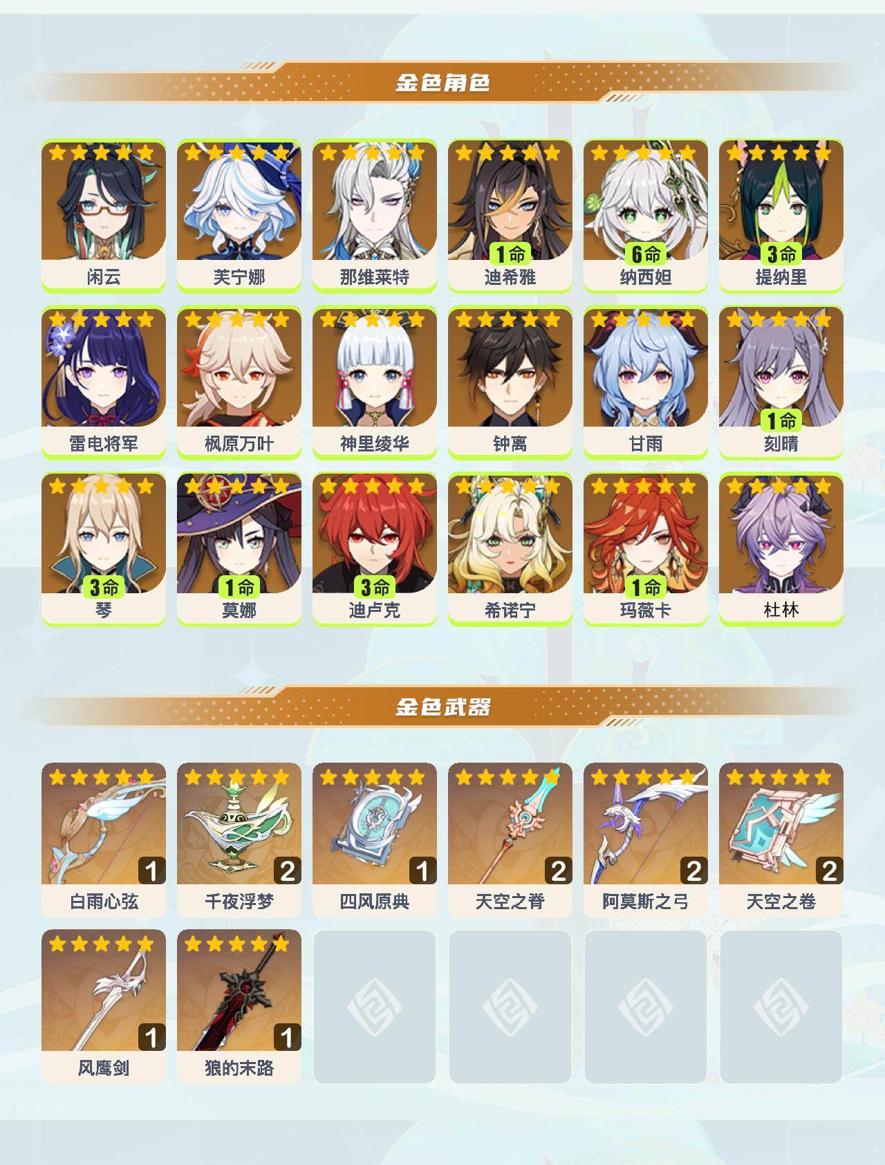 0命闲云,0命芙宁娜,0命那维莱特,1命迪希雅,满命纳西妲,3命提纳里,0命雷电将军,0命枫原万叶,0命神里绫华,0命钟离,0命甘雨,1命刻晴,3命琴,1命莫娜,3命迪卢克,0命希诺宁,1命玛薇卡,0命杜林,精1白雨心弦,精2千夜浮梦,精1四风原典,精2天空之脊,精2阿莫斯之弓,精2天空之卷,精1风鹰剑,精1狼的末路