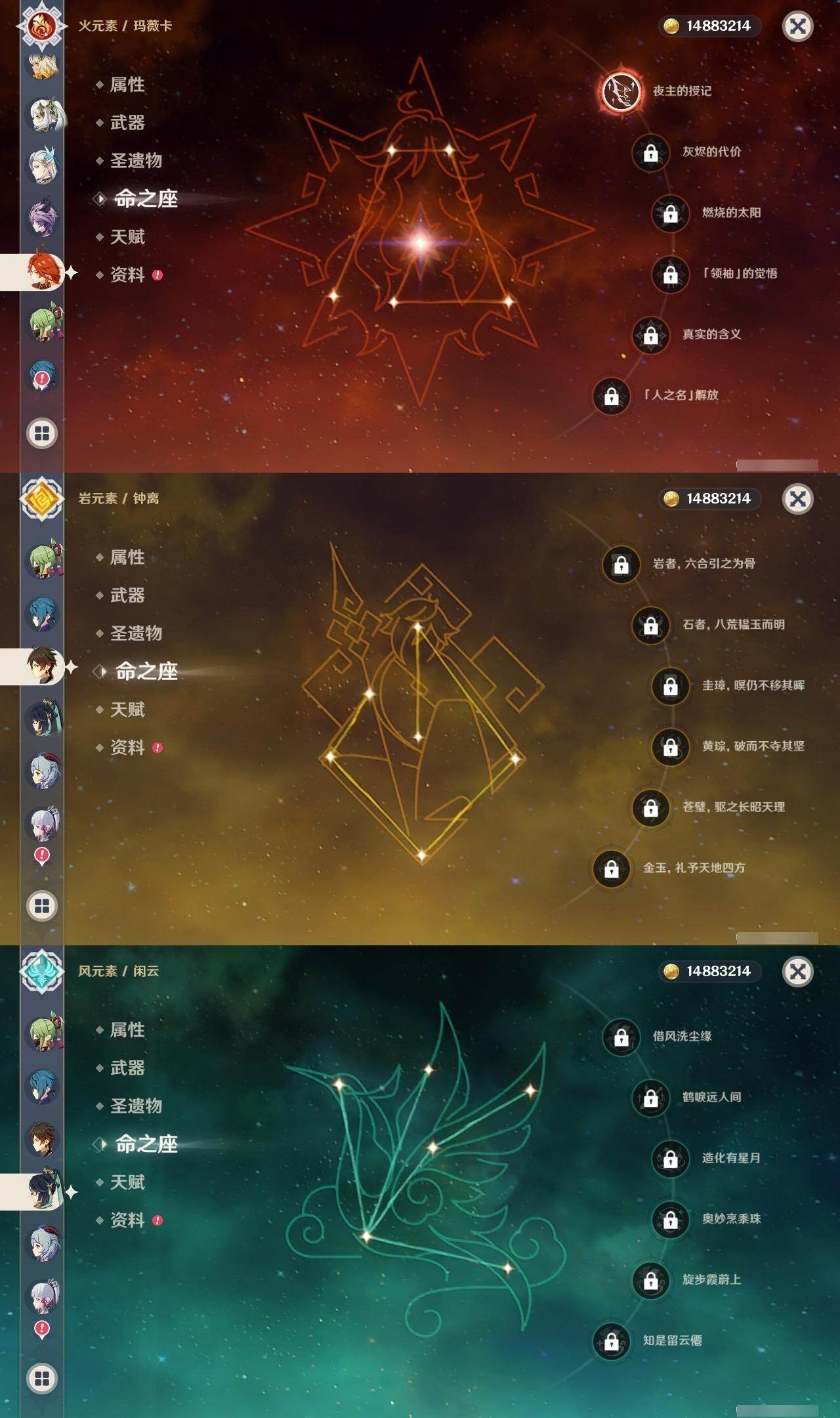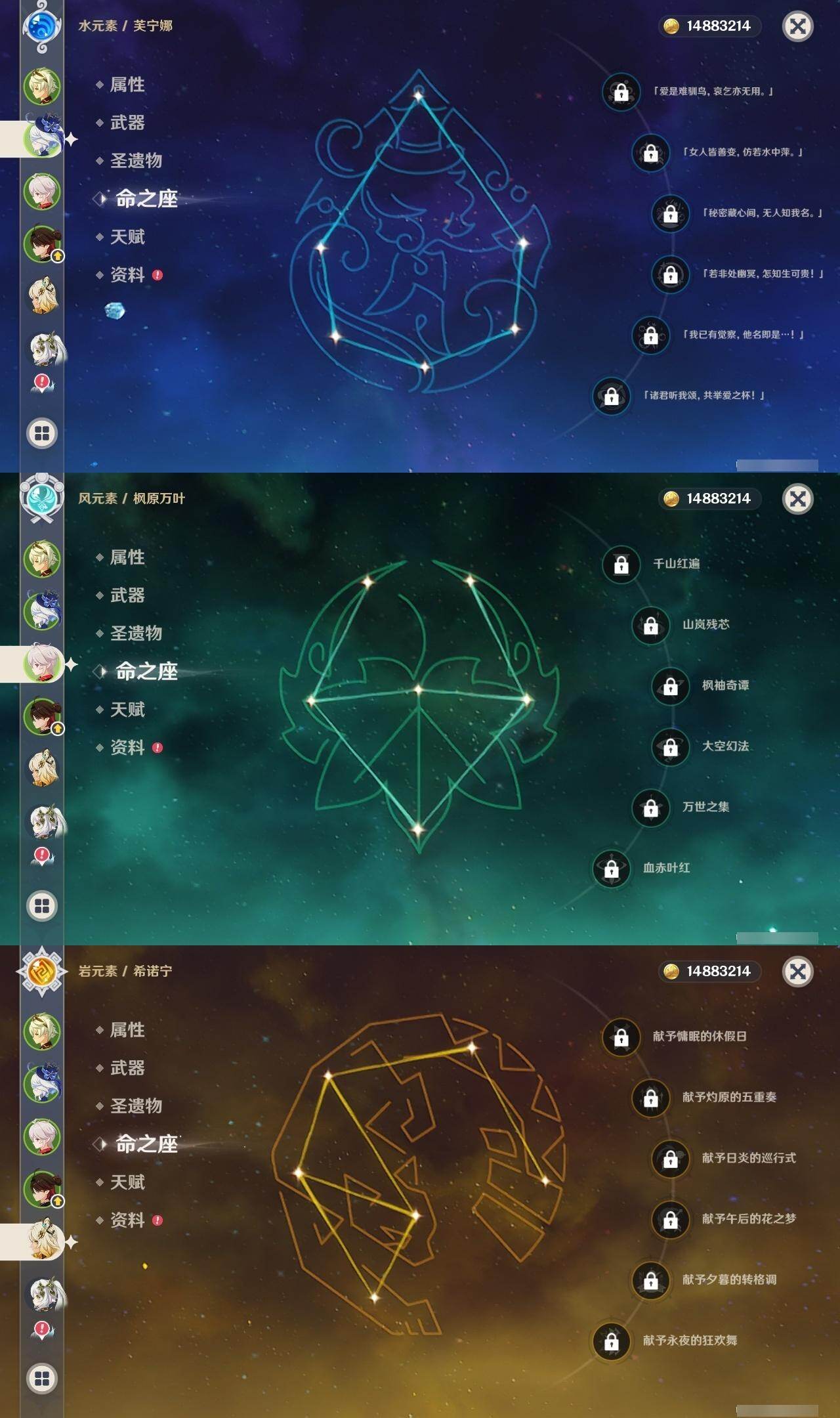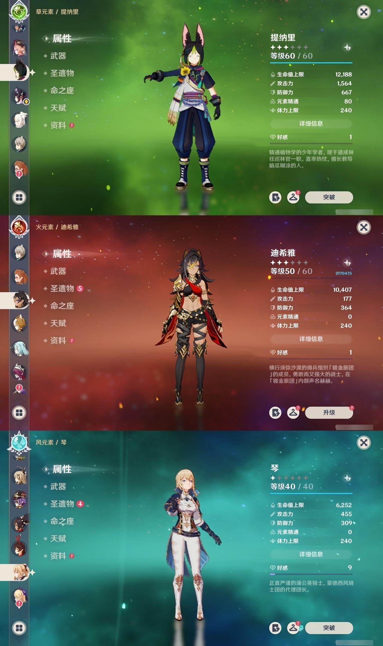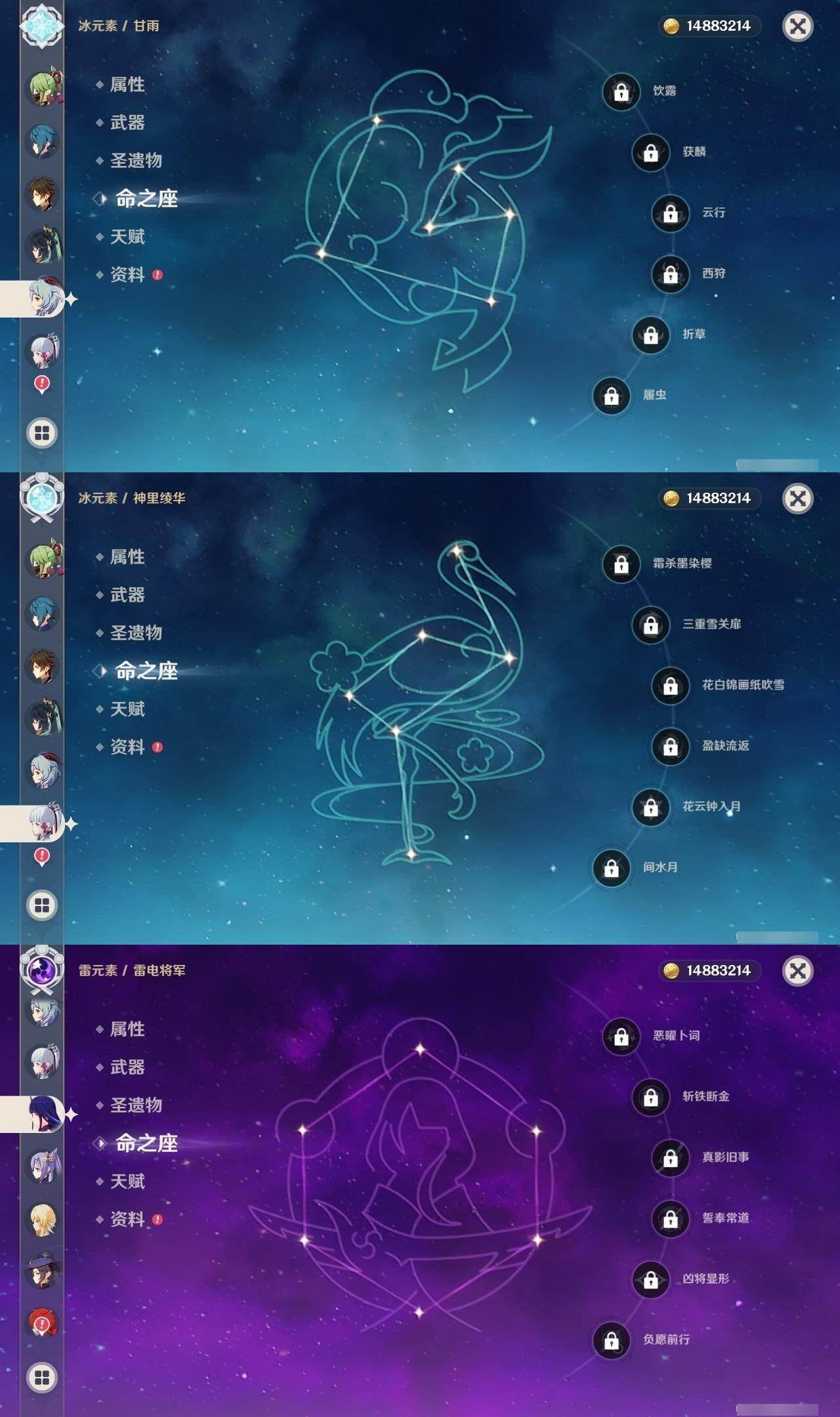 0命闲云,0命芙宁娜,0命那维莱特,1命迪希雅,满命纳西妲,3命提纳里,0命雷电将军,0命枫原万叶,0命神里绫华,0命钟离,0命甘雨,1命刻晴,3命琴,1命莫娜,3命迪卢克,0命希诺宁,1命玛薇卡,0命杜林,精1白雨心弦,精2千夜浮梦,精1四风原典,精2天空之脊,精2阿莫斯之弓,精2天空之卷,精1风鹰剑,精1狼的末路