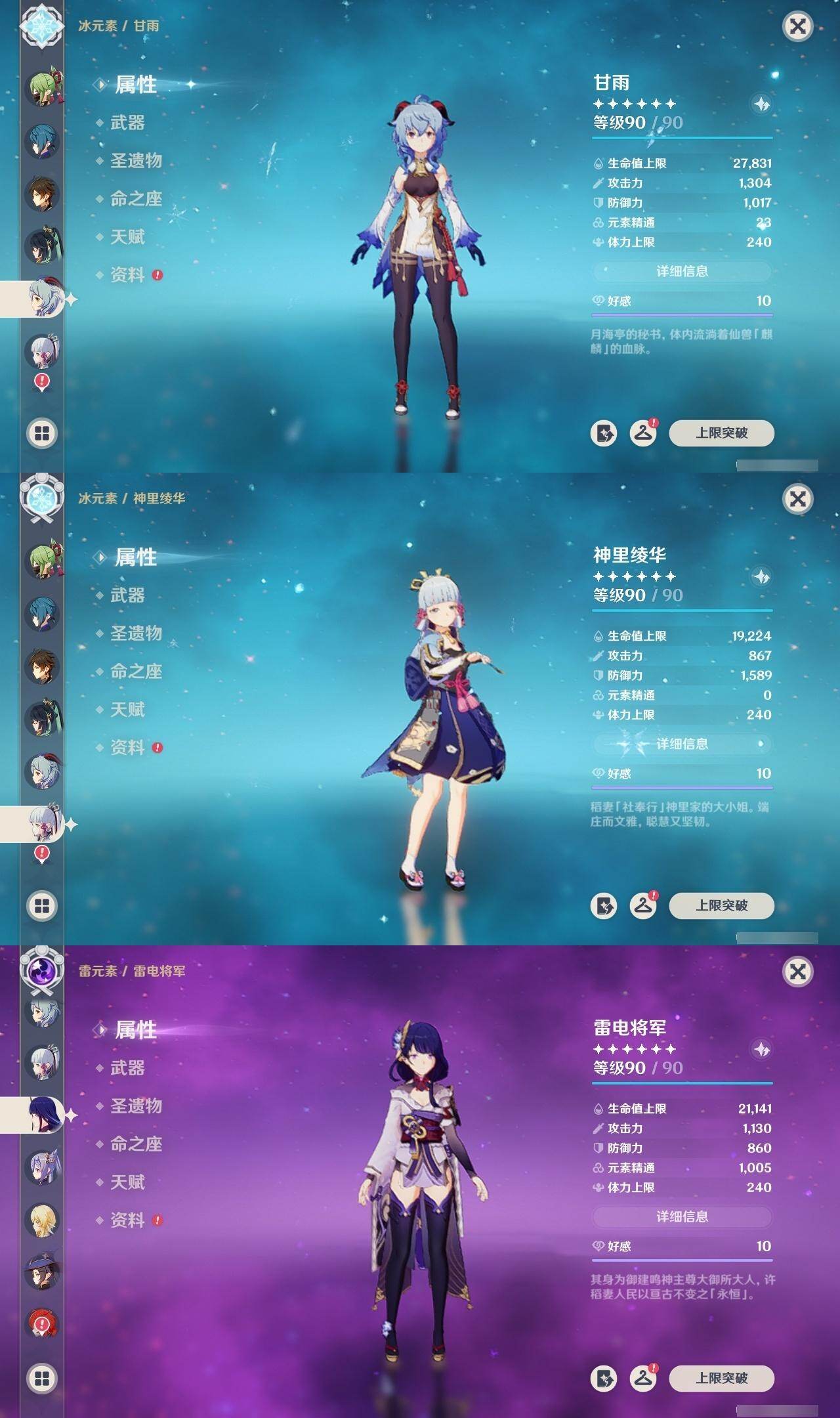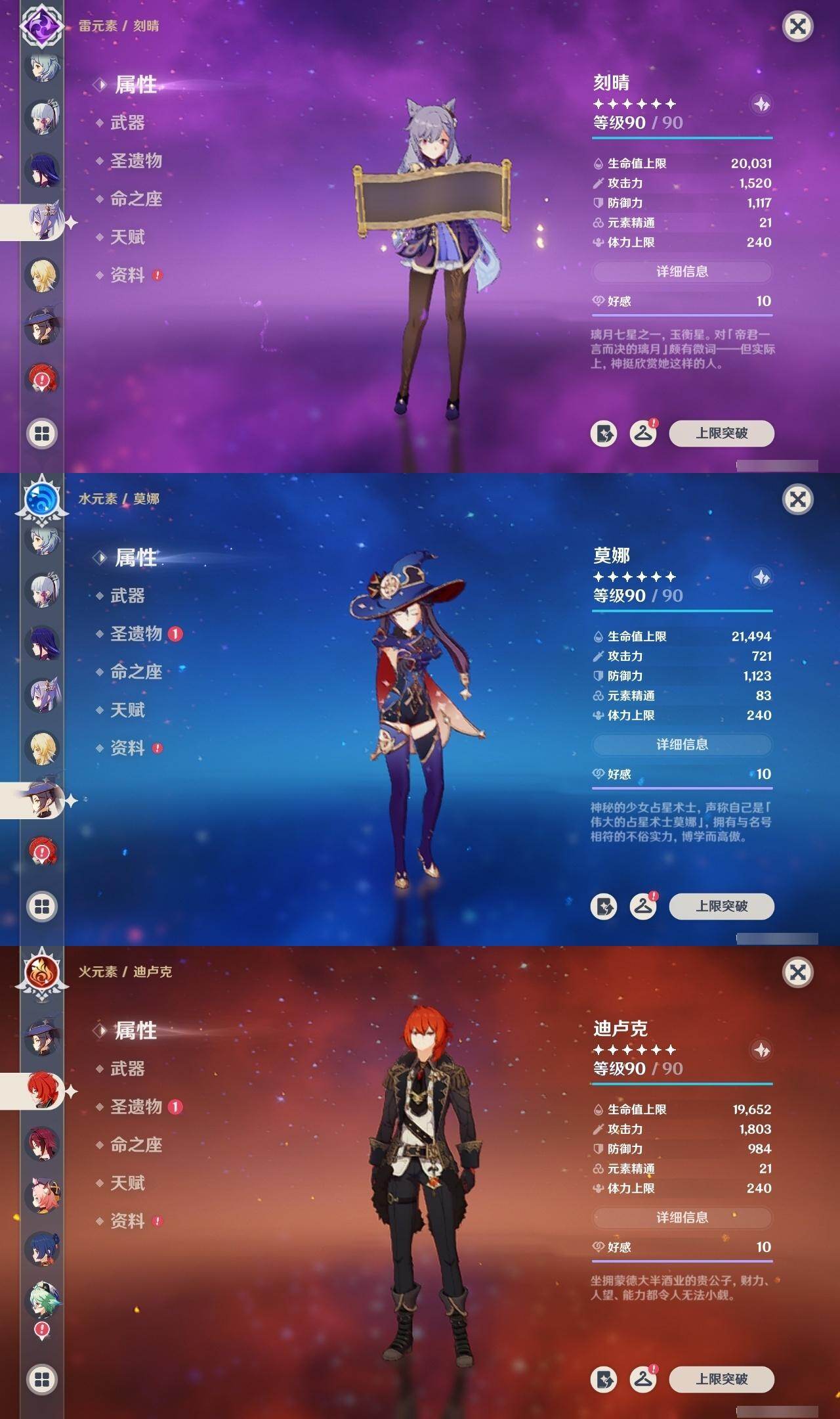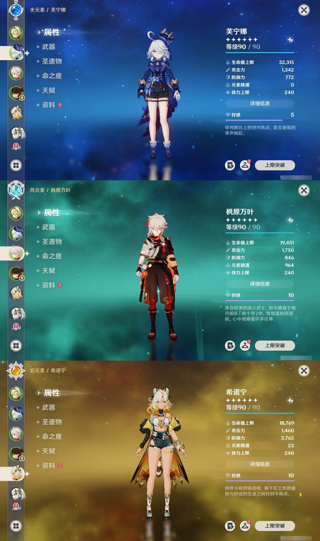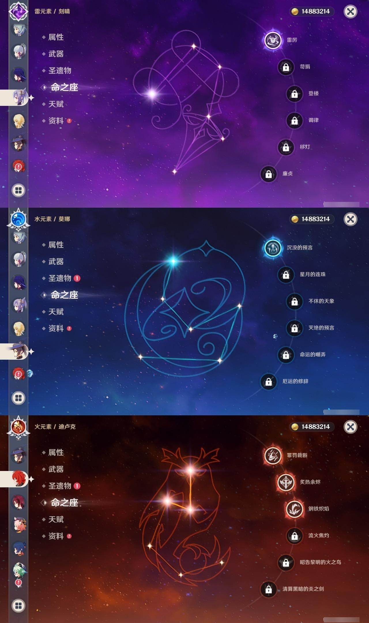 0命闲云,0命芙宁娜,0命那维莱特,1命迪希雅,满命纳西妲,3命提纳里,0命雷电将军,0命枫原万叶,0命神里绫华,0命钟离,0命甘雨,1命刻晴,3命琴,1命莫娜,3命迪卢克,0命希诺宁,1命玛薇卡,0命杜林,精1白雨心弦,精2千夜浮梦,精1四风原典,精2天空之脊,精2阿莫斯之弓,精2天空之卷,精1风鹰剑,精1狼的末路