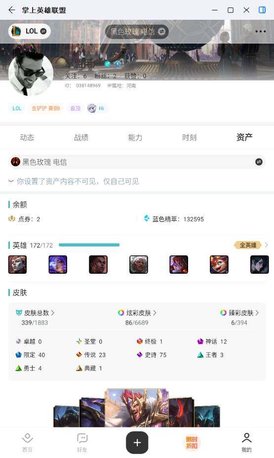 未定级段位-172英雄-339皮肤-86炫彩-1终极-12神话-40限定-23传说-75史诗