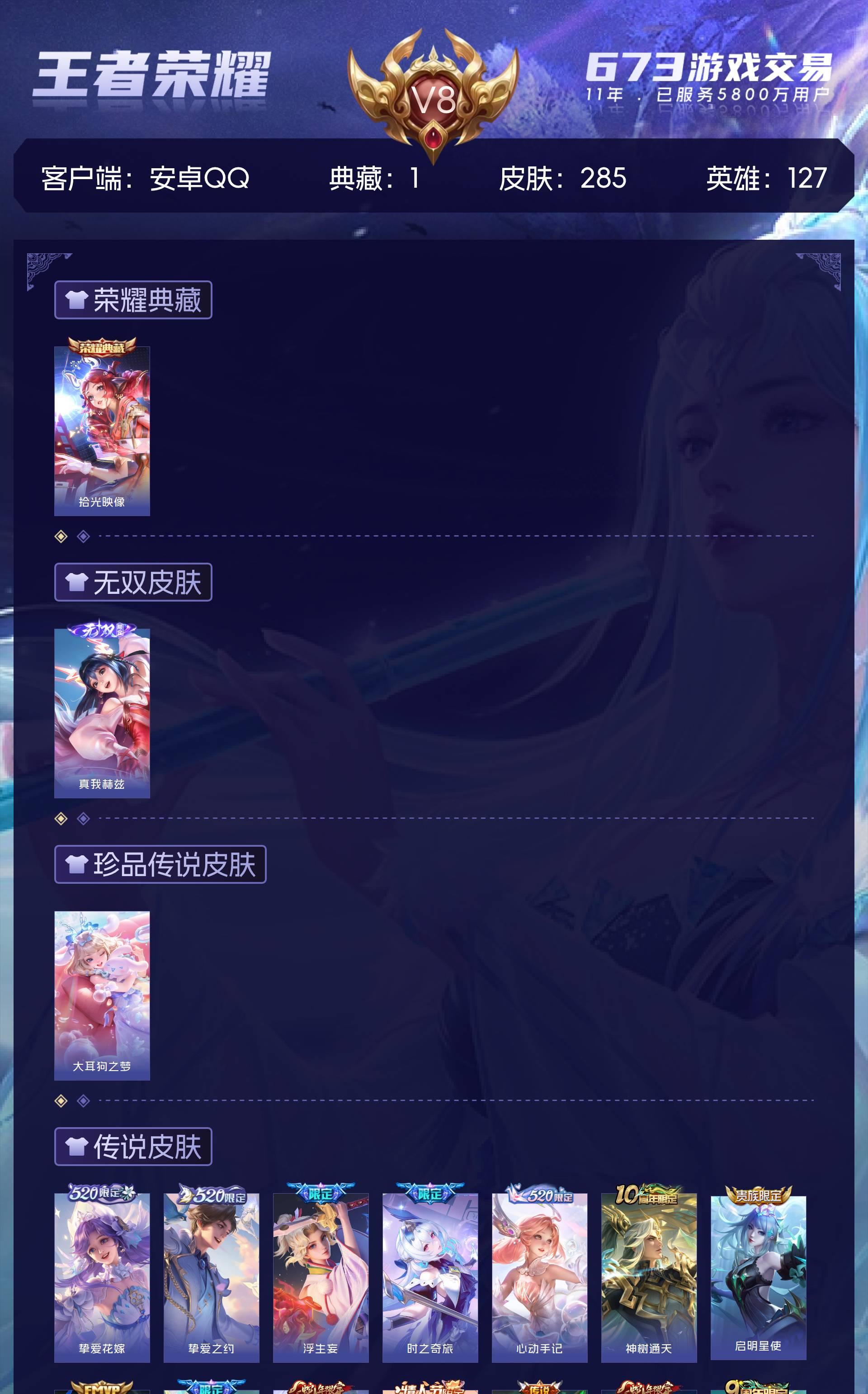V8 皮肤285 英雄127 无双王者 荣耀典藏1 无双皮肤1 珍品传说1 星传说3 传说20 其他