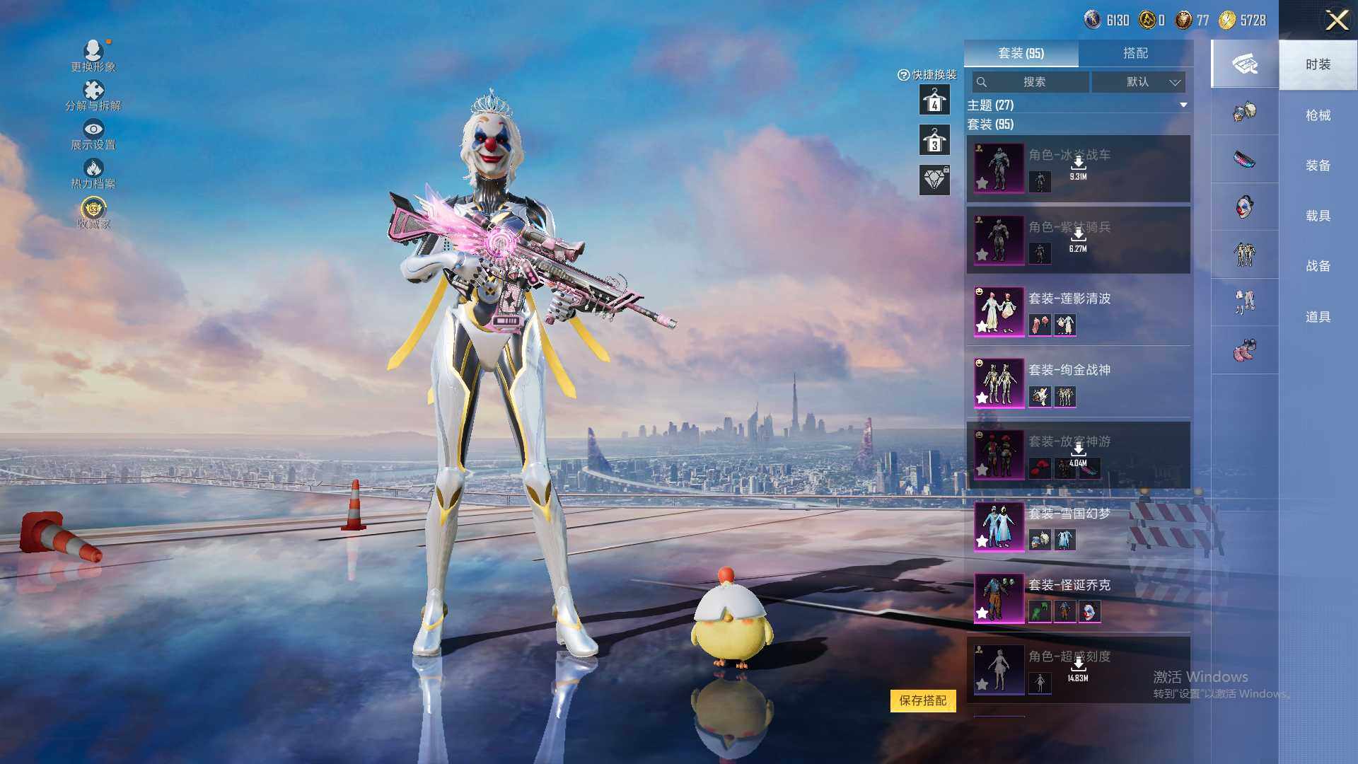 【粉色套装】:粉装-怪诞乔克,粉装-雪国幻梦,粉装-放客神游,粉装-绚金战神,粉装-莲影清波,角色-冰
