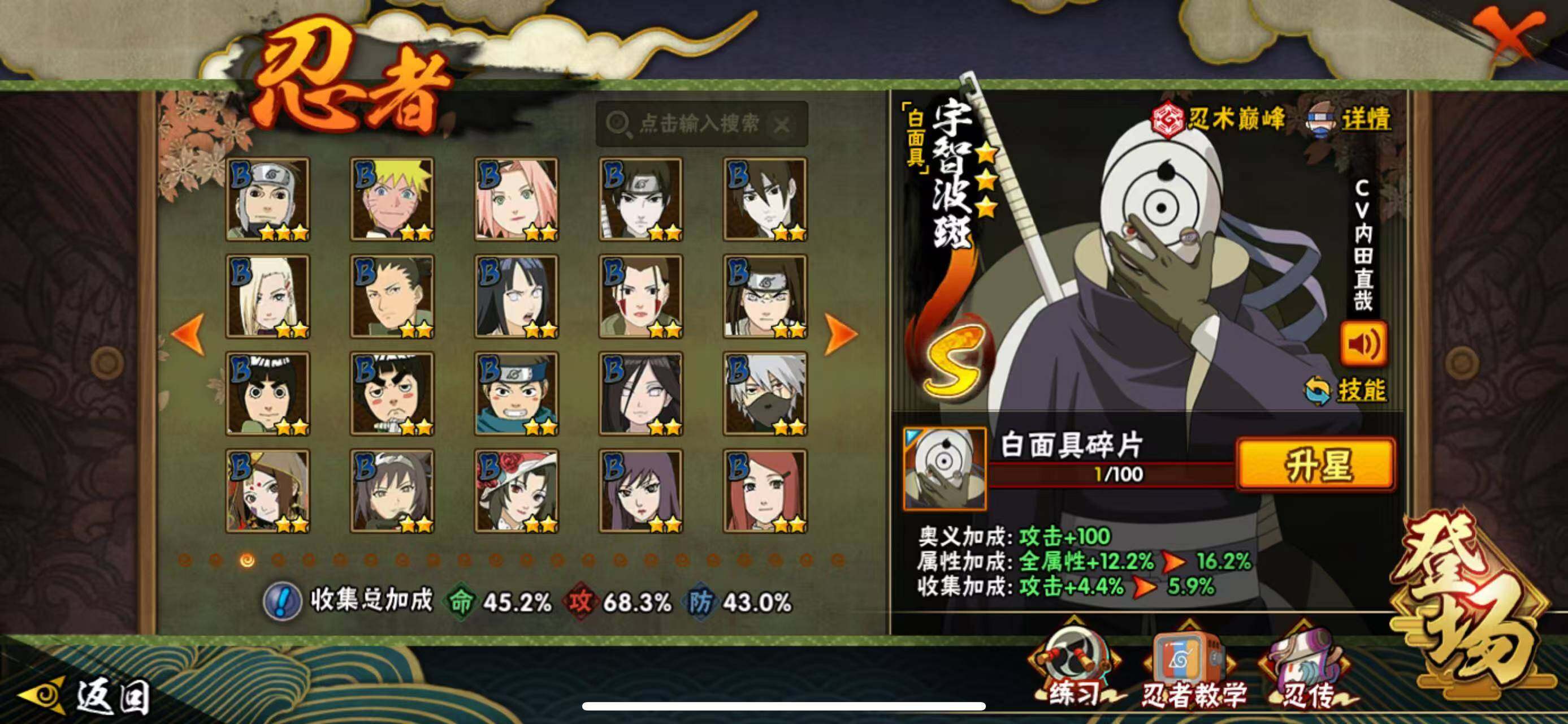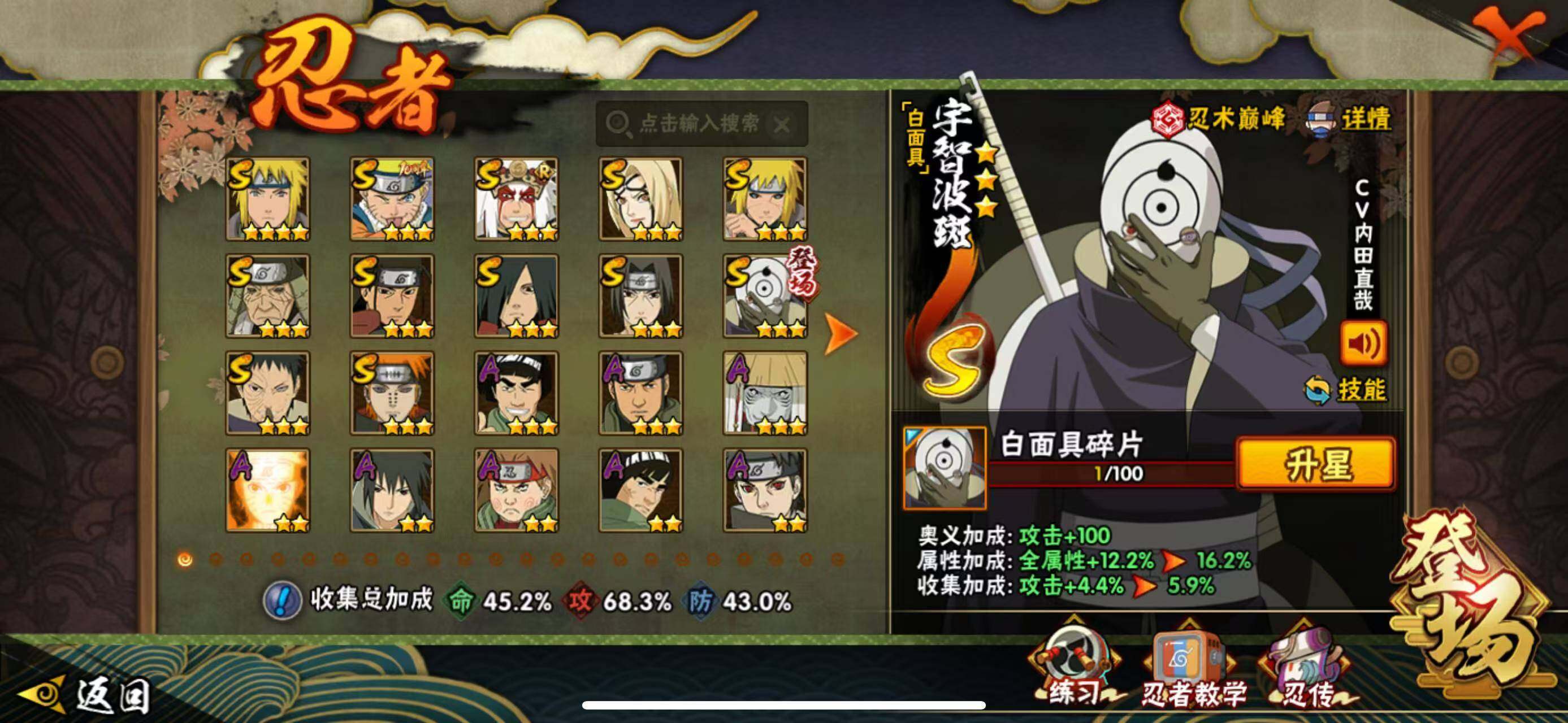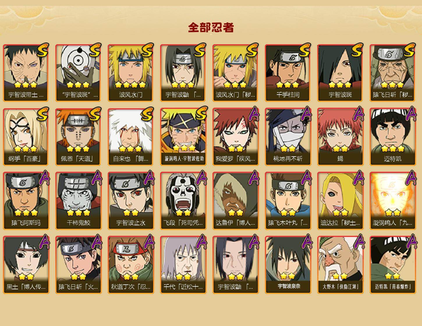 【S级忍者】:猿飞日斩「秽土转生」(3星),波风水门「秽土转生」(3星),宇智波带土「忍界大战」(3星),宇智波鼬「须佐能乎」(3星),自来也「舞之豪杰」(3星),纲手「百豪」(3星),千手柱间(3星),宇智波斑(3星),波风水门(4星),佩恩「天道」(3星),宇智波斑 「白面具」(3星宇智波斑「白面具」),漩涡鸣人·宇智波佐助(3星)