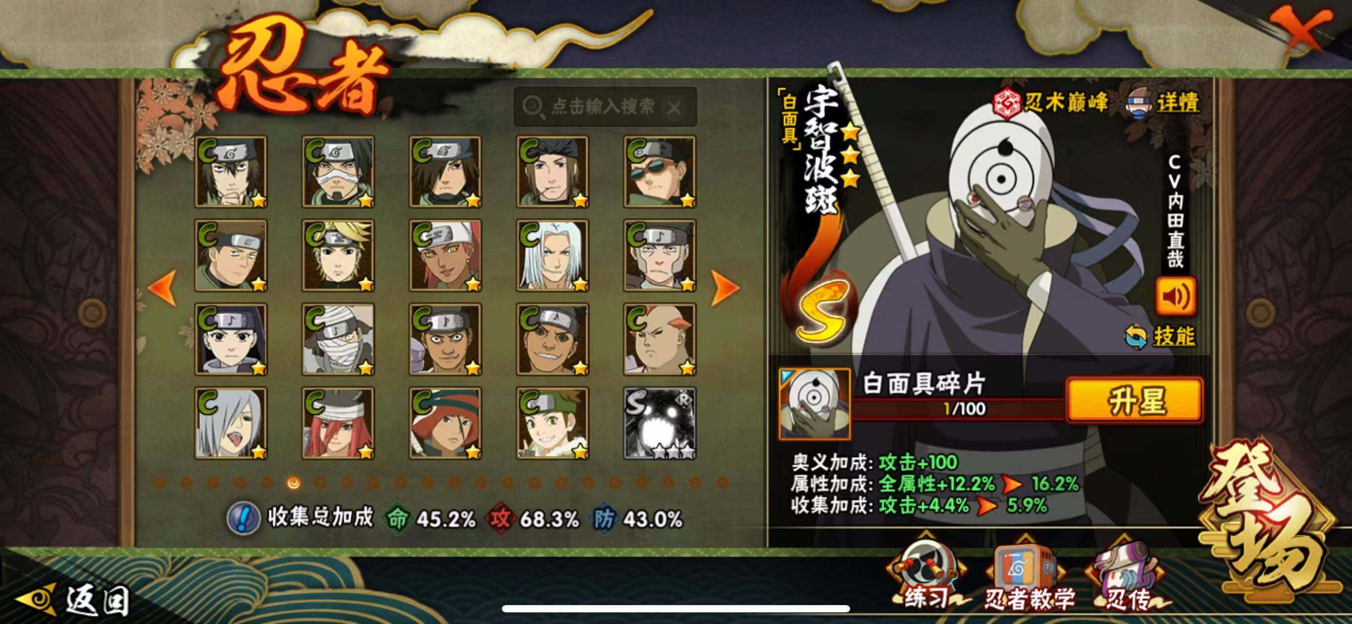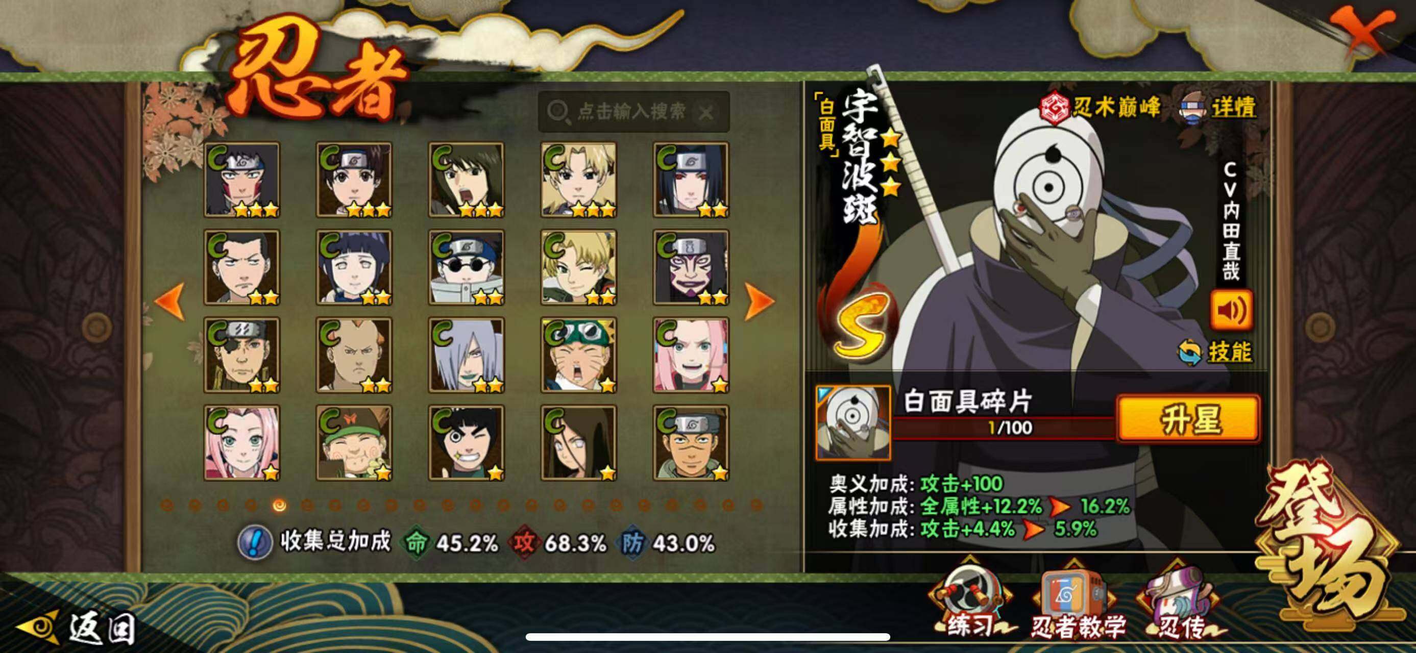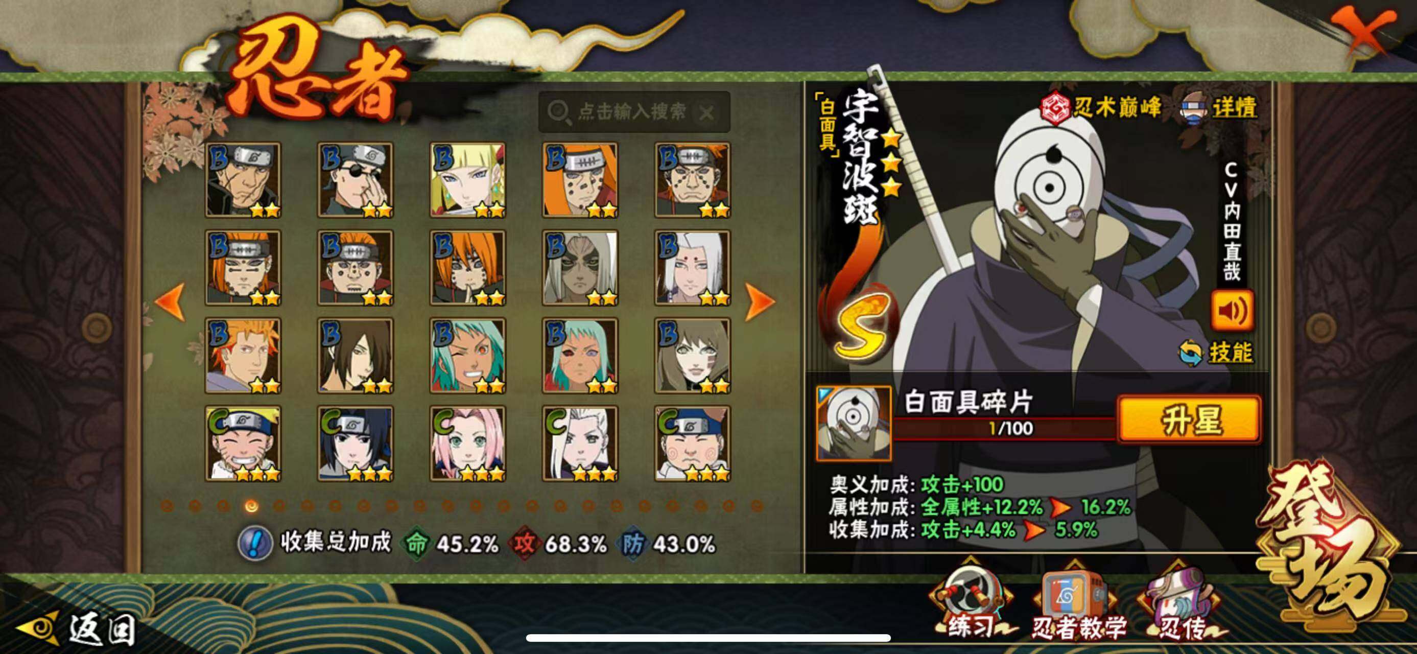 【S级忍者】:猿飞日斩「秽土转生」(3星),波风水门「秽土转生」(3星),宇智波带土「忍界大战」(3星),宇智波鼬「须佐能乎」(3星),自来也「舞之豪杰」(3星),纲手「百豪」(3星),千手柱间(3星),宇智波斑(3星),波风水门(4星),佩恩「天道」(3星),宇智波斑 「白面具」(3星宇智波斑「白面具」),漩涡鸣人·宇智波佐助(3星)