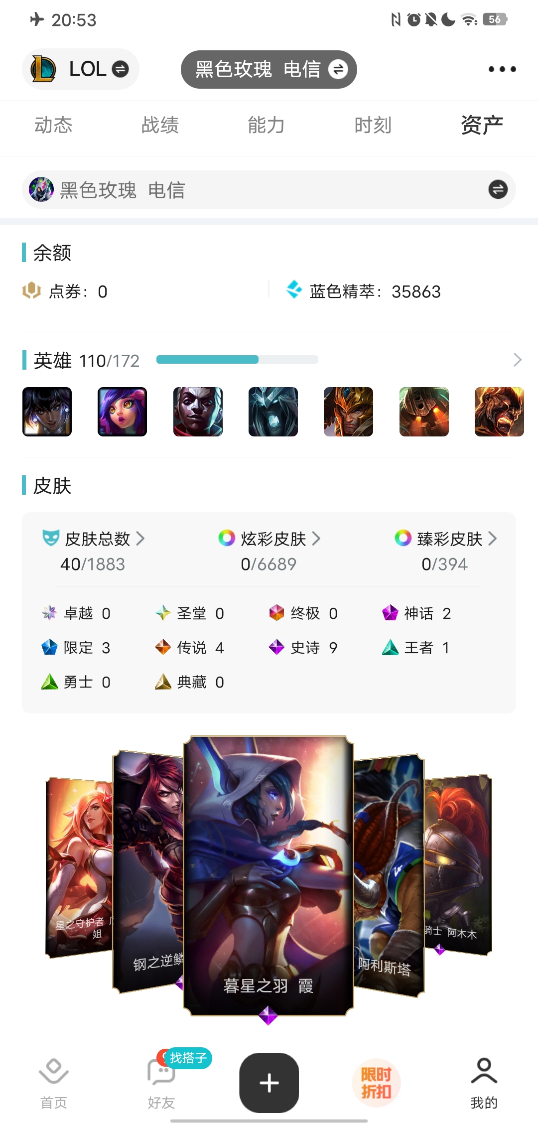 皮肤40个,英雄110,等级186