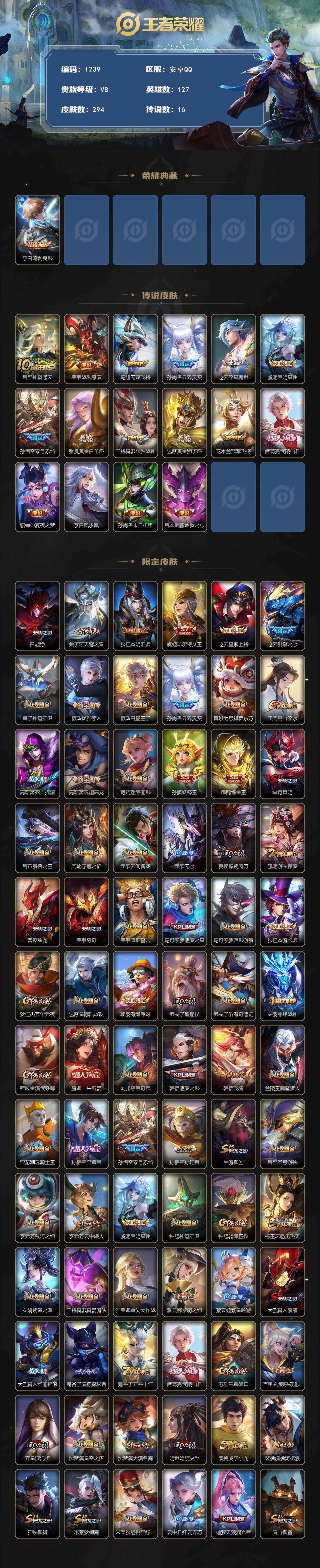 2306334 限定皮肤多 梅西 至尊宝 冰封战神 赵云宝马皮 水晶309抽 安卓Q-V8-最强王者段位-127英雄-294皮肤-1典藏皮肤-16传说-84史诗