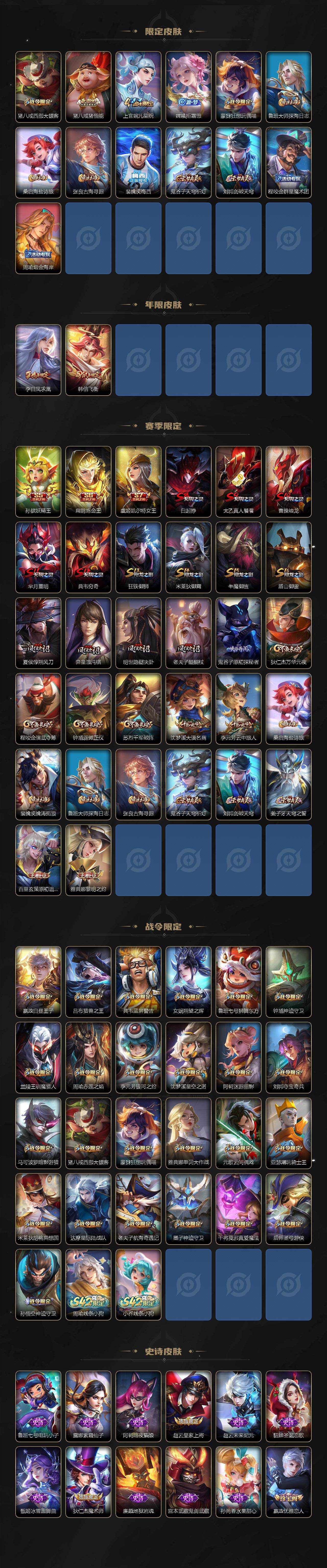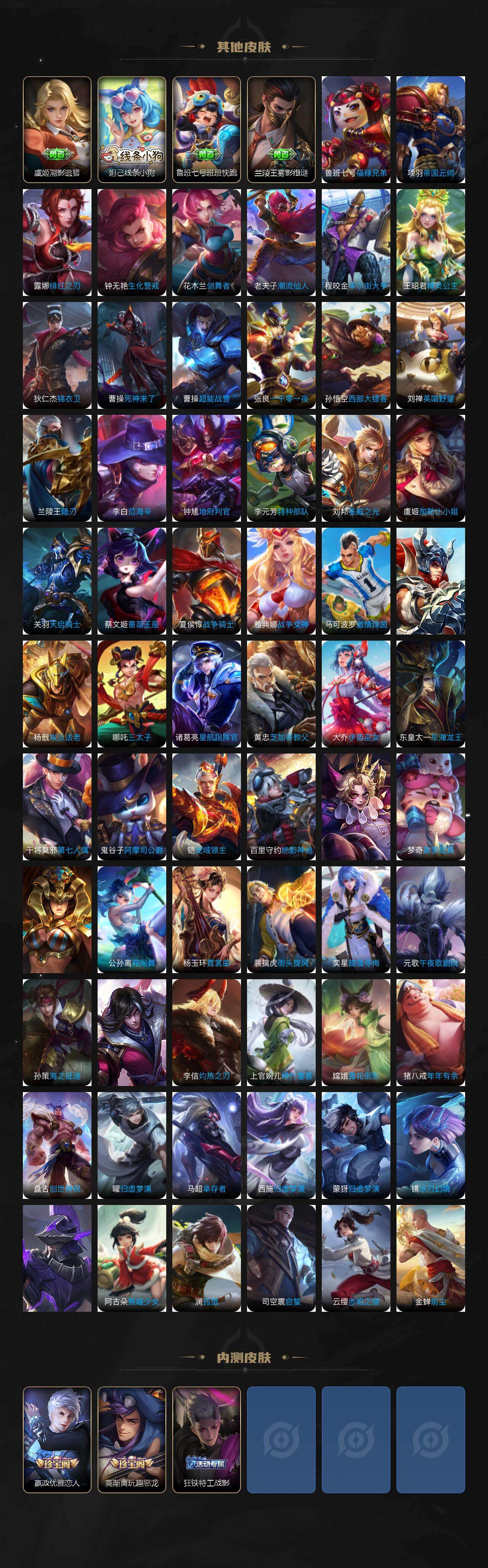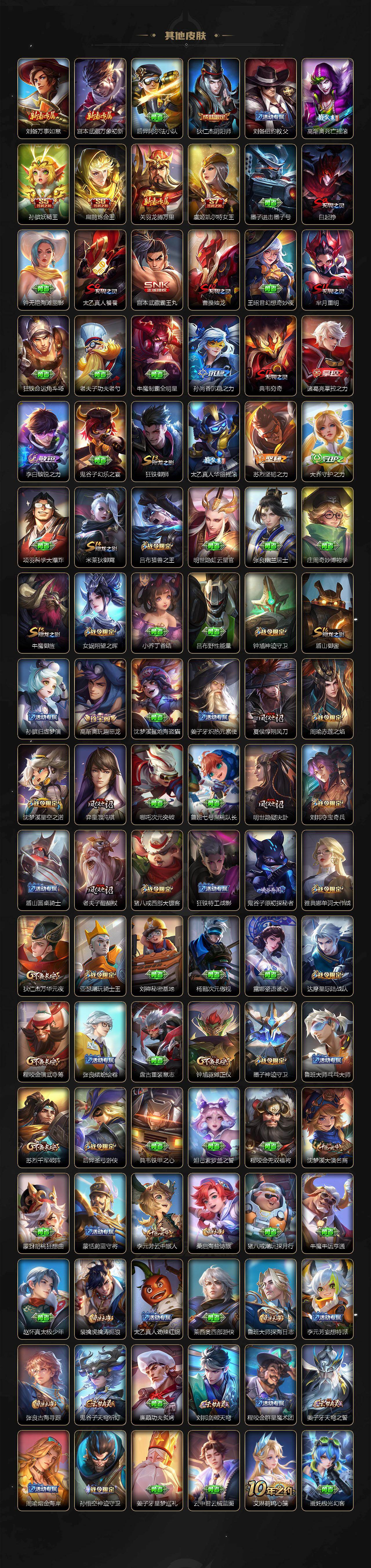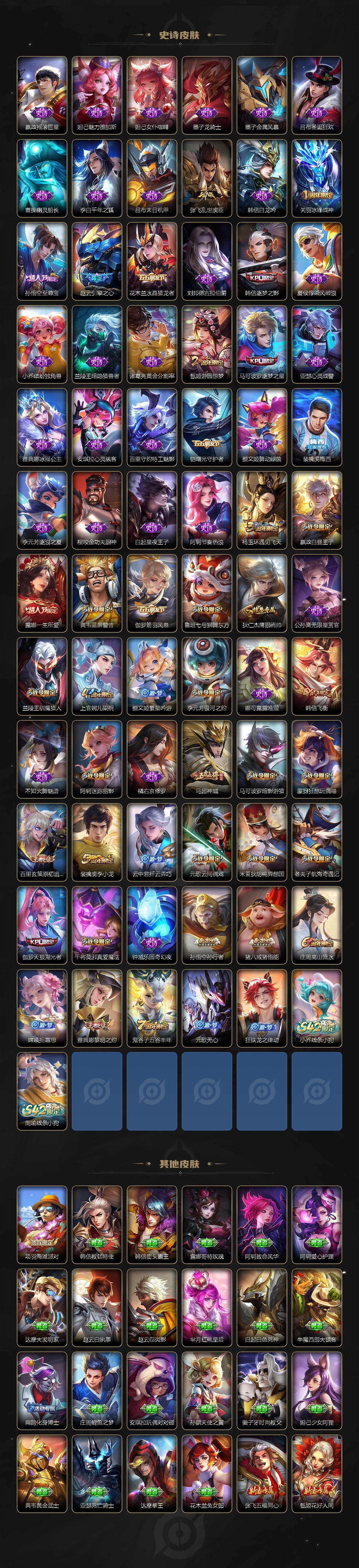 【传说皮肤】:后羿神树通天,典韦战鼓燎原,马超无双飞将,孙尚香异界灵契,赵云淬星耀世,虞姬启明星使,孙悟空零号赤焰,张良黄金白羊座,干将莫邪久胜战神
