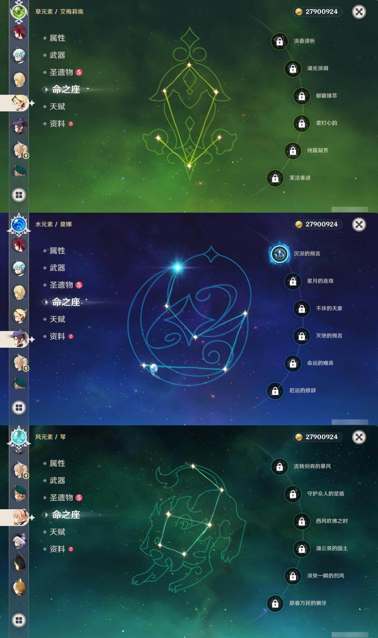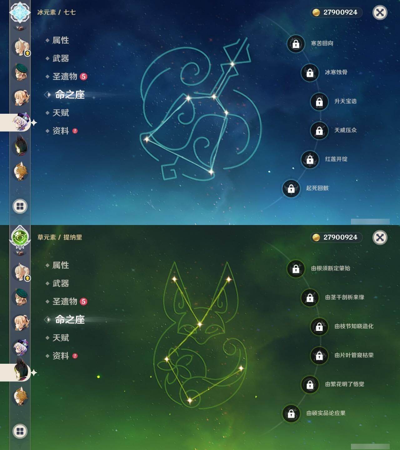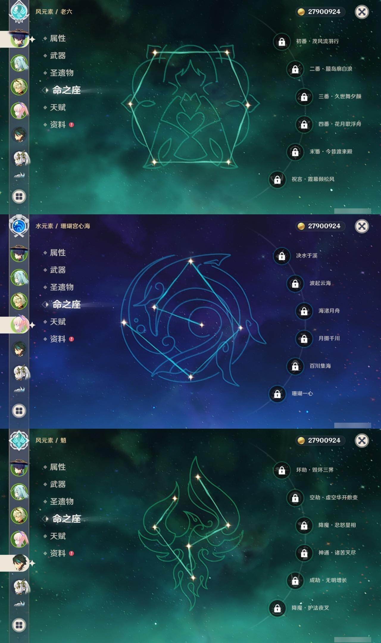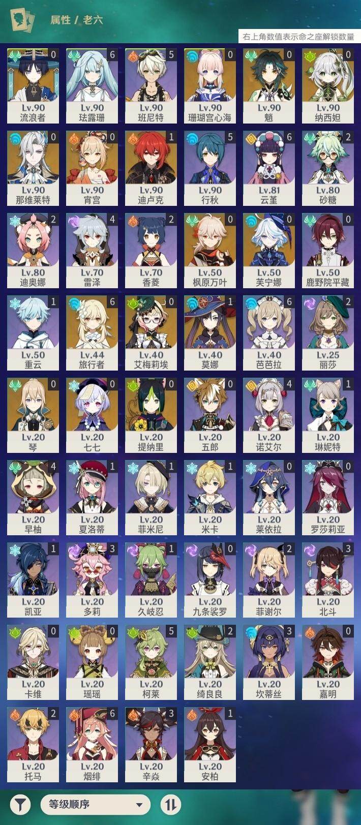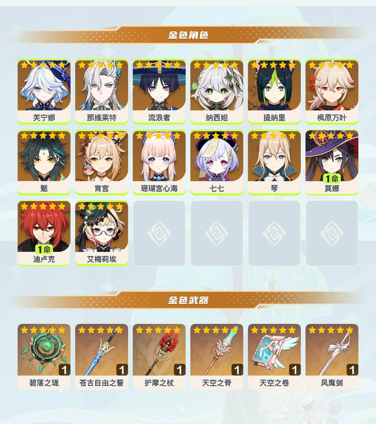 0命芙宁娜,0命那维莱特,0命流浪者,0命纳西妲,0命提纳里,0命枫原万叶,0命魈,0命宵宫,0命珊瑚宫心海,0命七七,0命琴,1命莫娜,1命迪卢克,0命艾梅莉埃,精1碧落之珑,精1苍古自由之誓,精1护摩之杖,精1天空之脊,精1天空之卷,精1风鹰剑