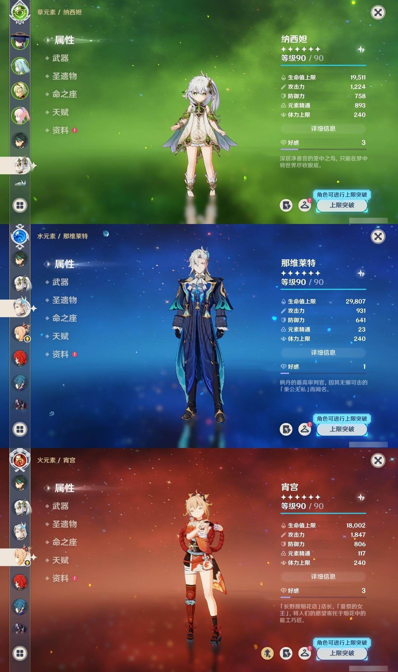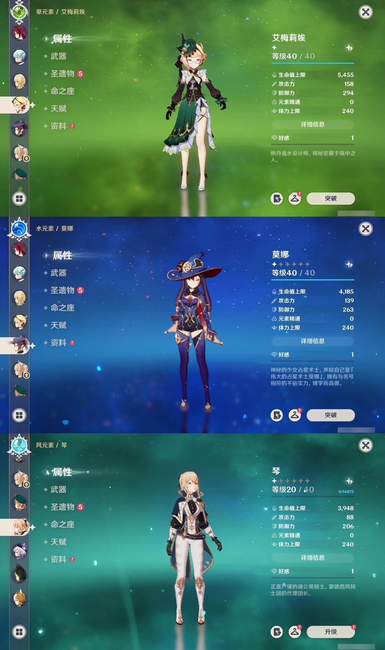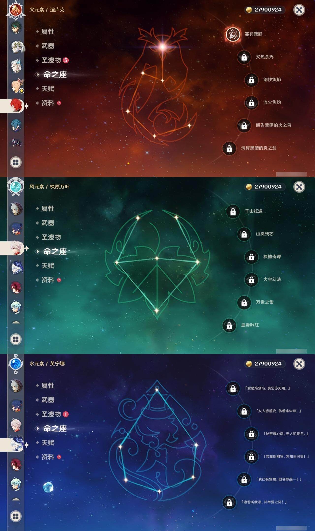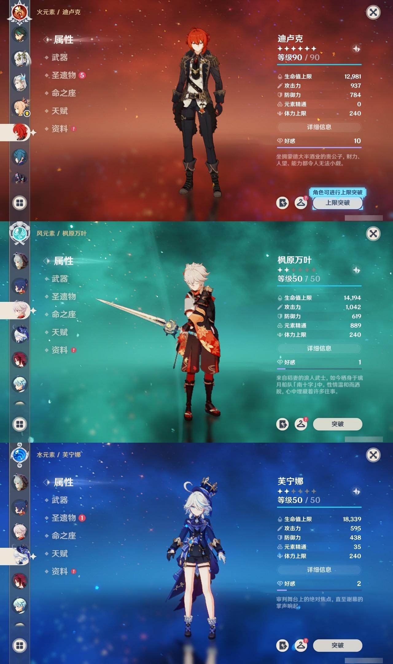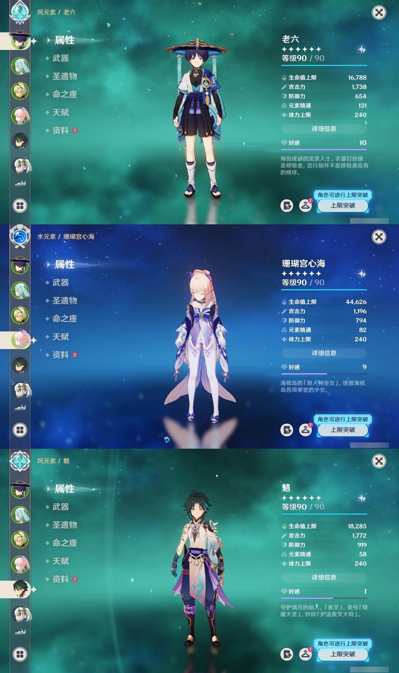 0命芙宁娜,0命那维莱特,0命流浪者,0命纳西妲,0命提纳里,0命枫原万叶,0命魈,0命宵宫,0命珊瑚宫心海,0命七七,0命琴,1命莫娜,1命迪卢克,0命艾梅莉埃,精1碧落之珑,精1苍古自由之誓,精1护摩之杖,精1天空之脊,精1天空之卷,精1风鹰剑