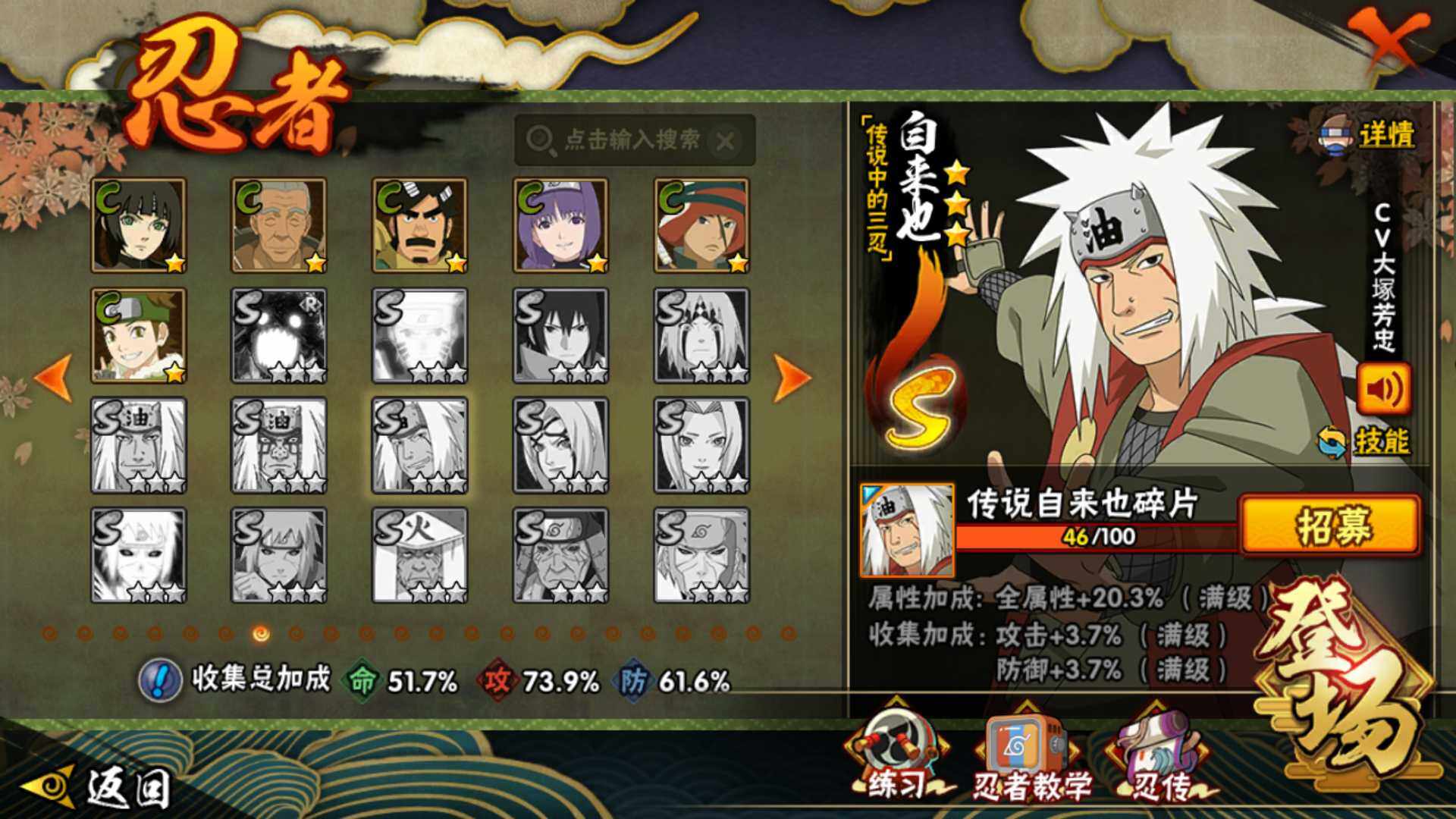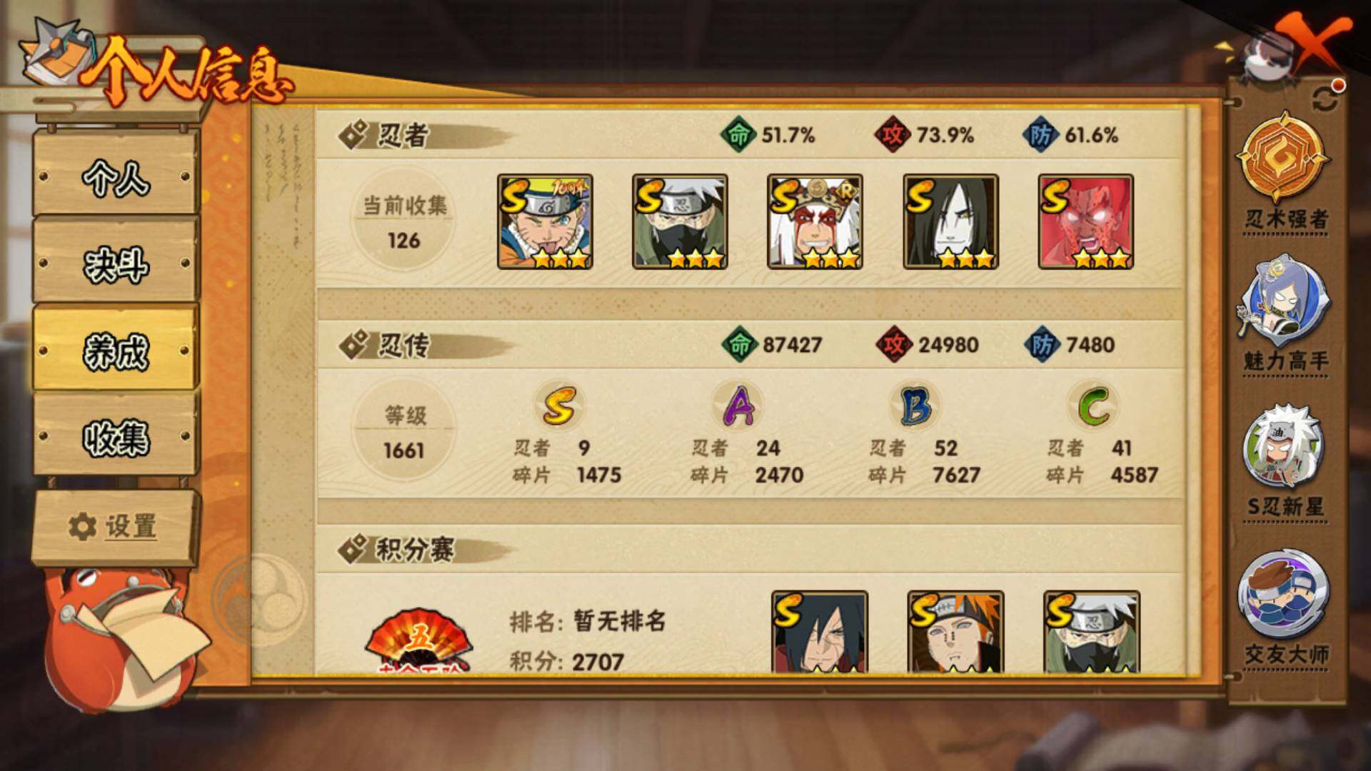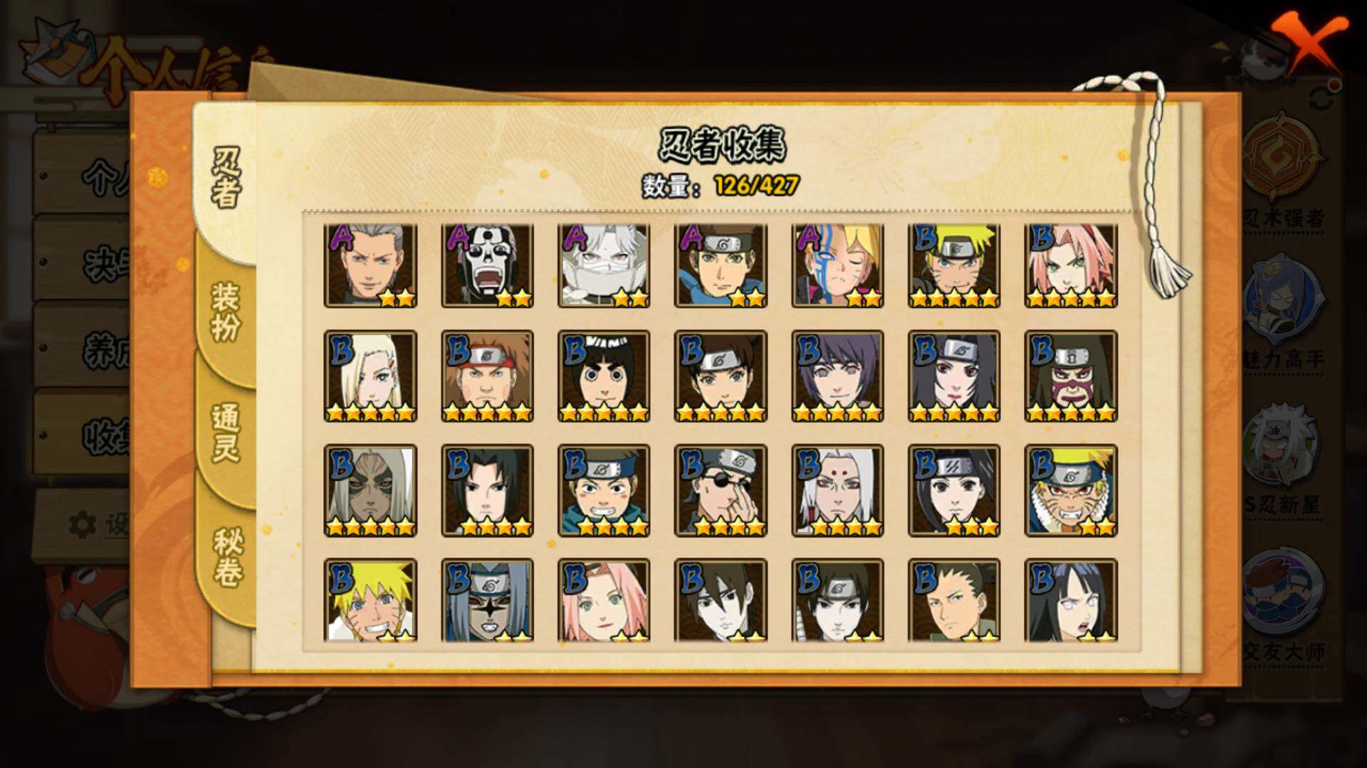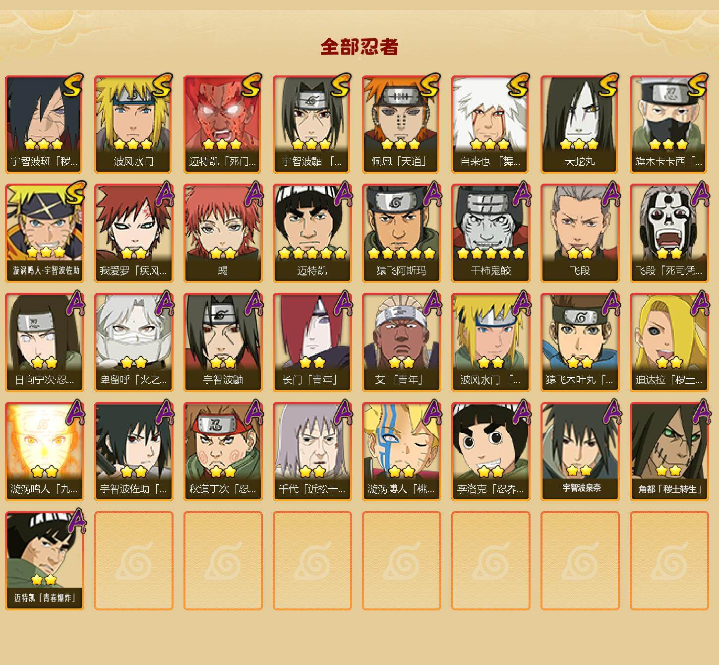 【S级忍者】:宇智波斑「秽土转生·解」(3星),宇智波鼬「须佐能乎」(3星),旗木卡卡西「须佐能乎」(3星),自来也「舞之豪杰」(3星),大蛇丸(3星),波风水门(3星),迈特凯「死门」(3星),佩恩「天道」(3星),漩