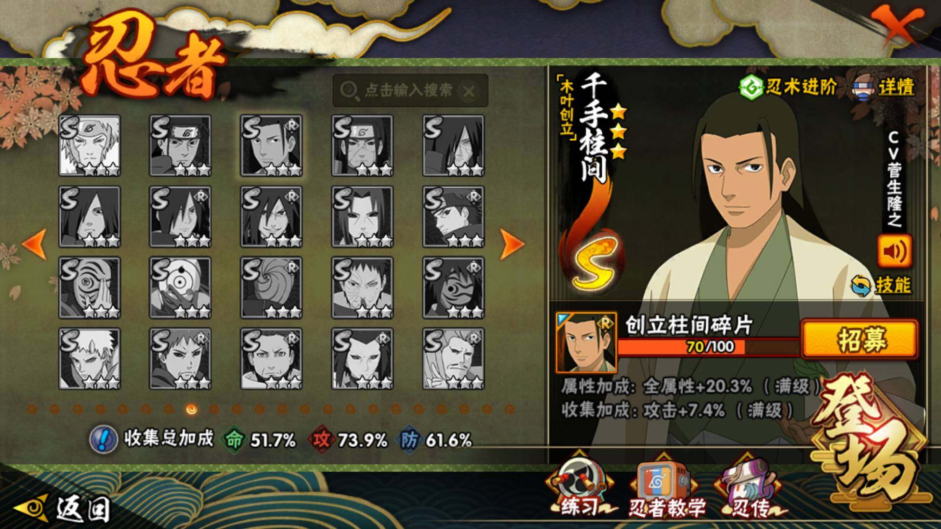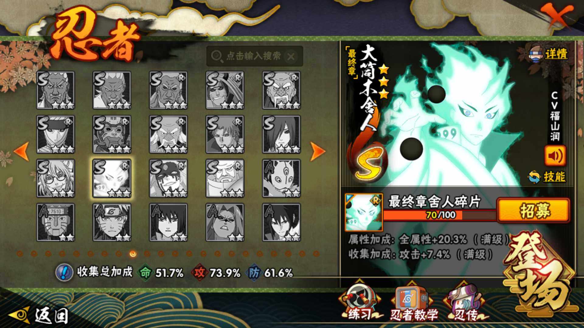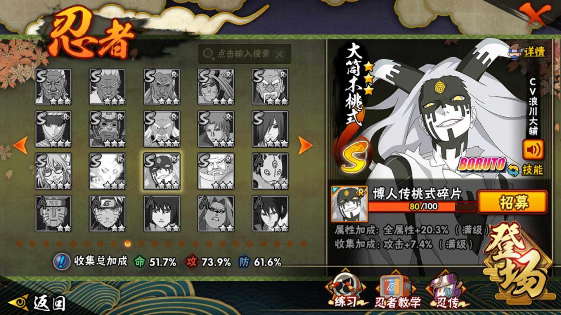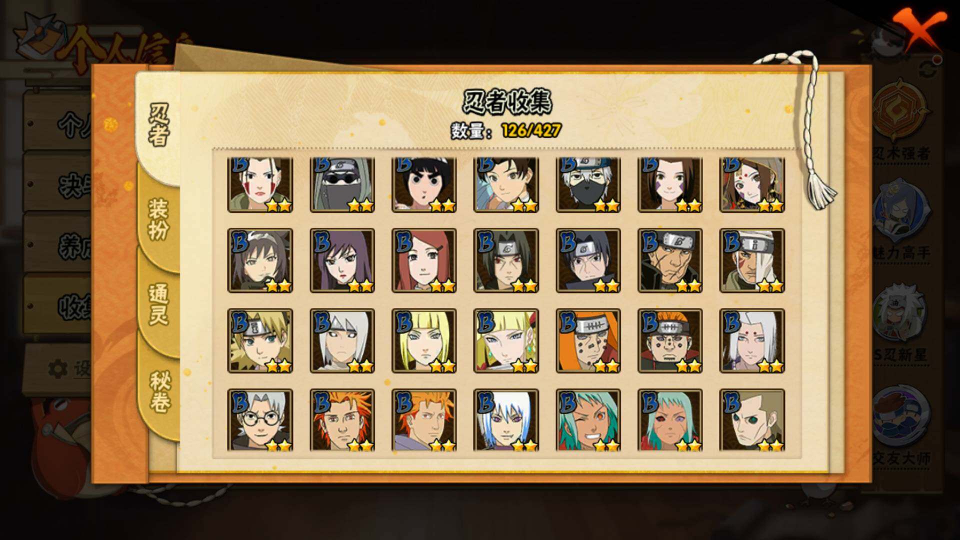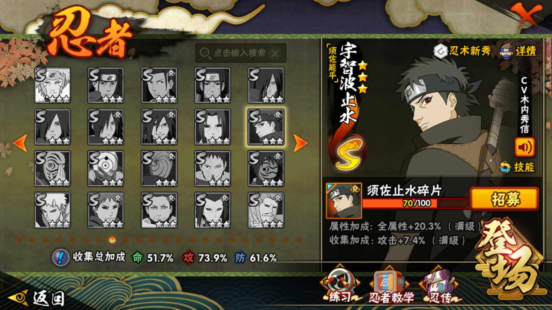 【S级忍者】:宇智波斑「秽土转生·解」(3星),宇智波鼬「须佐能乎」(3星),旗木卡卡西「须佐能乎」(3星),自来也「舞之豪杰」(3星),大蛇丸(3星),波风水门(3星),迈特凯「死门」(3星),佩恩「天道」(3星),漩
