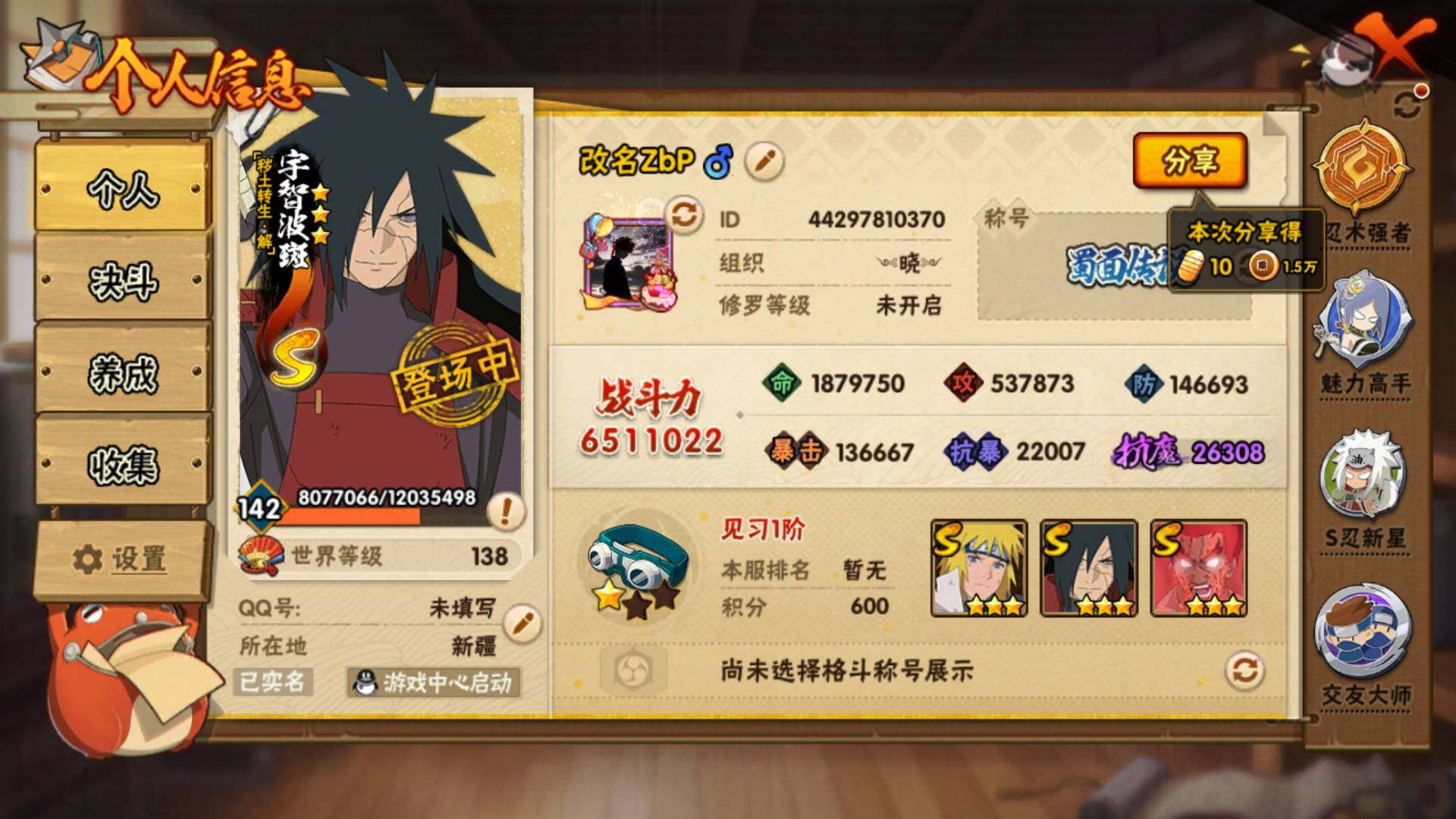(可免费转苹果)v6,651w战力,9S级忍者数-24A级忍者数,1.3w金币,32高招券,创立柱间70片,止水70片,最终章70片,桃式80片,传说自来也46片。ME2142