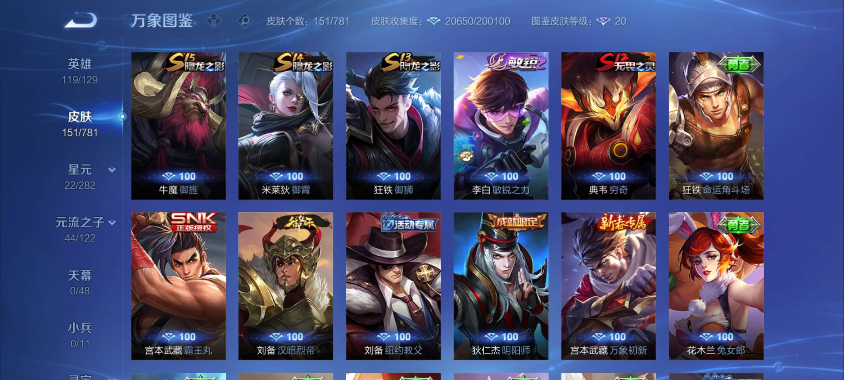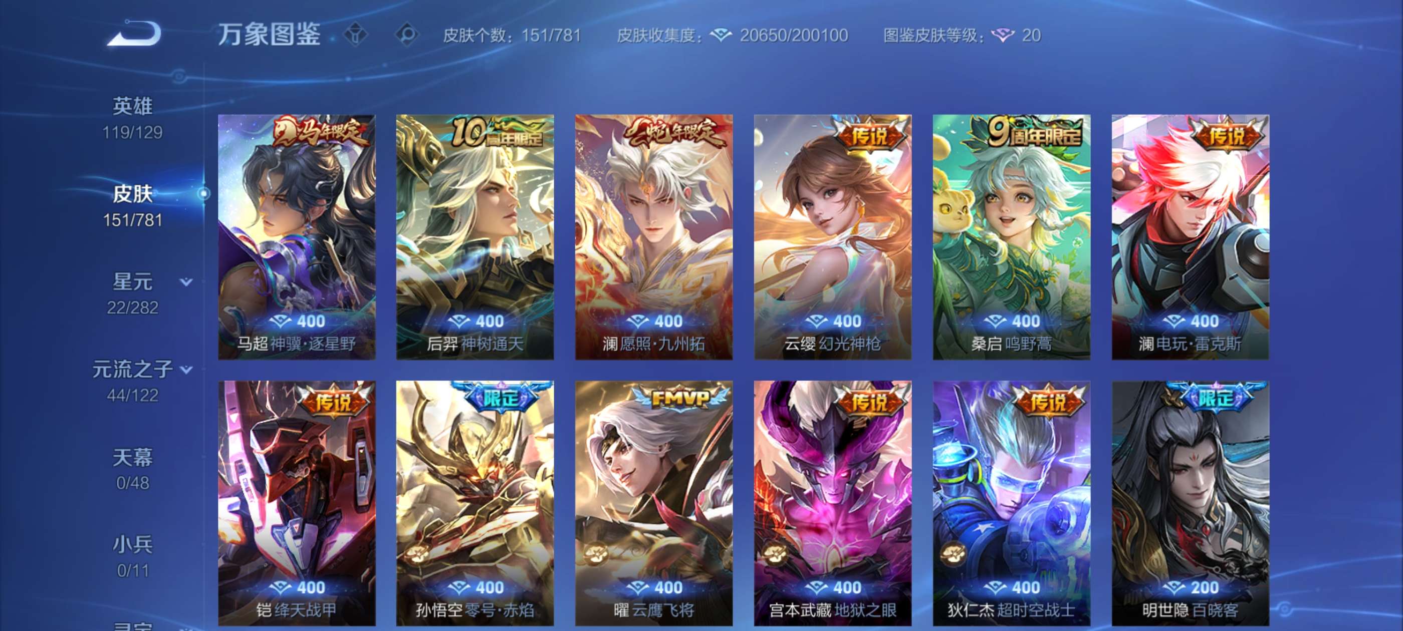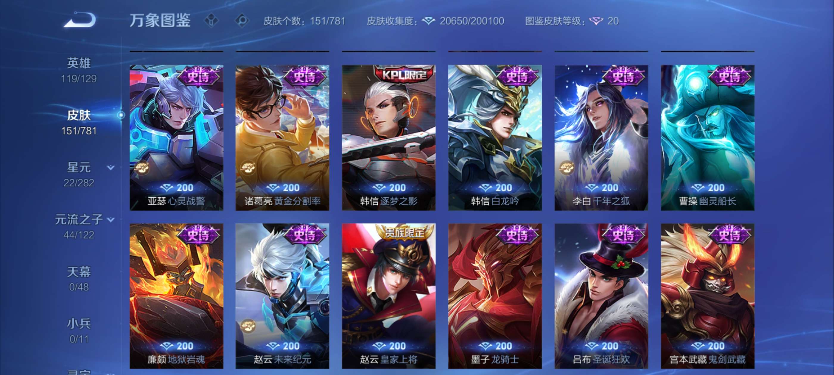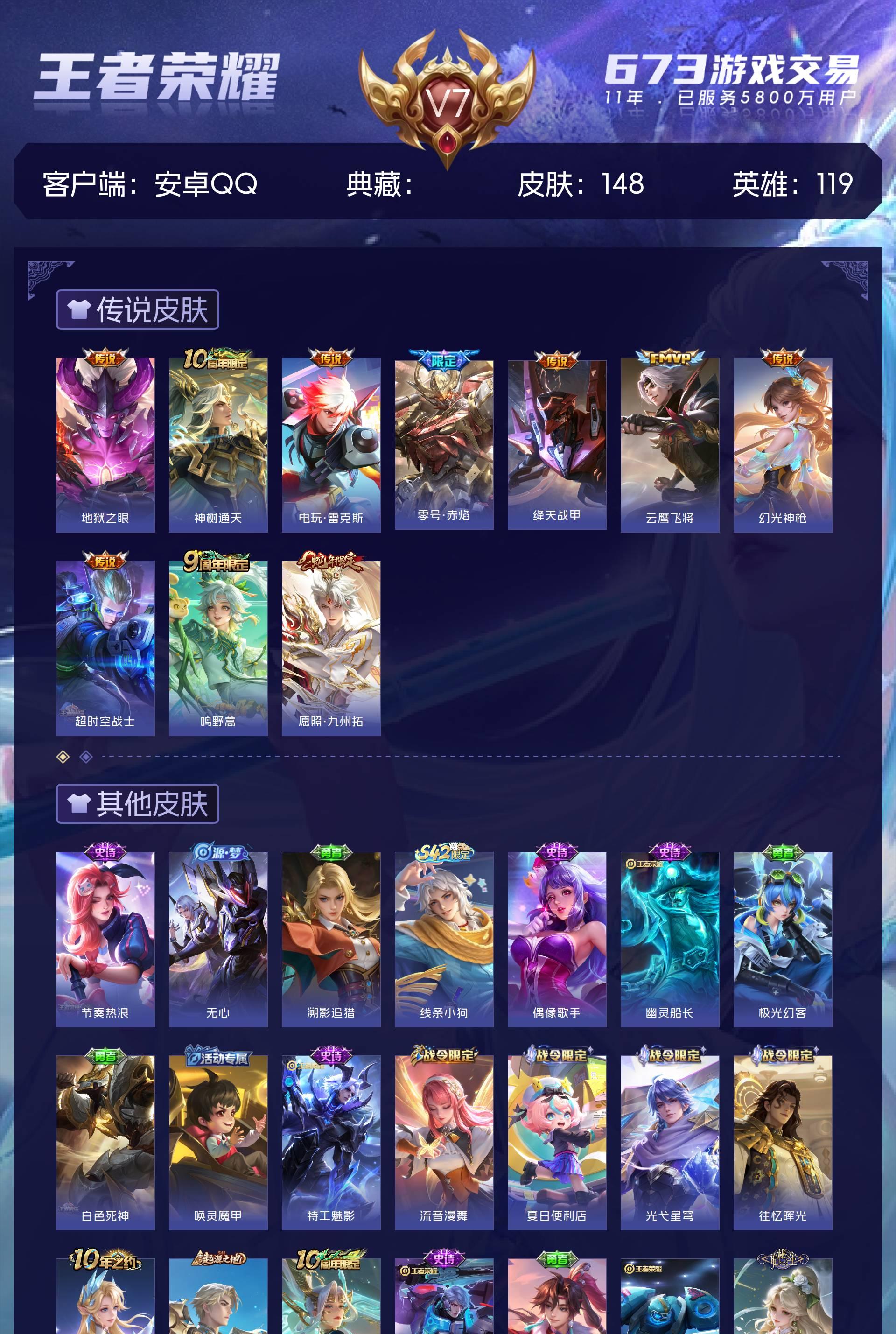 V7 皮肤148 英雄119 永恒钻石 星传说1 传说10 其他皮肤143