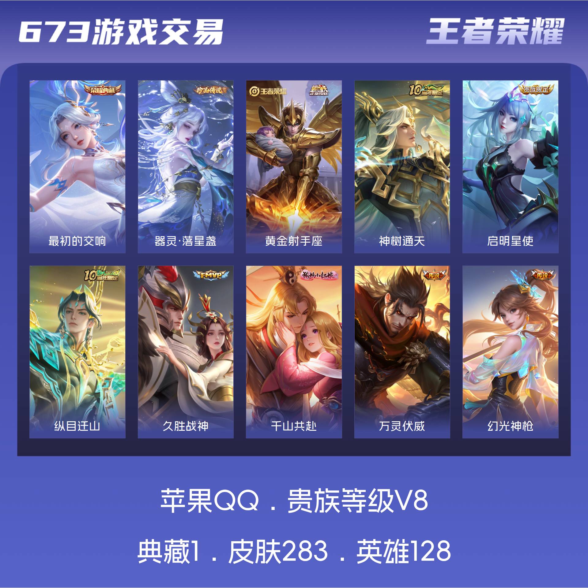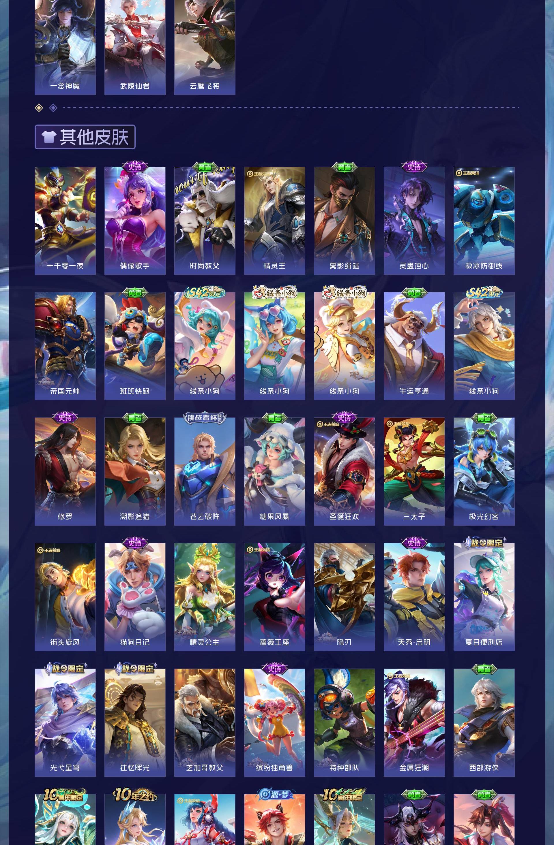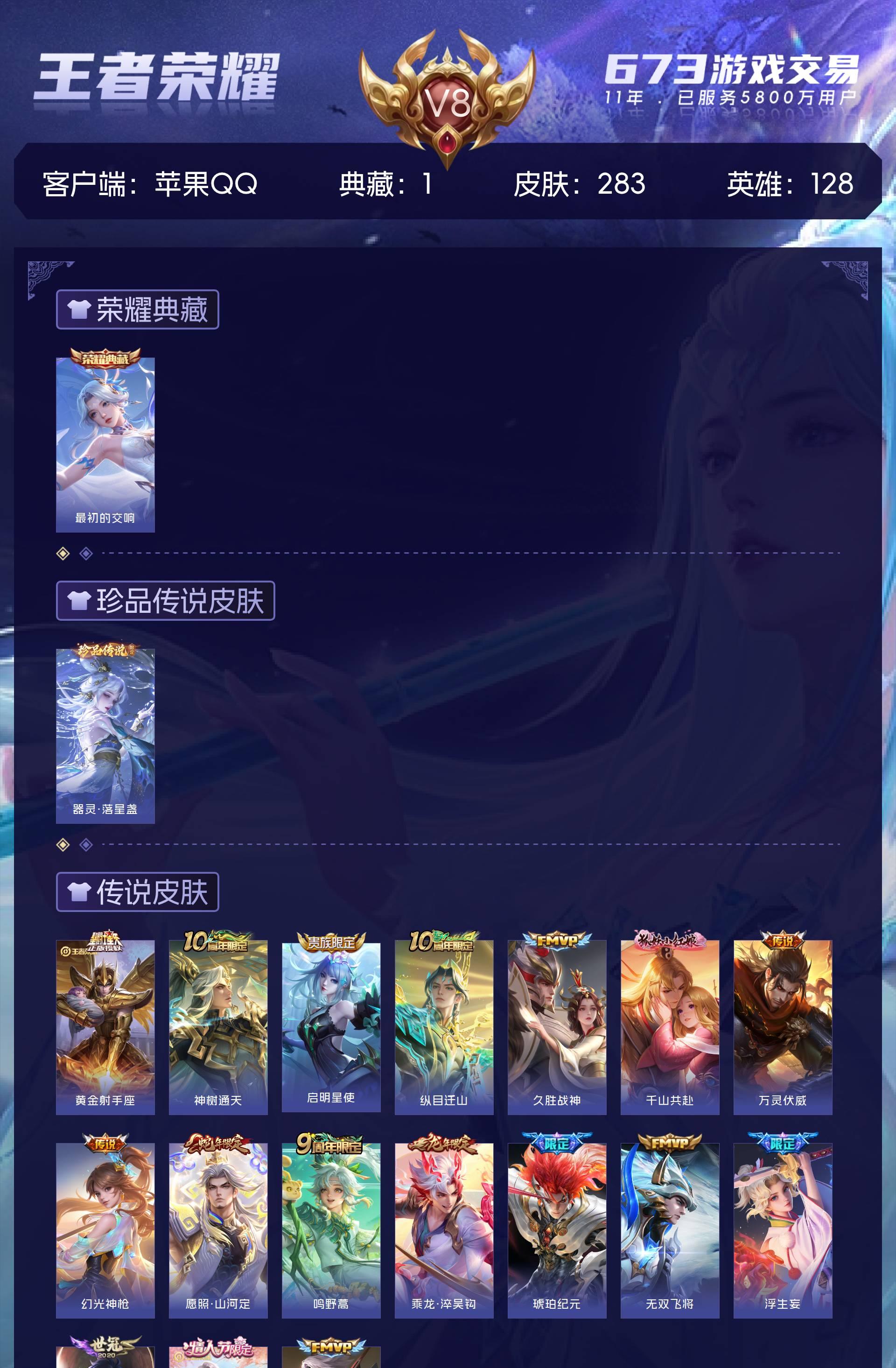 V8 皮肤283 英雄128 最强王者 荣耀典藏1 珍品传说1 传说17 其他皮肤264