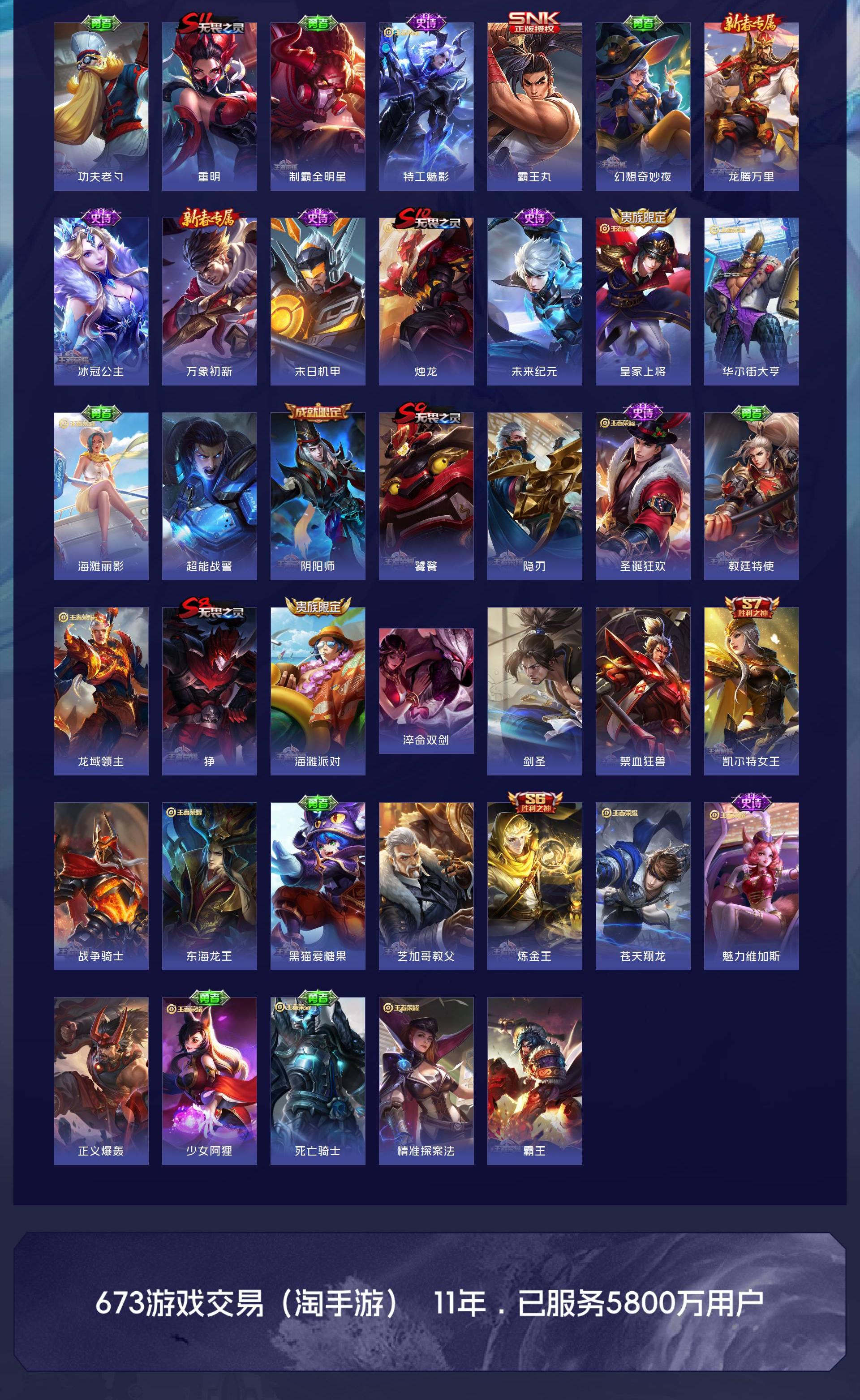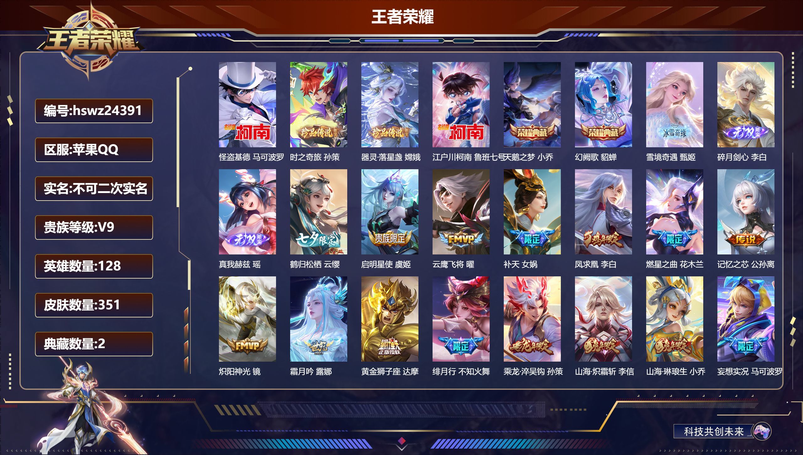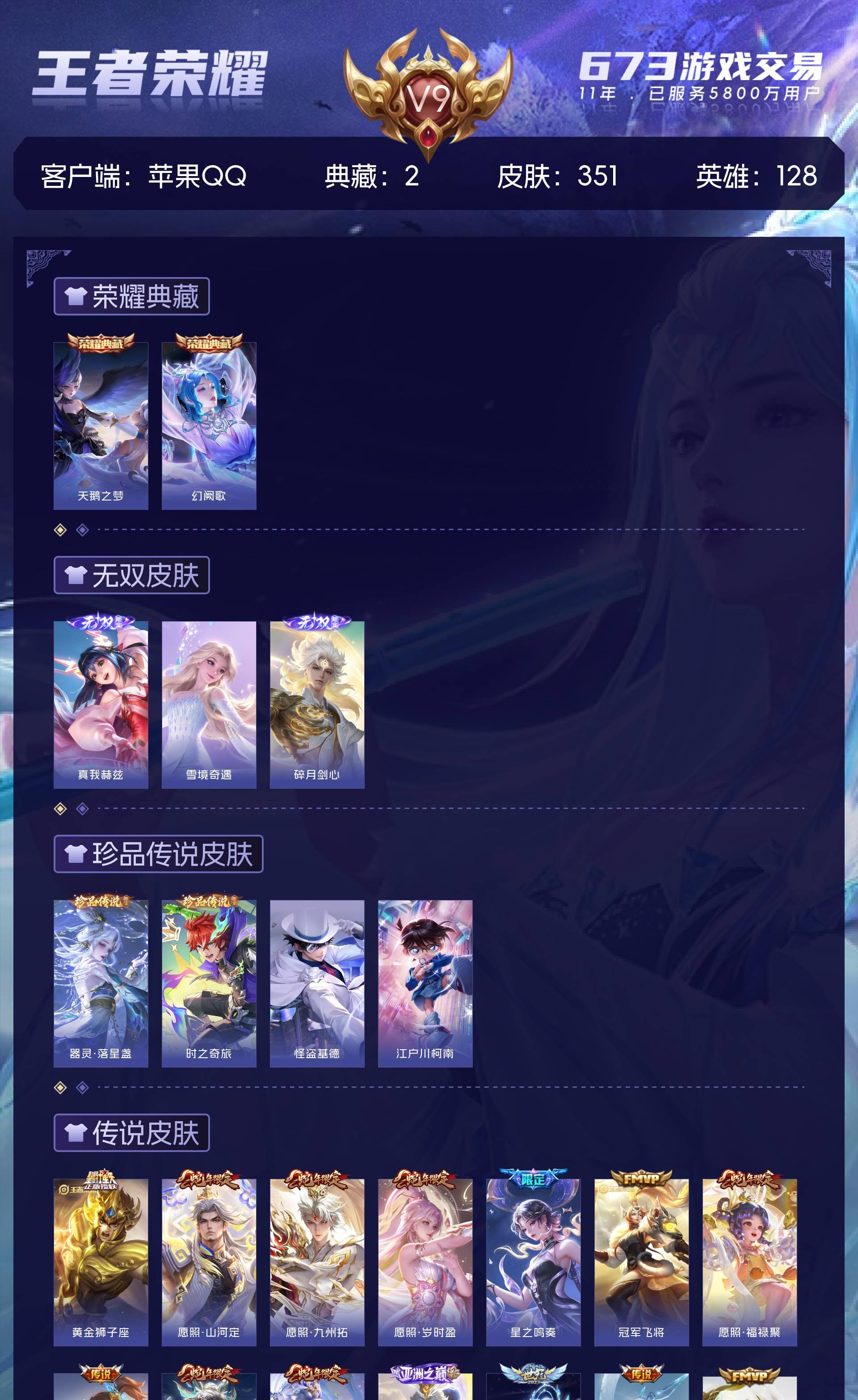 苹果QQ/绝世王者/351皮肤/128英雄/2典藏/0珍品无双/3无双/4珍品传说/28传说/96史