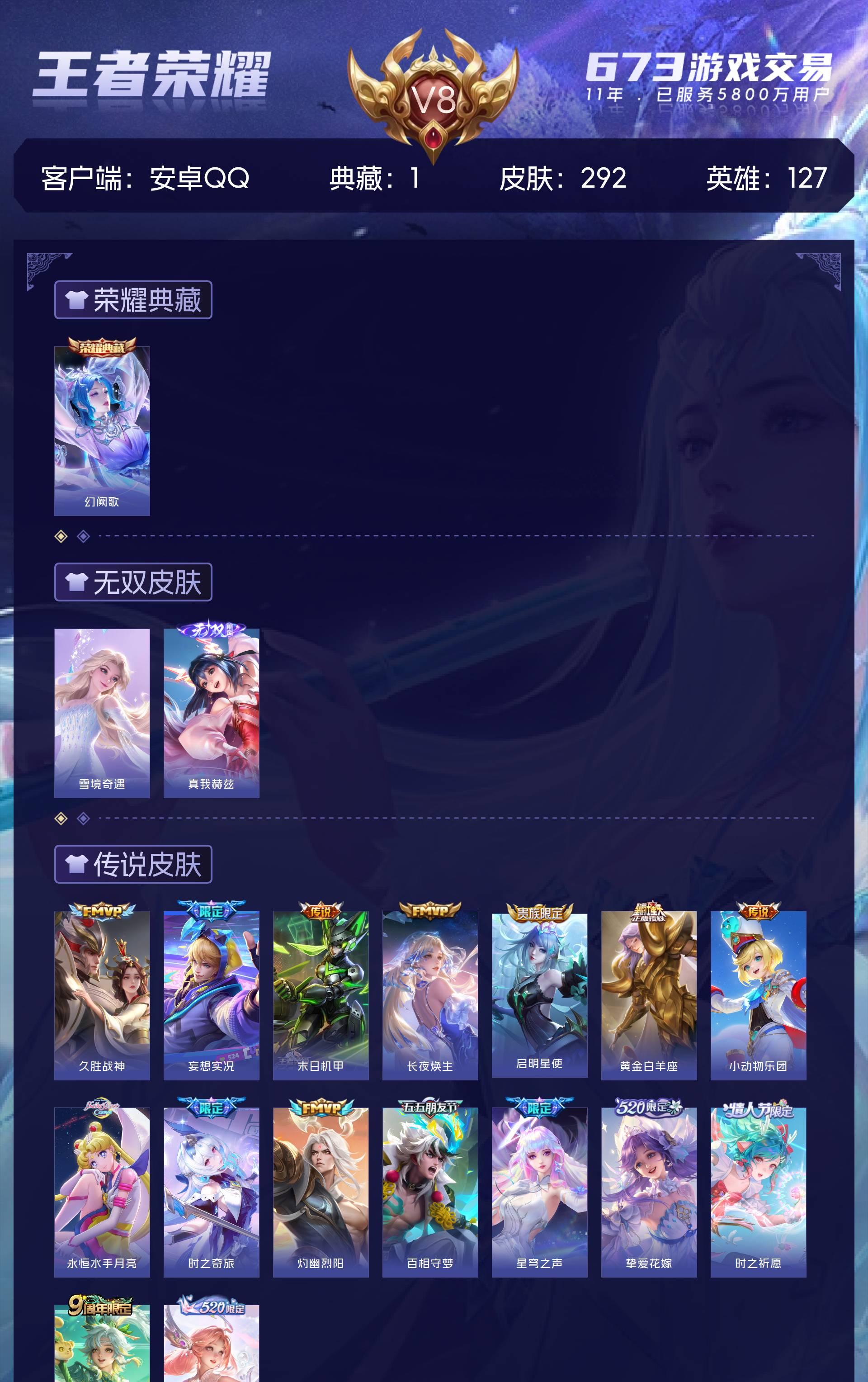 安卓QQ/最强王者/292皮肤/127英雄/1典藏/0珍品无双/2无双/0珍品传说/16传说/98史