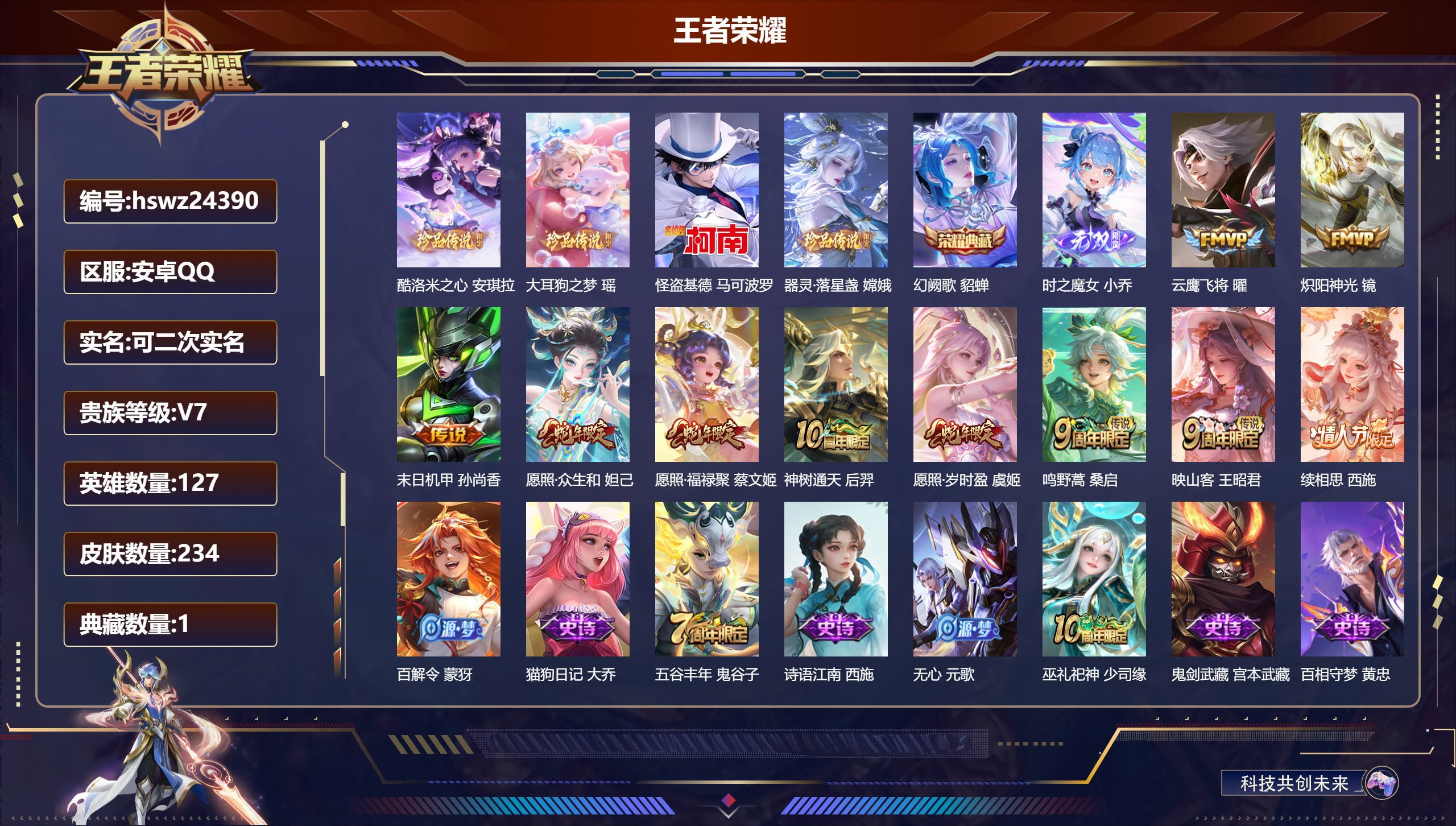 安卓QQ/至尊星耀/234皮肤/127英雄/1典藏/0珍品无双/1无双/4珍品传说/10传说/63史