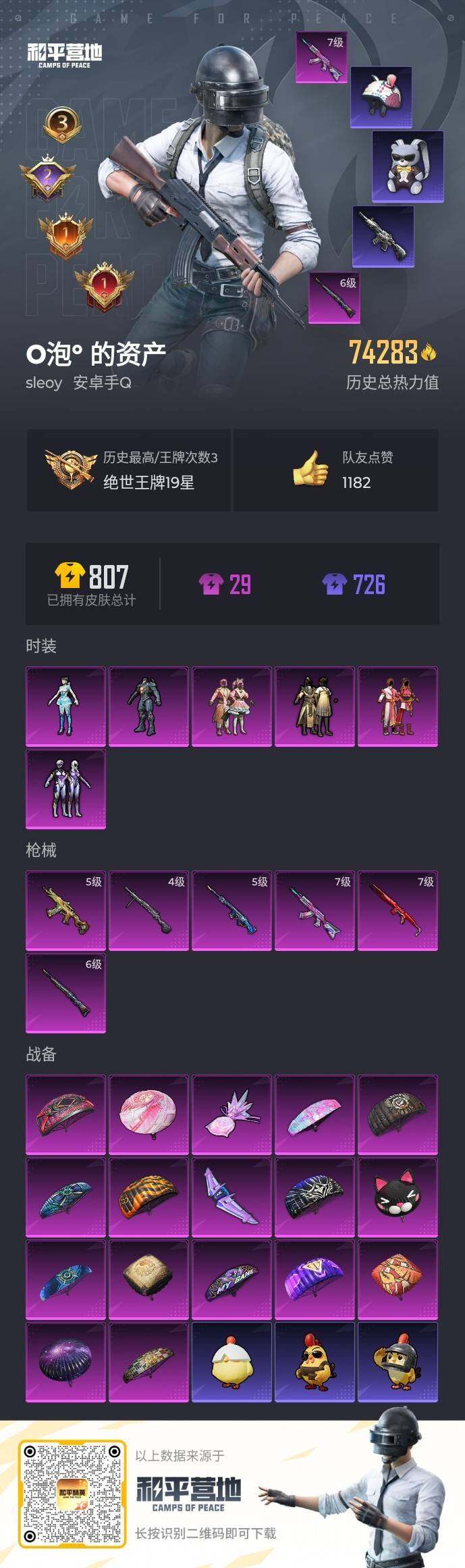 安卓 手Q-6粉装-6特效枪-0载具-2粉色飞行器-74283热力值-3王牌印记-179套装-220枪皮