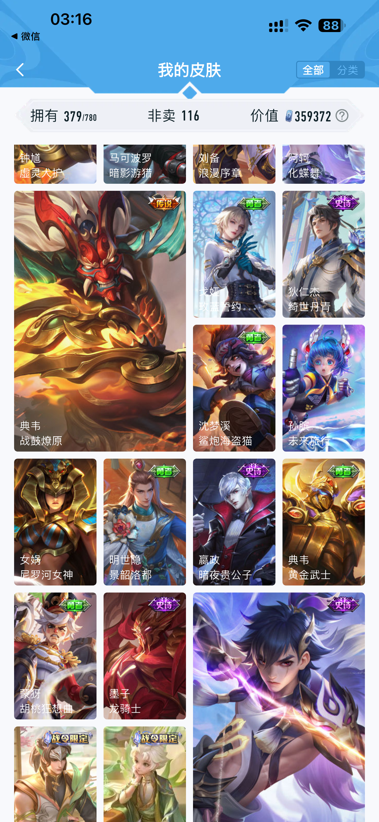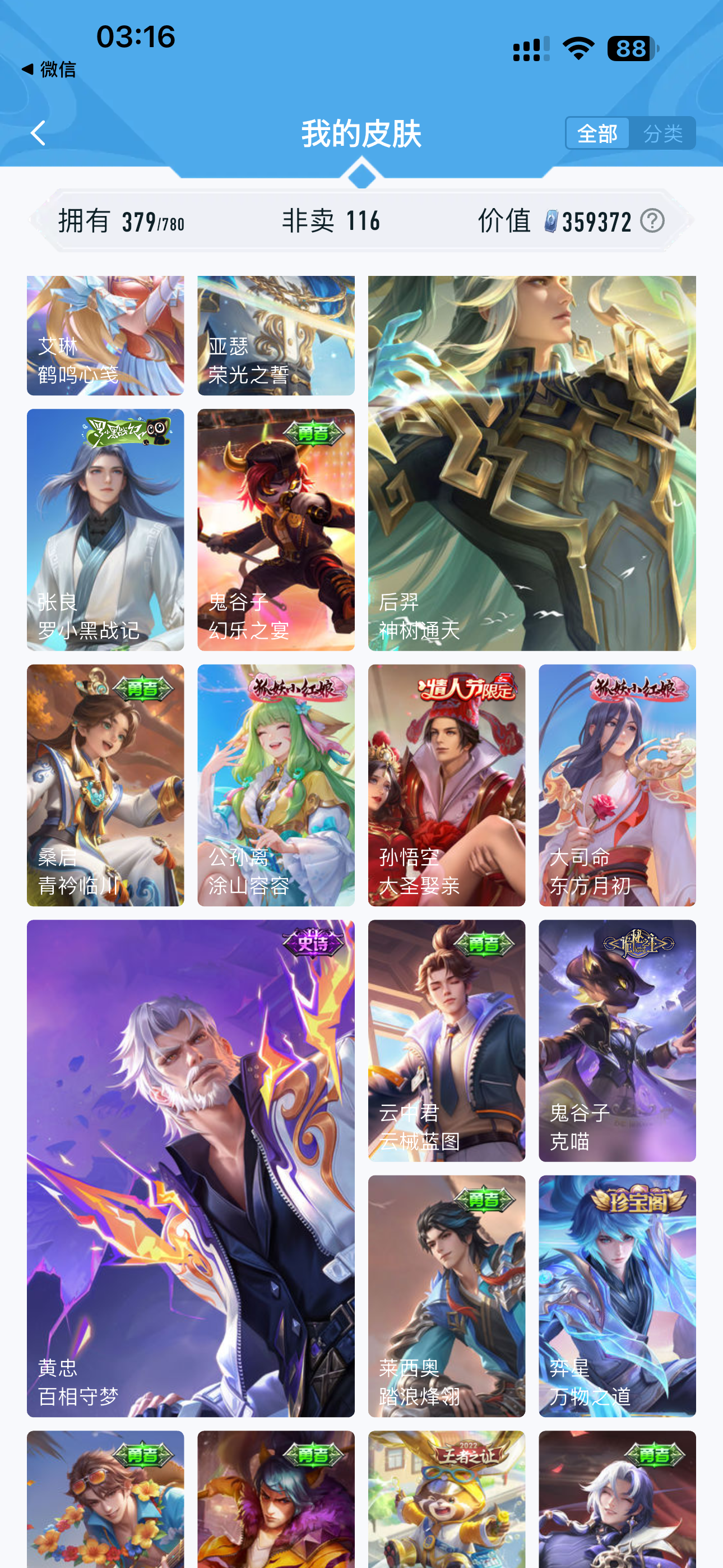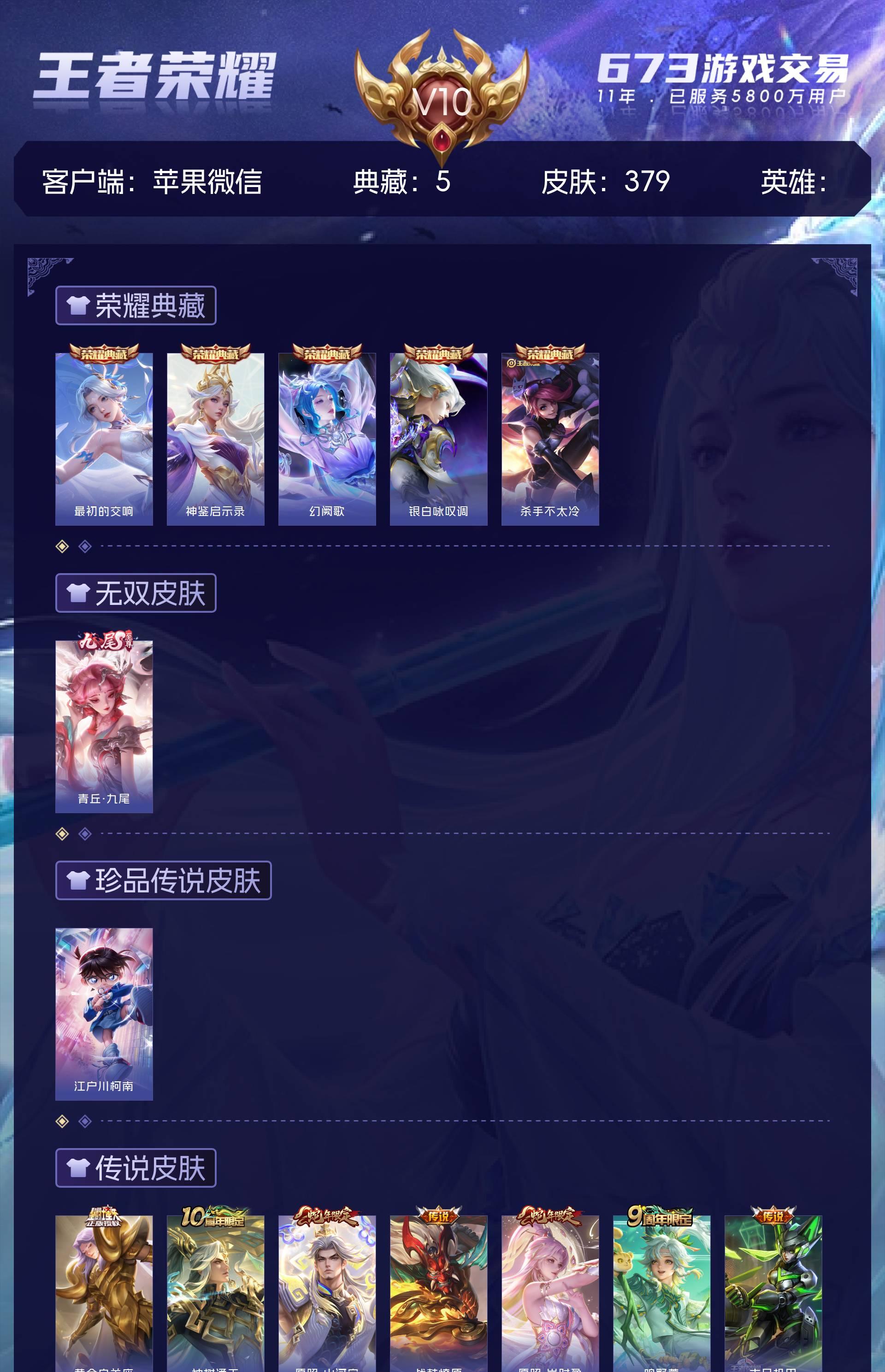 V10 皮肤379 至圣王者 荣耀典藏5 无双皮肤1 珍品传说1 星传说2 传说31 其他皮肤342